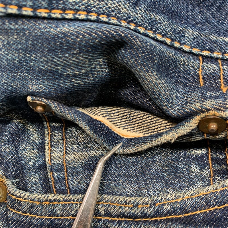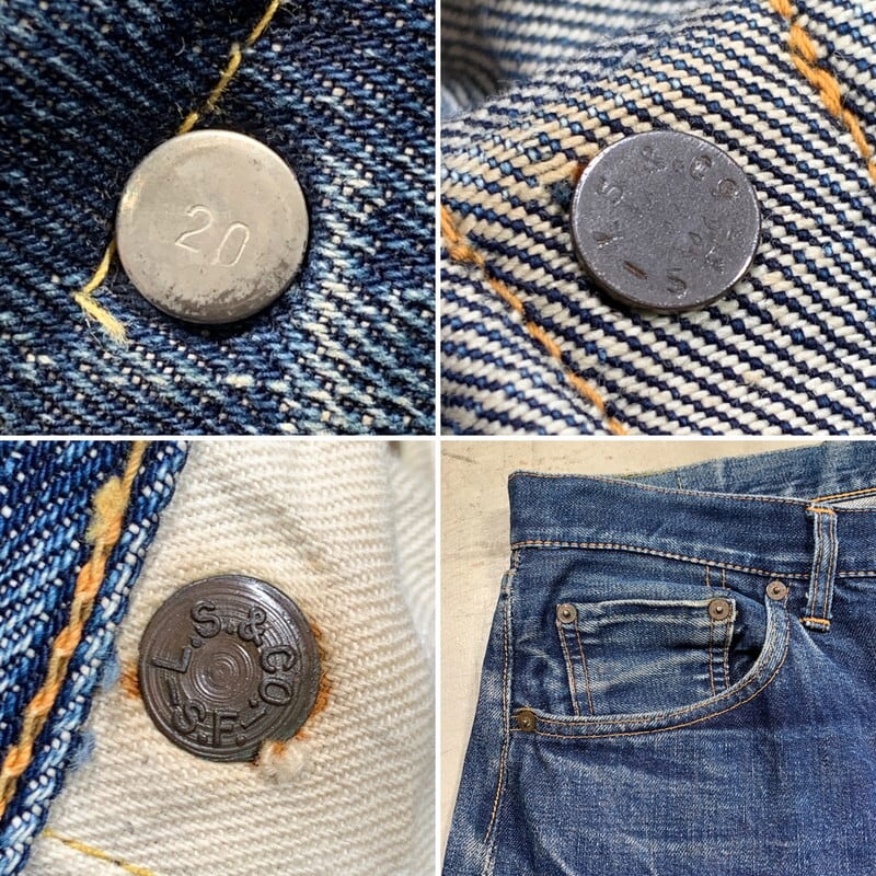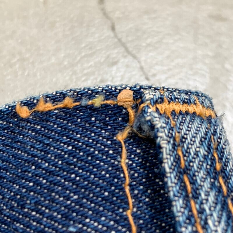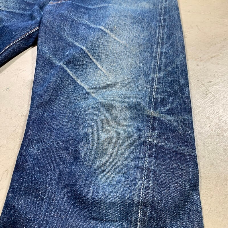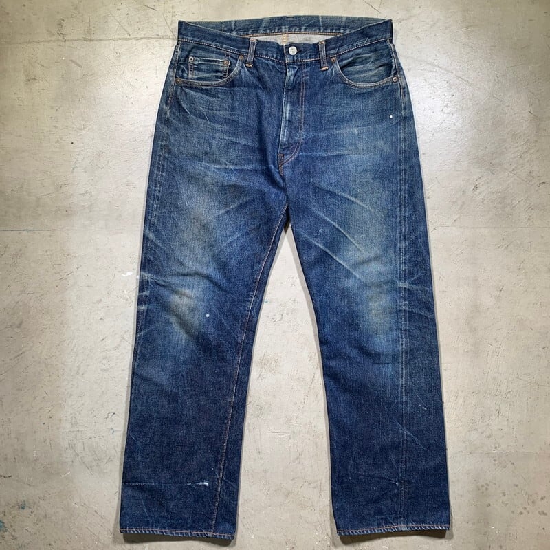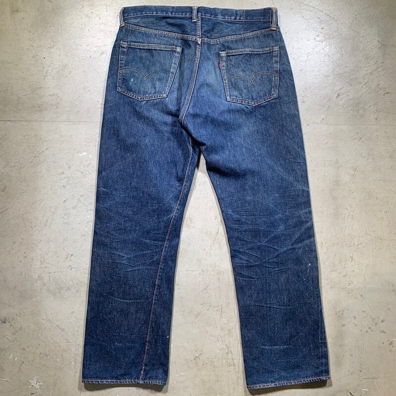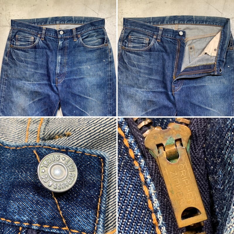 50年代から60年代のLEVI'S501ZXXデニムパンツです。1954年に501のジッパーフライバージョンとして発売されたモデルです。トップボタンシルバー、ボタン裏20、Vステッチ、GRIPPERのカムロックジッパー、コインポケット裏セルヴィッジ、鉄製リベット、隠しリベット、隠しリベット刻印ドット、オフセット、両面赤タブBig E。パッチは欠損していますが、ステッチ右上に微かに紙パッチが残っていますので、ギャラ入り期のモデルです。濃淡がしっかりとついた素晴らしいエイジングで、ヒゲや膝裏のハチノスも確認できます。サイドシームにはセルヴィッジのアタリも入り、これぞヴィンテージという雰囲気です。裾から10cm程の箇所にロールアップ跡のダメージが若干見られ、裾等一部ステッチ飛び(左裾に1カ所ハンドリペア有)はございますが、奇跡的にもタタキリペアの無い極上個体です。ポケットスレーキもダメージ無く良好です。色残りも十分ですので、これからのエイジングもしっかり堪能できます。ウエストは実寸W36インチと、ゴールデンサイズです。値上がりの止まらないヴィンテージリーバイスですが、今後さらに入手困難になると思われますので、お探しだった方は是非この機会をお見逃しなく!