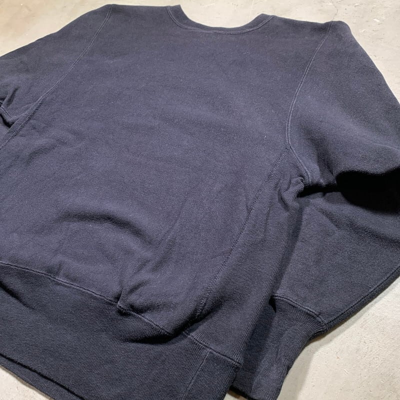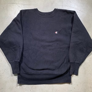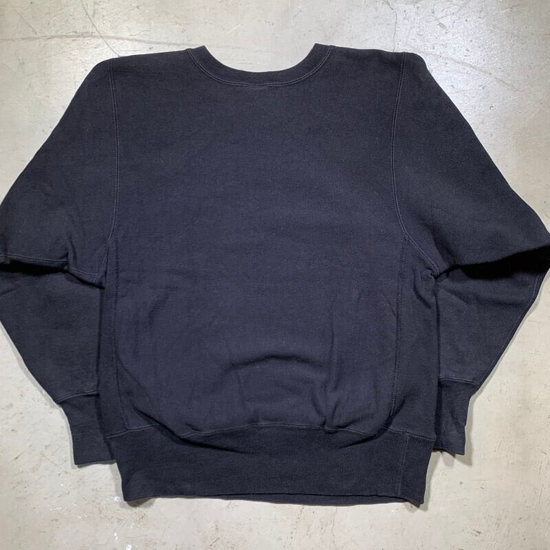 90年代頃のChampionリバースウィーブスウェットシャツです。定番の目付きモデル。1934年に誕生したリバースウィーブは現在もそのデザインはほとんど変わることなく現在でも非常に人気の高いアイテムとなっています。90年代の刺繍タグが付くUSA製です。人気の高いブラックカラーです。若干の色褪せはあるものの、ダメージや汚れのほとんど無いグッドコンディションです。サイズはMEDIUMですので、女性も着やすいサイズ感です。シンプルなデザインですが、コーディネートを選ばず使える万能スウェットです。年々価格高騰しており、状態の良い物は入手しづらくなっています。特にブラックは人気も高い為、お探しだった方は是非この機会にいかがでしょうか。
