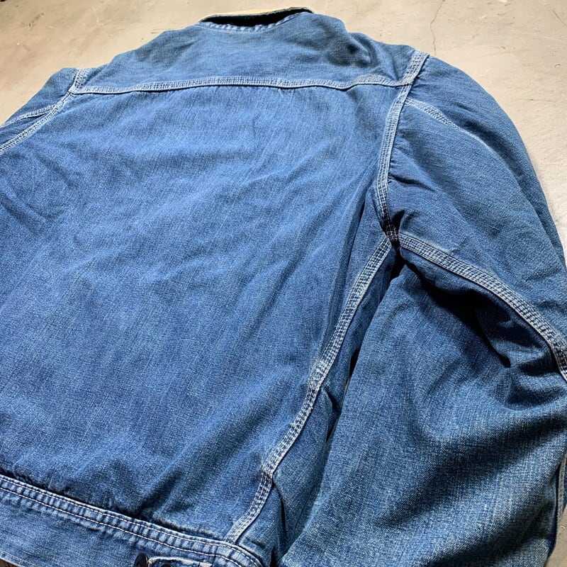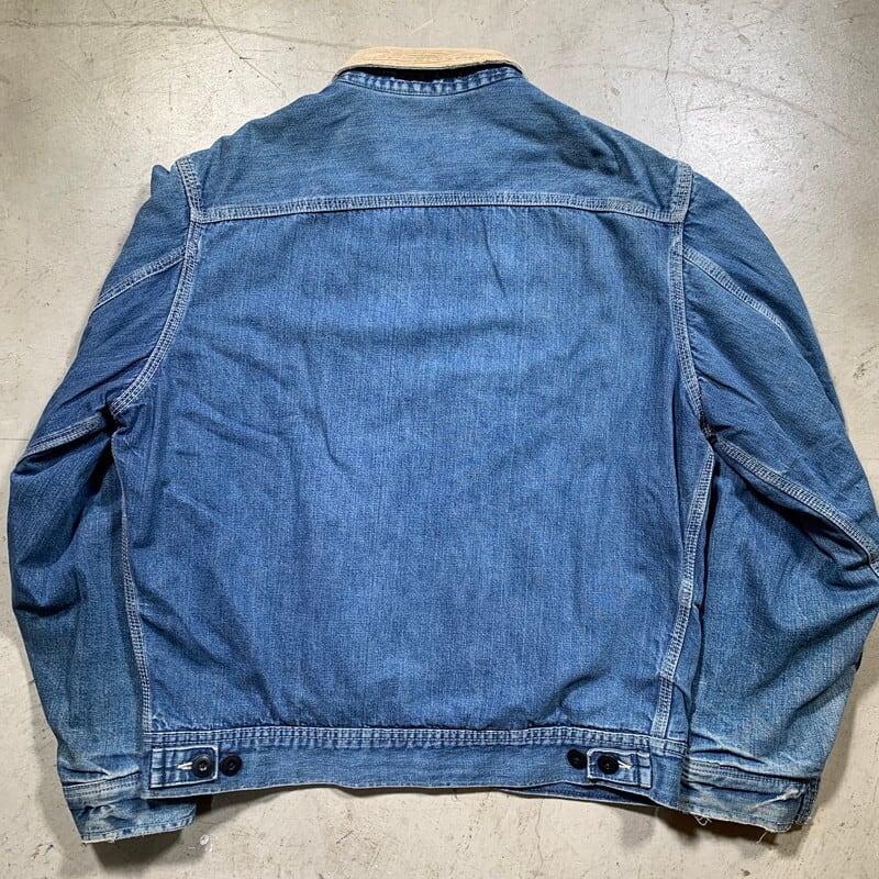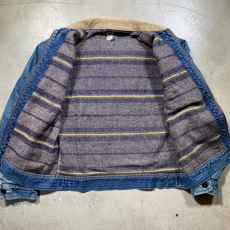 60年代後半から70年代初頭頃のLee191-LBブランケットライナーデニムワークジャケットです。91-Bにブランケットライナーが付くモデルです。デニムのボディにコーデュロイ襟、斜めに配置された胸のジッパー、ハンドウォーマーポケットと長きに渡り愛され続けているLeeの定番アイテムです。タグ、ピスネーム共®MR表記有り。フロントはブラスの棒TALONです。左ポケット内側にユニオンチケットがっしっかりと残っています。猫目ではありませんが同じ型のボタンがすべて揃っています。取り換えれた形跡はありません。ブランケットライナーにいくつかダメージがございます。袖先には生地の擦り切れも見られますが、ワークウェアらしい表情で面の良い1着です。最近じわじわと91-Bやこの191-LBの人気も高くなり価格も上がり始めています。需要の高いsize40ですので、お探しの方も多いのではないでしょうか。ライトアウター感覚で着やすいデザインなのでオススメです。