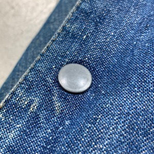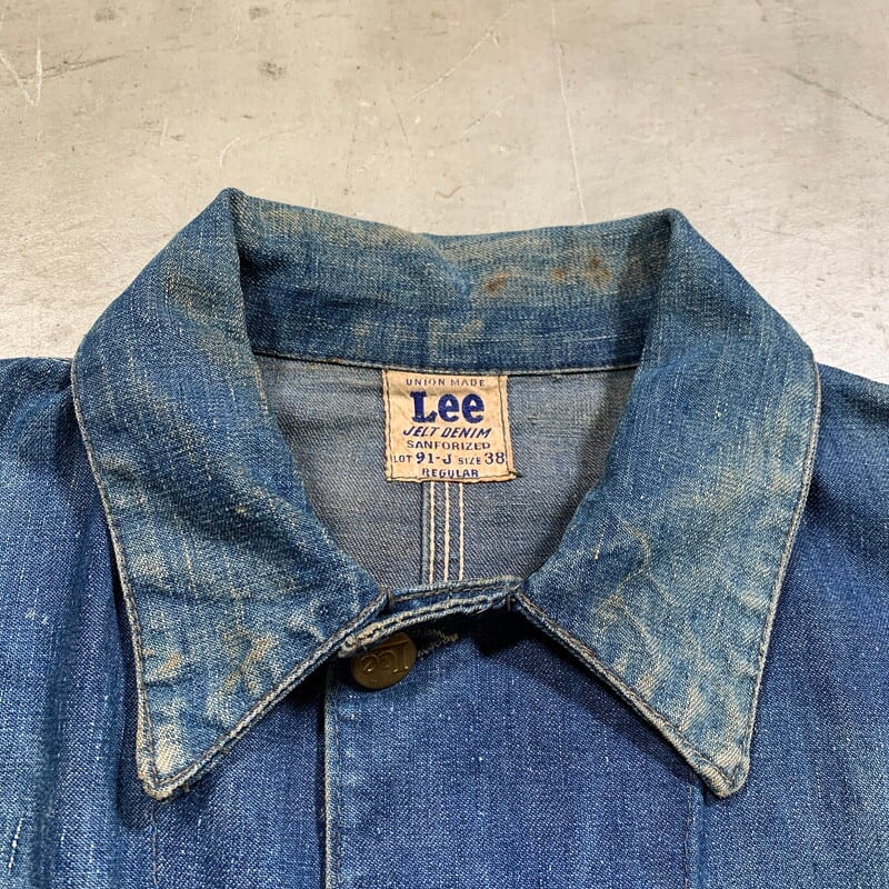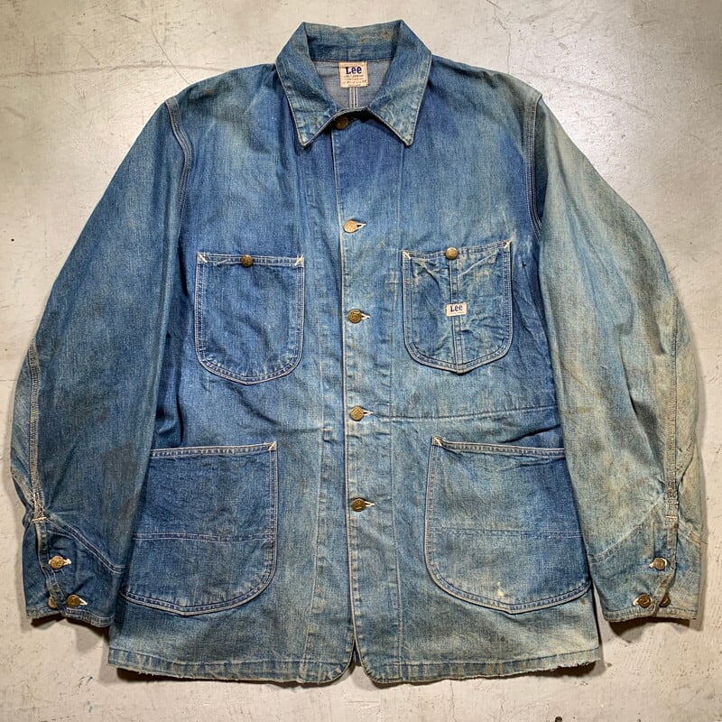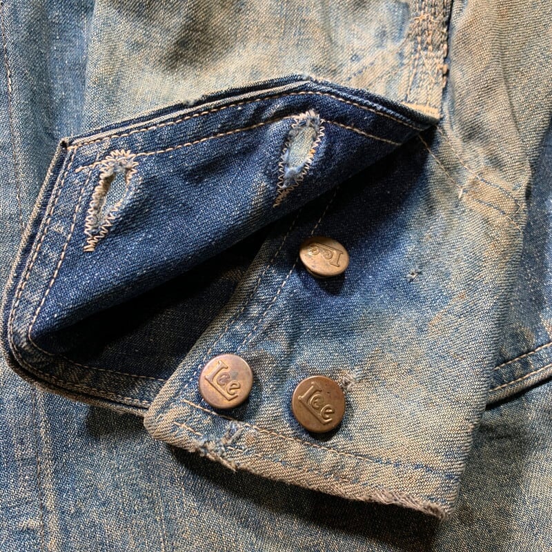 40年代最終期から50年代初頭頃のLee1-Jデニムカバーオールです。40年代後半まで使われていたハウスマークタグが廃止された直後あたりのモデルです。タグのeが傾斜では無く平行へと変更されていますがボタンはロングLで傾斜eのデザインが使われています。右ポケットにユニオンチケットが縫い付けられており、ポケット内の当て布は30年代頃のモデルでも見られる古いストライプの生地が使用されています。胸ポケット以外がすべて首振りボタンでカタカタと心地よい音が楽しめます。画像の通り凄まじいフェードで、薄汚れも相まってヴィンテージ色がさらに強調された素晴らしい1着です。袖にピンホールや脇付近に1cm程のダメージが見られ、裾に生地の擦り切れがございます。汚れも全体に見られますが、生地はしっかりとしておりワークウェアがお好きな方にはかなり刺さる雰囲気ではないでしょうか。91-Jはサイズが大きい物が多く着丈がかなり長い印象ですが、こちらはゴールデンサイズの38表記です。状態の良い綺麗な物はもちろん希少ですが、グッドサイズで唯一無二なアートピース性を兼ね備えた個体も探してなかなか見つかるものではありませんので、ヴィンテージワークスタイルがお好きな方には是非手に取っていただきたいアイテムです。