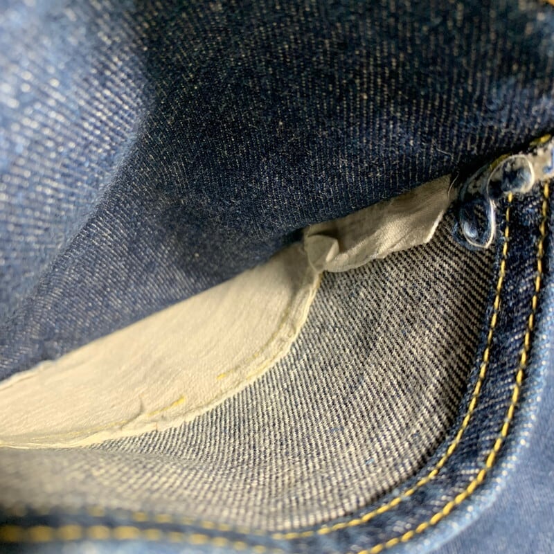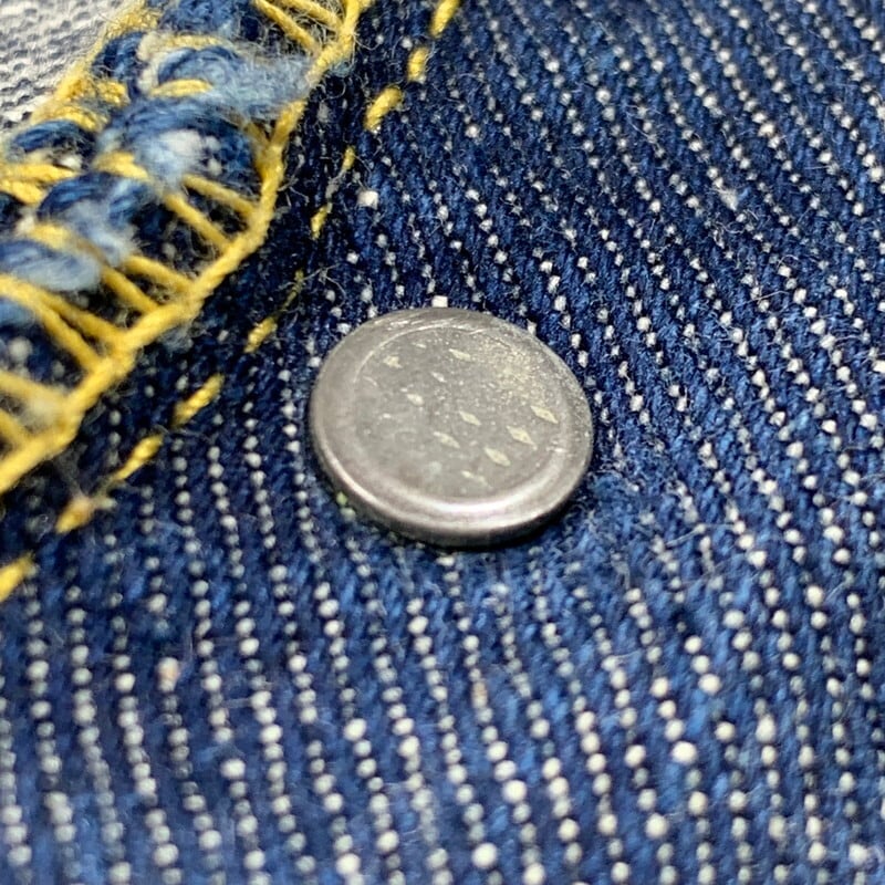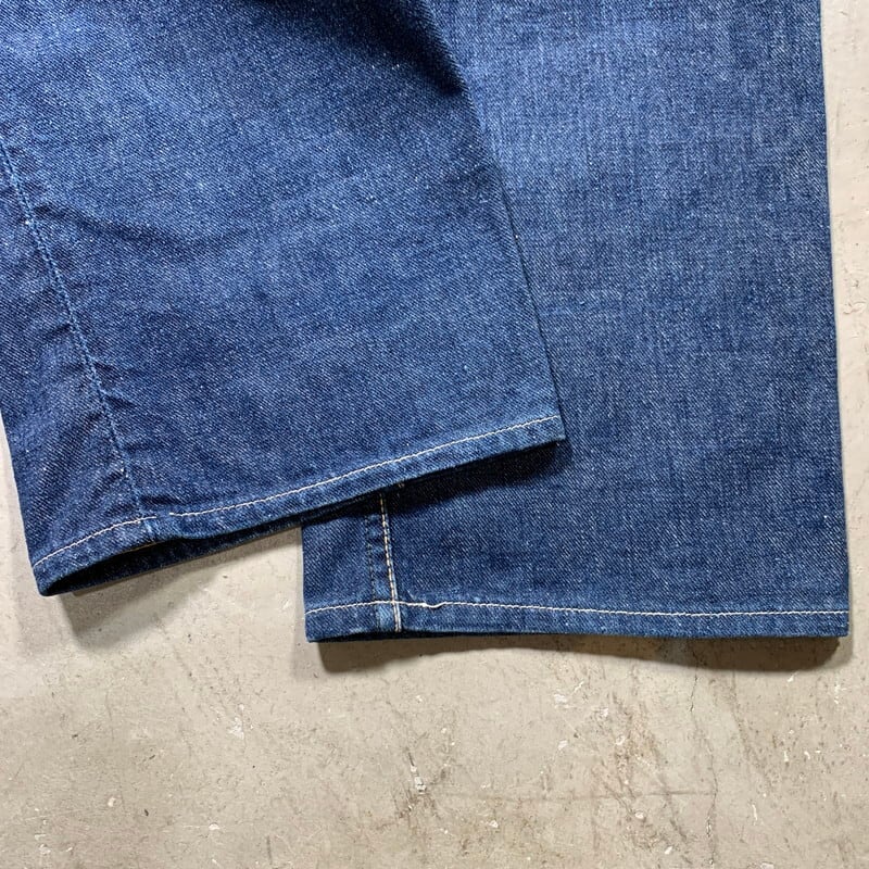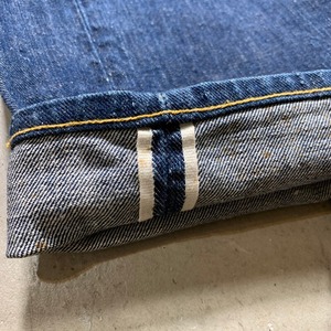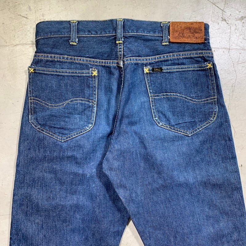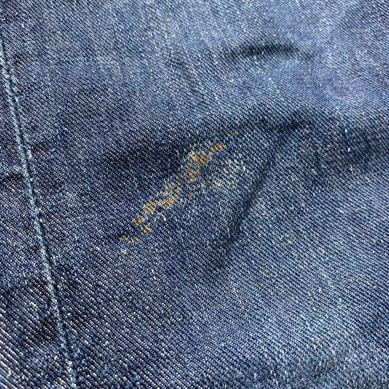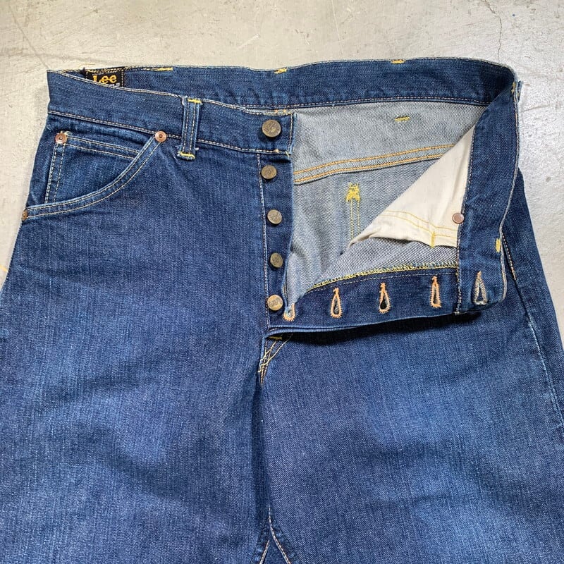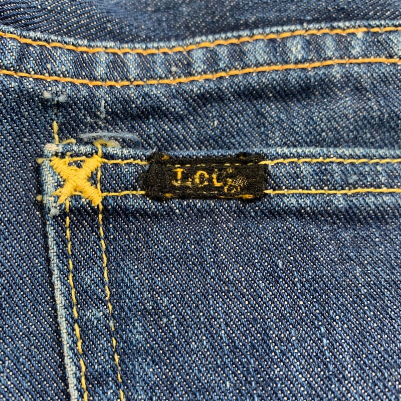 50年代後半頃のLee101Bデニムパンツです。101Zのジッパーフライに比べ珠数の少ない希少なボタンフライモデルです。センター黒タグからサイドに切り替わった直後の黒タグで、内タグ革パッチは®MR無し、ピスネームMR無。バックポケット内側に当て布とユニオンチケットがございます。トップ裏はF刻印、フライ裏はドット刻印です。アウトシームには両耳のセルヴィッジが付く嬉しい仕様です。8割近く色残りもあり、これからの経年変化も存分に楽しんでいただけます。右膝に錆のようなシミが見られ、両膝共若干の色落ちがございます。裾内側にも薄いシミが見られます。革パッチのステッチが一部ほどけています。バックポケットも一部ステッチのほつけがございます。レングスはチェーンステッチで裾上げがされています。生地もしっかりとしており、リペアやダメージの無い極上個体です。ウエストは約W33インチとゴールデンサイズです。リーバイスの501XXの紙パッチギャラ入りと同年代のモデルと考えると非常に希少です。リーバイス同様にLeeのヴィンテージデニムも年々希少価値が高くなり、状態の良い個体はかなり見つかりづらくなっています。サイズがドンピシャな方は是非この機会にコレクションに加えてみてはいかがでしょうか。
