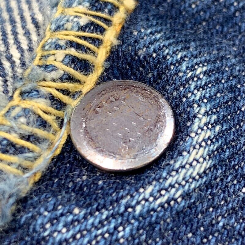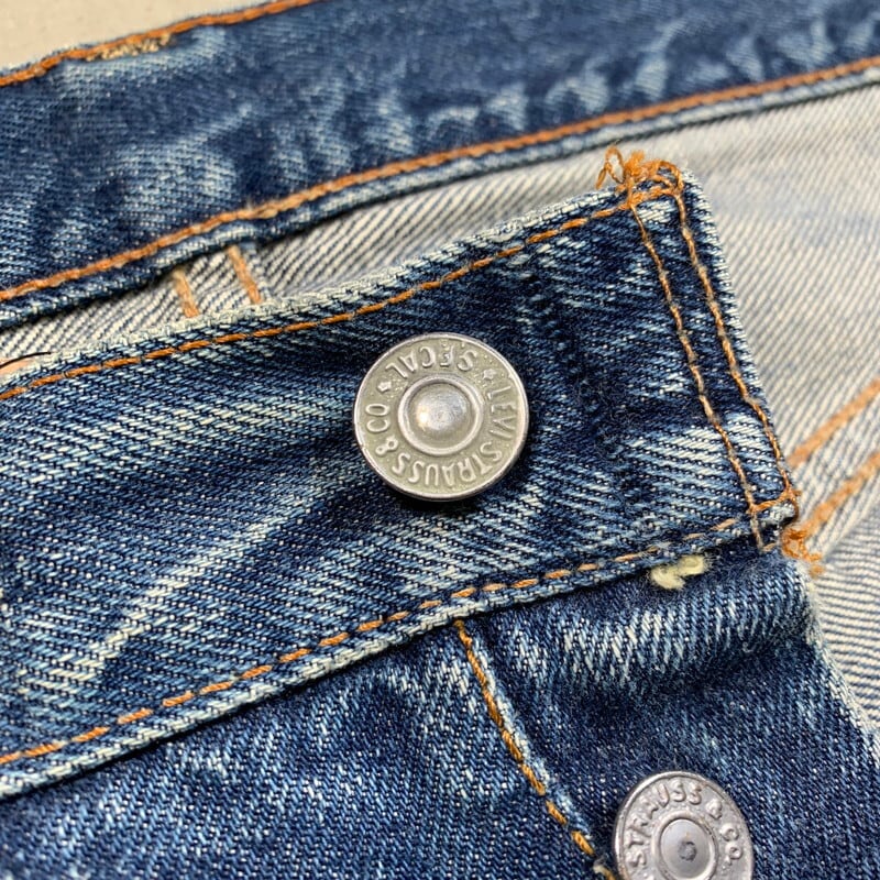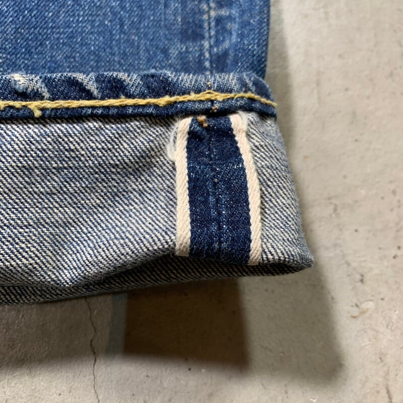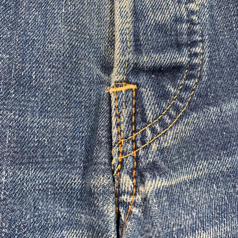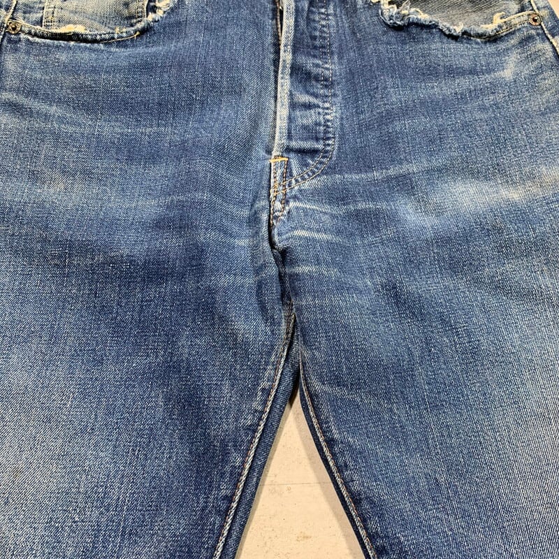 60年代から70年代頃のLEVI'S 501デニムBig Eモデルです。トップボタン裏刻印6、平行ステッチ、フライボタン足長R、ウォッチポケットチェーン、ズレカン、セルヴィッジ裏両面シングル、バックポケット裏シングル、Big E、不均等V。バランス良く色落ちした個体ですが、ポケットと膝、サイドやバック腿付け根、スレーキ等にダメージやリペアが施されています。紙パッチも下部のステッチがほどけています。フカフカとした印象の紙パッチで、タイプ物の可能性もありますが、印字がほとんど消えかけている為詳細は不明です。ダメージや簡易的なリペア等ございますが、フロントにはヒゲも入り、ヴィンテージデニムらしい雰囲気でオススメな1本です。ウエストはおおよそW32インチで、グッドサイズですが、レングスはやや短めです。ヴィンテージリーバイスの人気も高く今後も高騰が予想されるアイテムですので、ダメージやリペアを楽しめる方や、サイズが合う方は是非いかがでしょうか。