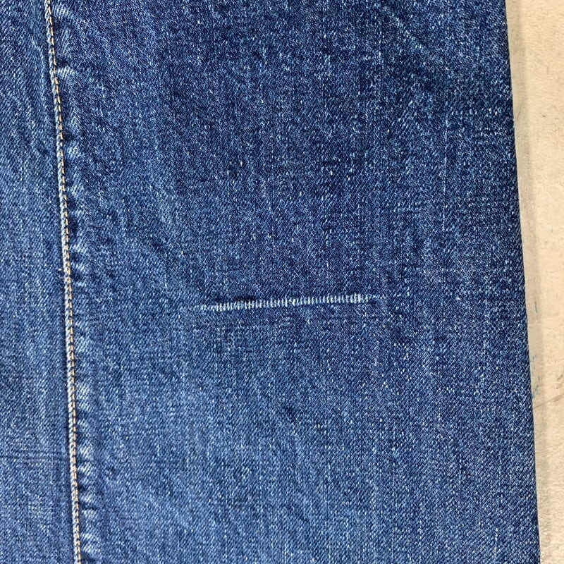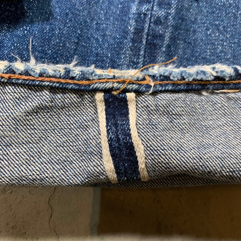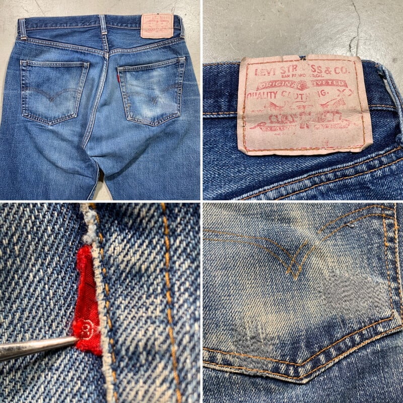 60年代から70年代頃のLEVI'S 501デニムBig Eモデルです。トップボタン裏刻印6、平行ステッチ、フライボタン足長R、ウォッチポケットチェーン、セルヴィッジ裏両面シングル、バックポケット裏シングル、ブランクタブ。フカフカとした印象の紙パッチで、タイプ物の可能性もありますが、印字がほとんど消えかけている為詳細は不明です。こちらは、赤タブがLEVI'S表記では無く®マークのみのブランクタブが付くモデルです。通常の社名入りタブのおおよそ10分の1の確率で取り付けられている仕様です。レギュラーモデル等では見る機会もい多いと思いますが、Big E期物ではなかなか見かける機会は少ないかもしれません。バランスよく色落ちしヒゲも確認できます。膝裏もハチノスはうっすらと入っています。右脛付近に糸抜けのように筋が入っていますが、ダメージではありません。裾に擦れダメージがございます。バックポケットにタタキリペアが丁寧に施されており、右ハンドポケット内側のスレーキもダメージを接着芯で補修した形跡がございます。その他擦れ等はございますが、致命的なダメージも少なくコンディションは良好だと思います。ウエストはW33インチとゴールデンサイズですのでお探しの方も多いのではないでしょうか。ヴィンテージリーバイスの人気も高く今後も高騰が予想されるアイテムですので、サイズがばっちりな方は是非いかがでしょうか。