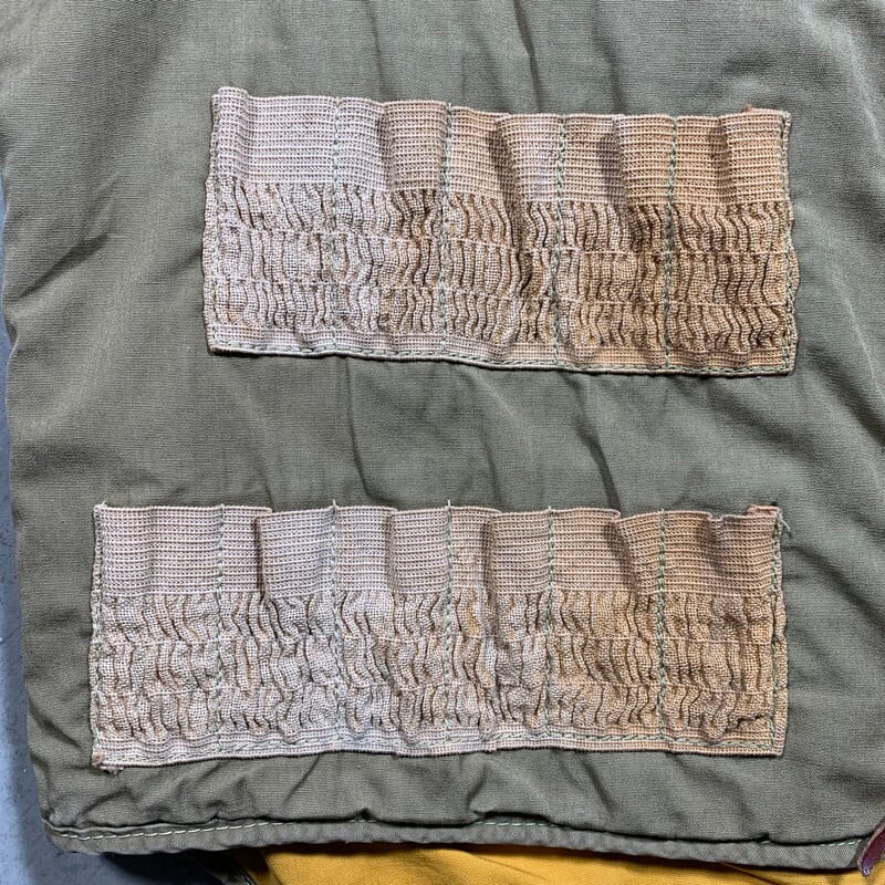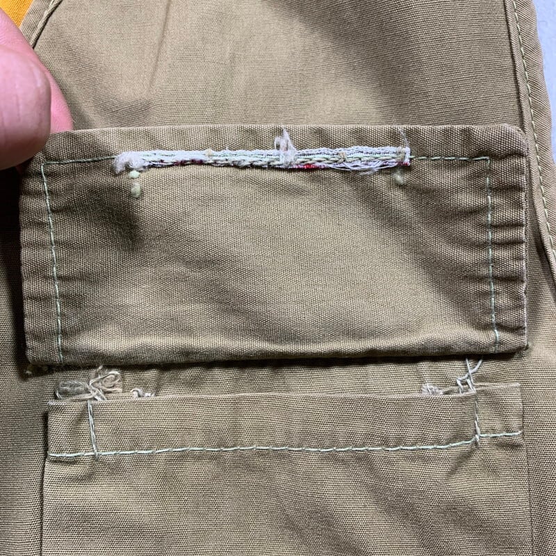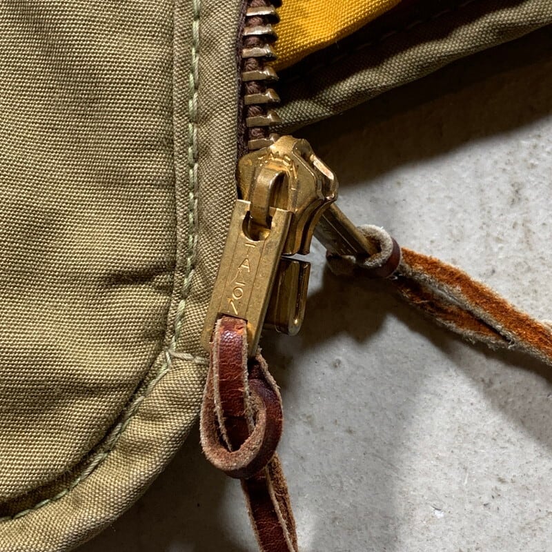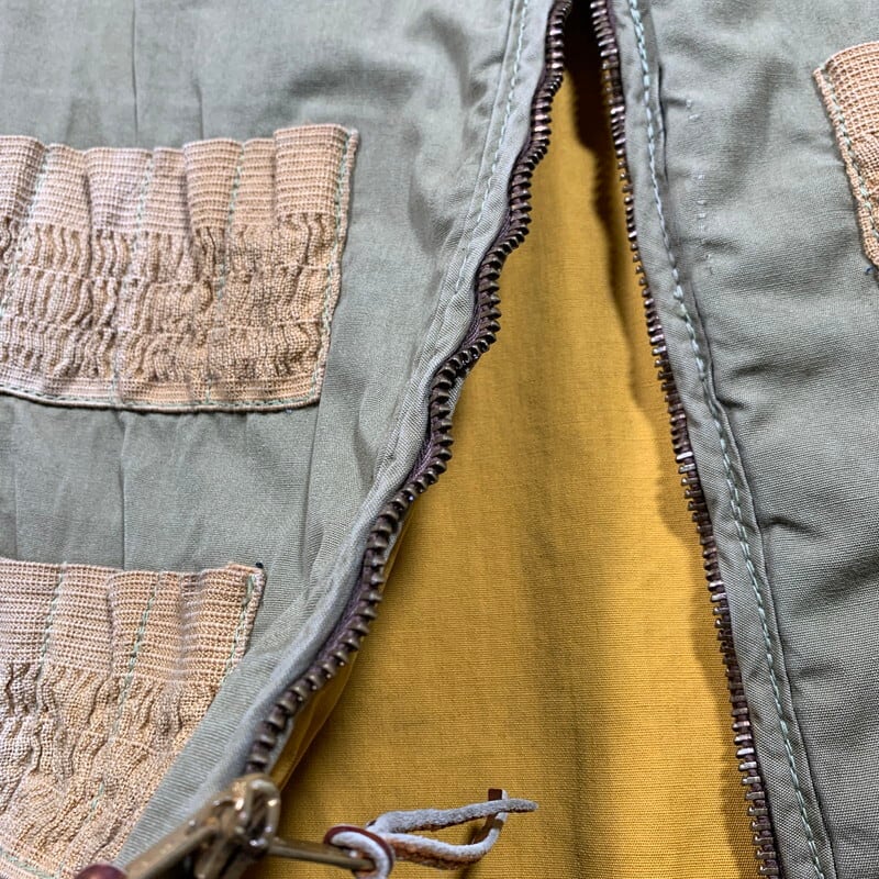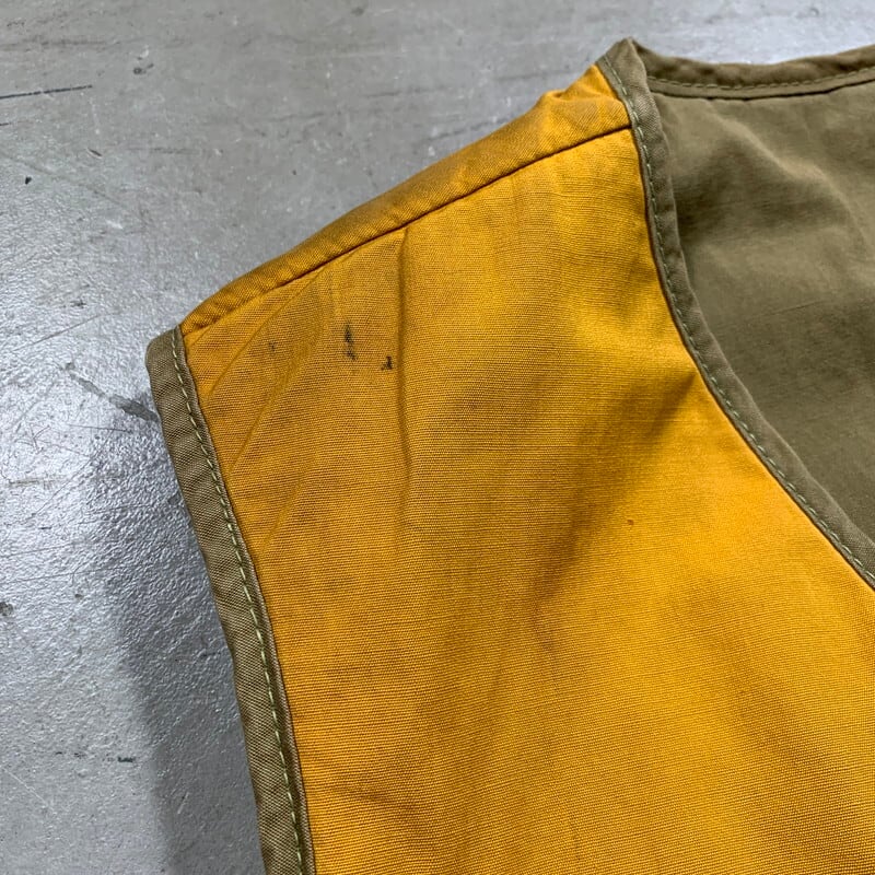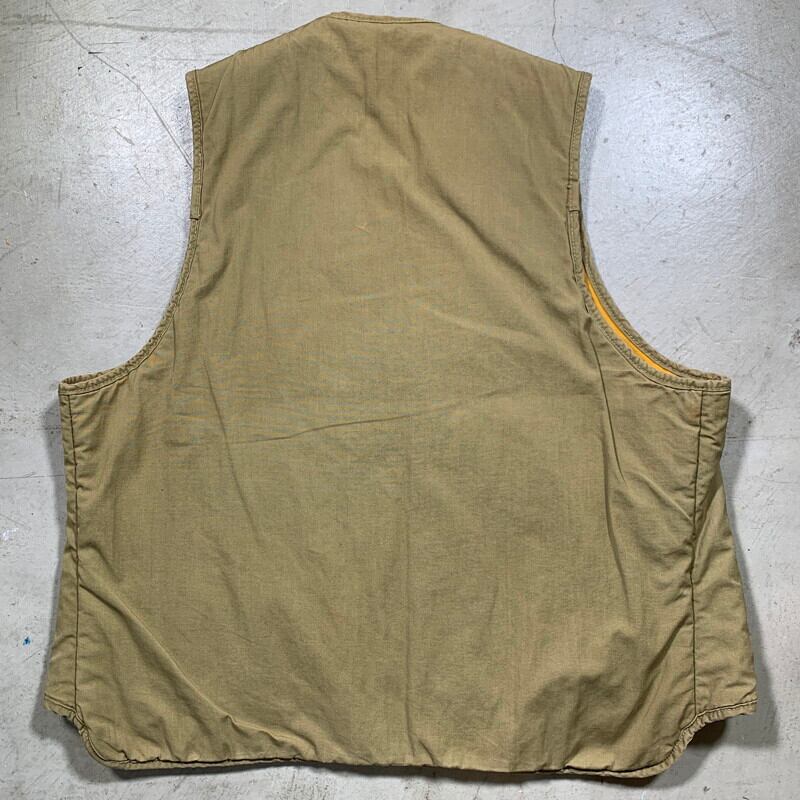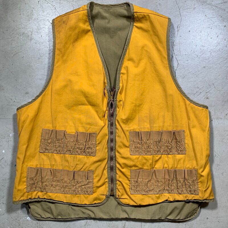 50年代から60年代頃のリバーシブルハンティングベストです。タグが欠損しておりますが、胸ポケ内側に付いていたタグの形跡や縫製等からInsulAIR Warmster Sportswear社の物でほぼ間違いないと思われます。オリーブ面は胸ポケットとカートリッジホルダーのみ、マスタード面はカートリッジホルダーのみの簡素な作りでゲームポケットは付かないモデルです。裏表の生地の間にフローティングベスト等に使われる浮力材のような物が内蔵されていますので、防風効果の高い仕様となっています。ブラスのバタフライ式棒TALONジッパーにはレザーの取っ手が付きます。ジッパーにうねりが出ている為スムーズとはいきませんが開閉に問題はありません。オリーブ面に褪色が見られます。細かな擦れや薄汚れはありますが、ヴィンテージアウトドアウェアとしては状態は良好なお品です。ノーマルなハンティングベストに比べるとあまり見かけないと思いますのでクラシックなアウトドアウェアがお好きな方は是非この機会にいかがでしょうか。