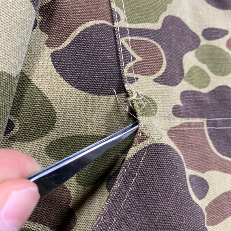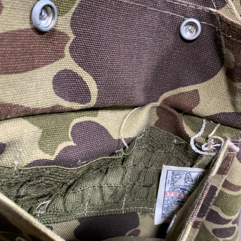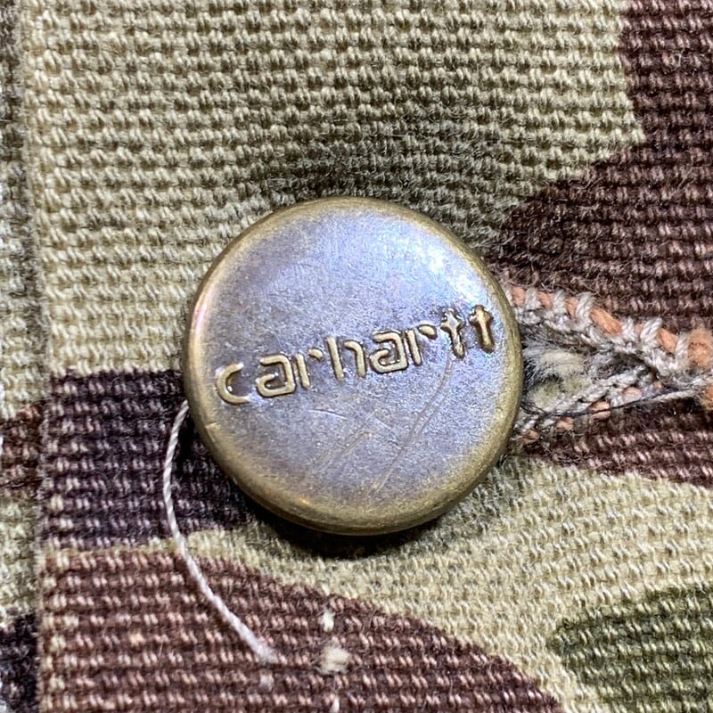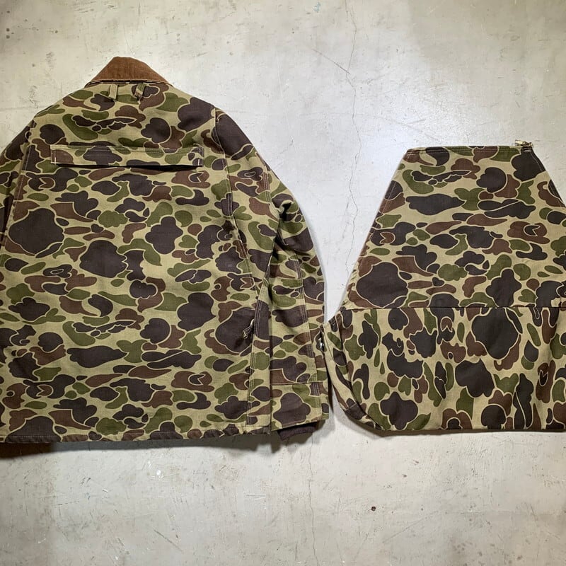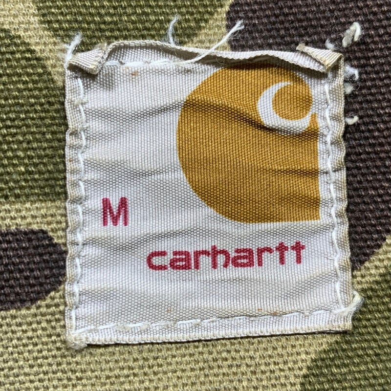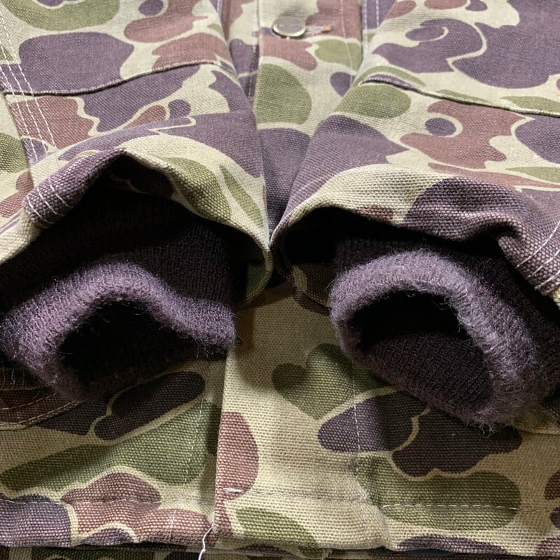 70年代頃のcarharttハンティングジャケットです。人気の高いダックハンターカモ柄で、胸元には旧型のプリントタグが付くモデルです。裏地は中綿キルティングで、袖口にはリブも付きますので防寒性の高い仕様です。背面の大きなゲームポケットは着脱式となっていますので、不要な場合は取り外しての着用が可能です。両胸のポケット下部にステッチ飛びがございますので、胸ポケットをお使いになられる場合は注意が必要です。背面のゲームポケット内のナイロンは綺麗で劣化はございません。ライニングに一部よごれがございます。ステッチ飛びこそございますが、色褪せやダメージ、汚れの少ないグッドコンディションです。80年代以降の刺繍タグが付くモデルは見かけますが、このプリントタグバージョンはなかなか見ないと思います。サイズはMですので、男女共に着やすいサイズでオススメです。