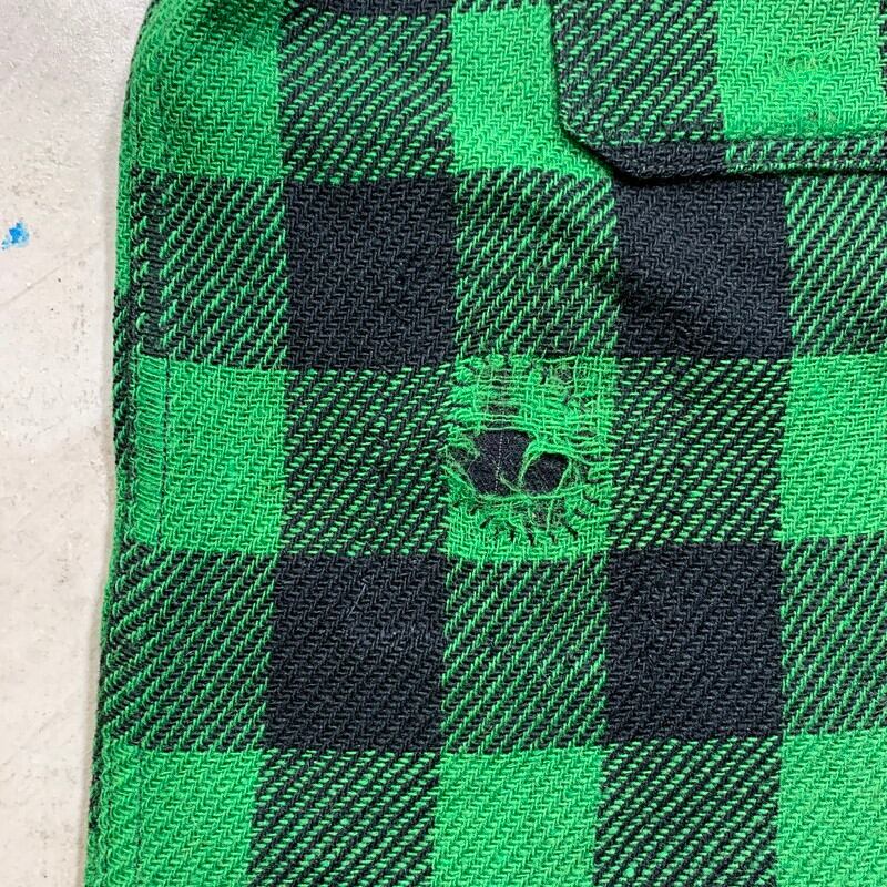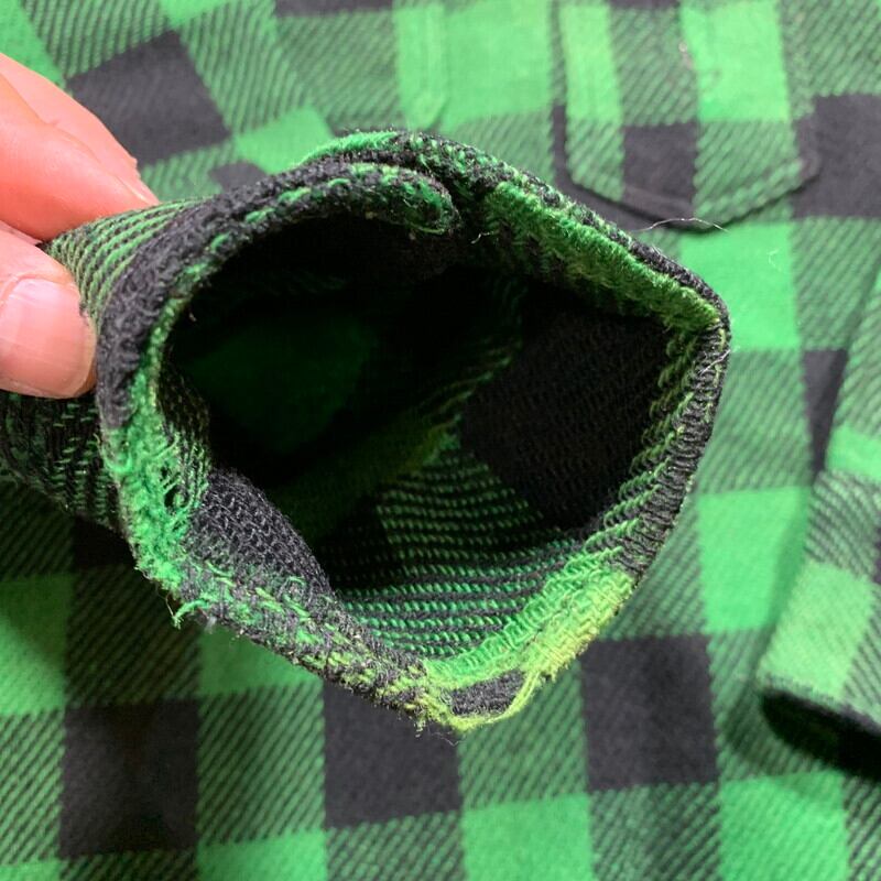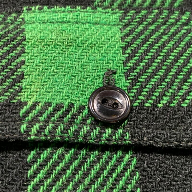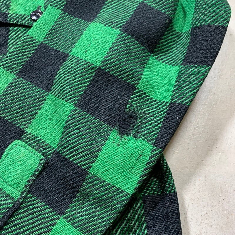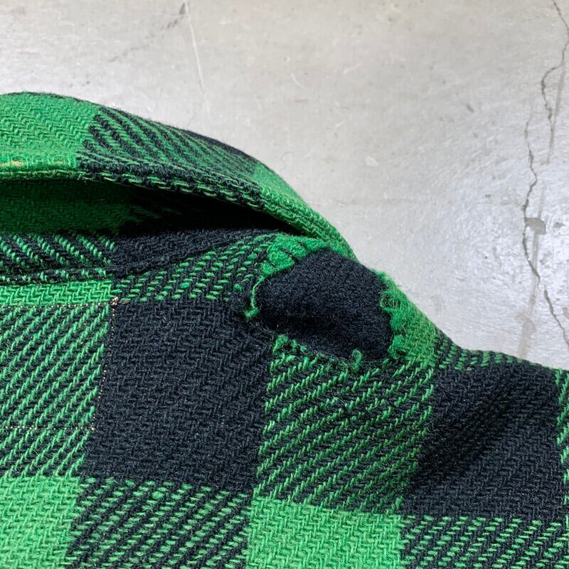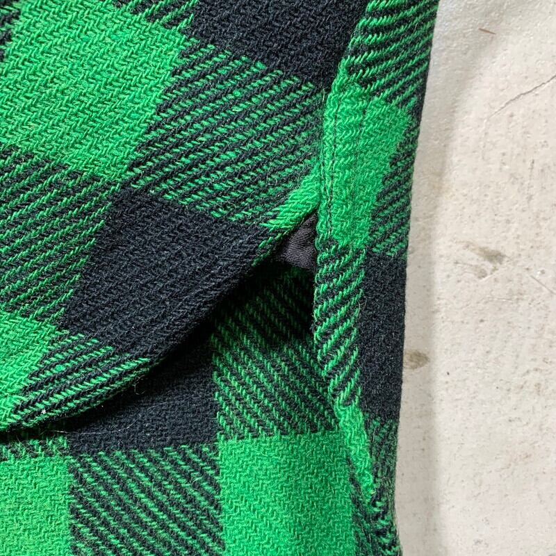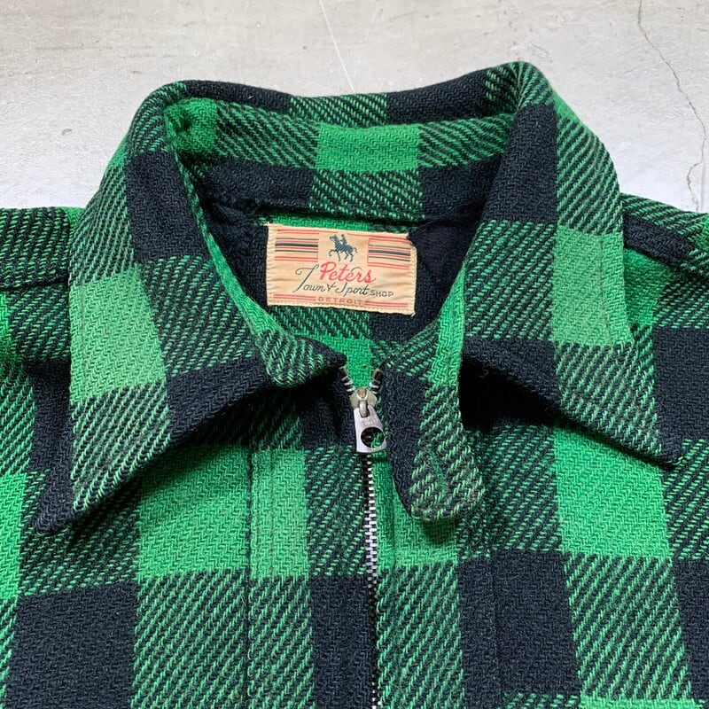 40年代頃の物と思われるPETERSハーフジッププルオーバーシャツです。レザージャケットで有名な同名のブランドとは関係の無い別ブランドだと思われますが、詳細は不明です。台襟でチンストラップが付き、CONMAR社のベル型ジッパーが使用されています。ジッパーエンドはコの字です。サイドにはマチが付きます。右腕には1939年に設立されたNATIONAL FIELD ARCHERY ASSOCIATIONのレザーワッペンが付き、左腕にはKelloggが主催するハンティングクラブのワッペンが付きますが、どちらも後付けの為、当時物なのかは不明です。通常のグリーンのバッファローチェックよりやや明るめな黄緑のようなカラーです。左胸のボタンのみ交換されています。フロントの脇腹両サイドや袖、片周りなどにハンドリペアが施されています。小穴のようなダメージもいくつかございます。リペア等はございますが、長めのチンストやワッペンの雰囲気も良くお好きな方は多いのでは無いでしょうか。古い年代ならではのディティールが楽しめる1着ですので、是非この機会にいかがでしょうか。