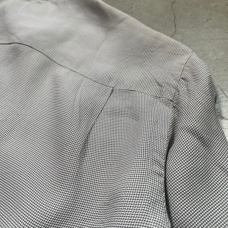 40年代から50年代頃のDAILY DOUBLE オープンカラーシャツです。詳細は不明ですが、競馬の賭け方の1種である重勝式(DAILY DUBLE)がブランドネームという興味深いアイテムです。タグにも競走馬と思われる図柄が入りますので、何か関係があるのかもしれません。グレーとホワイトの2色使いの平織りで、コットンとレーヨンの混紡だと思われます。つるっとしたベークライトボタンが使用され、袖は剣ボロ仕立てです。胸ポケットのフラップの形状もどこかクラシックな印象です。肩付近にかなりうっすらとヤケが見られますが、目立つ汚れやダメージはほとんど無く、破れがちな襟元のサテン地も綺麗です。サイズはM。ボックスシルエットでテロっと動きのある生地感です。古めのゆったりとしたスラックスと合わせると雰囲気も良いと思います。デッドストックでは無いですがかなりコンディションが良いアイテムなので、ヴィンテージシャツをお探しだった方は是非この機会にいかがでしょうか。