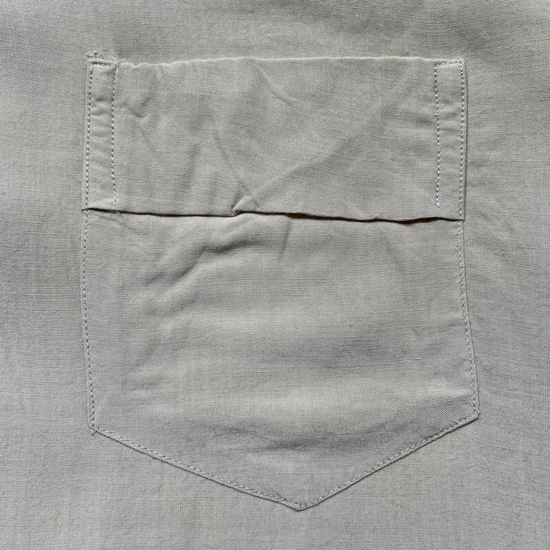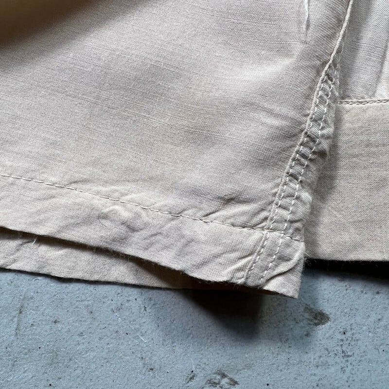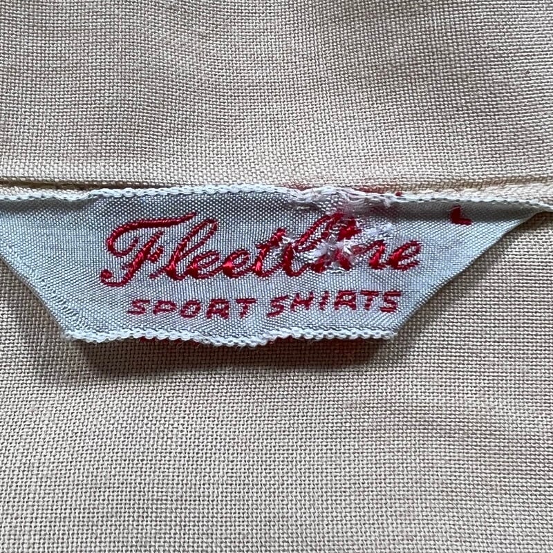 40年代頃のFleetlineレーヨンシャツです。ウェスタンシャツ等も手掛けていたブランドのようですが、詳細は不明です。襟先の長いロングポイント仕様の1着です。ピッチ幅も狭く細かい縫製が施されています。ルーボタンは付きませんが、型を付けてオープンカラーでも着用していただけます。ポケットの形状も角ばったホームベース型で、クラシックな印象です。襟に1ヵ所生地の解れを簡易的に補修した箇所がございます。その他使用感はございますが、目立つ汚れやダメージは特にございません。Lサイズ表記ですが、着丈はそこまで長くないので着やすいと思います。非常にシンプルなシャツですが、ヴィンテージ感がにじみ出る渋い1着です。リペアなど楽しめる方は是非いかがでしょうか。