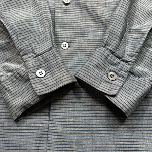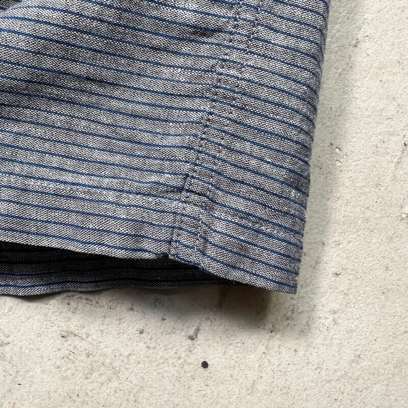 50年代から60年代頃のMcGREGORシャンブレーオープンカラーシャツです。グレーのシャンブレー生地で、ショルダー部分が切り替えしになり、ボディや袖にピッチの狭いボーダー柄が施されております。プリントでは無く糸の色を変えて織られいて凝ったデザインとなっています。黒蝶貝のシェルボタンが使用されています。フロント等に小さなシミがあり、脇にもシミがございます。1度軽く洗濯してシミはかなり薄くなったので、少し長めに浸け置きしていただくとさらに目立たなくなるかと思います。その他ダメージは特になく生地もしっかりとしています。シンプルですが、良いデザインでオススメです。M表記ですが、ややゆとりがあります。ヴィンテージマクレガーがお好きな方は是非いかがでしょうか。