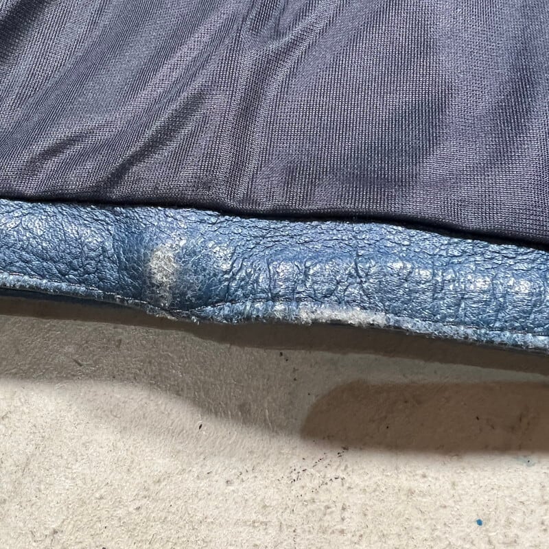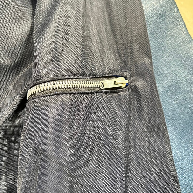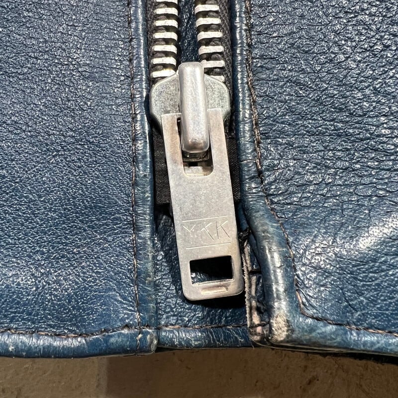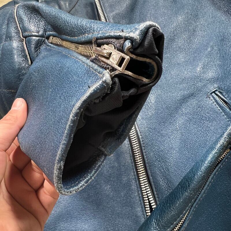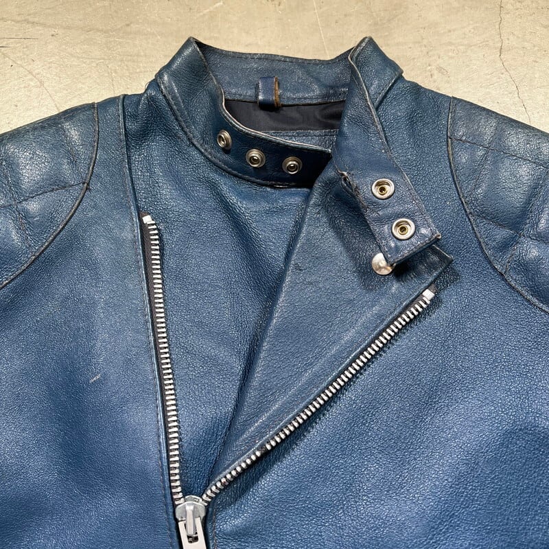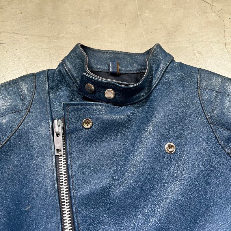 70年代頃のTT LEATHERS INTERNATIONALのレザーライダースジャケットです。UKライダースジャケットの名門と呼ばれるブランドです。肩と肘にパデッドと呼ばれる保護をするためのクッションが付く仕様です。スタンドカラーでダブルのように斜めに配置されたジッパーが特徴的です。ネイビーに近いブルーでシンプルでスタイリッシュな印象です。フロント、左右のポケット、左袖はYKKのジッパーですが、右袖と内側のジッパーは別の物が付いています。交換された形跡はなので、元からなのかもしれません。フロントのジッパーに歯が飛んだ箇所が見られますが、開閉に問題は有りません。背面に細かなペンキのような汚れがございます。肩や袖に擦れは有りますが、レザーの状態は良好です。サイズは36Rとやや小さめですが、ライダースなのでジャストで着ても良し、インナーとのレイヤードを楽しんでも良いかと思います。色が渋い1着ですので、UKライダースがお好きな方は是非この機会にいかがでしょうか。