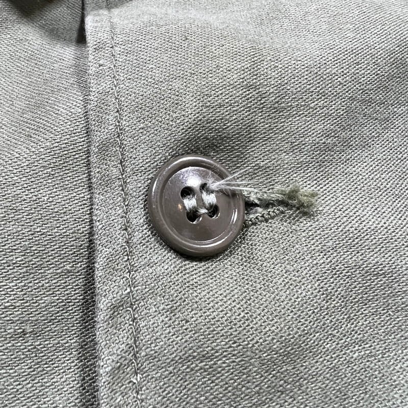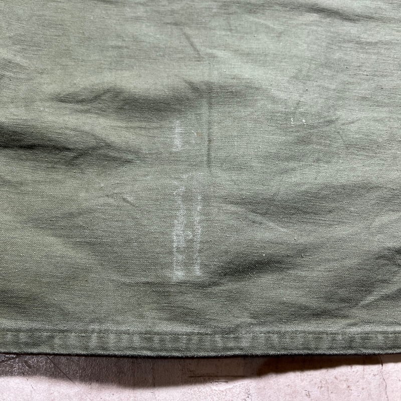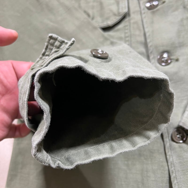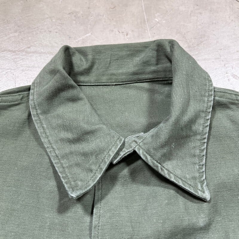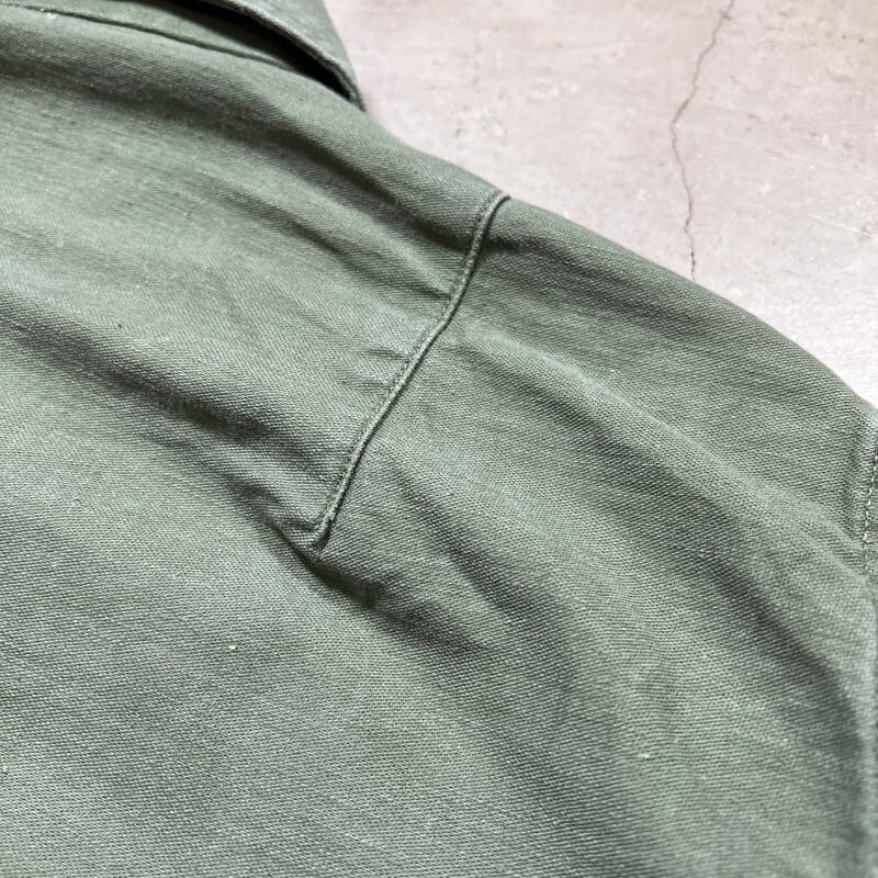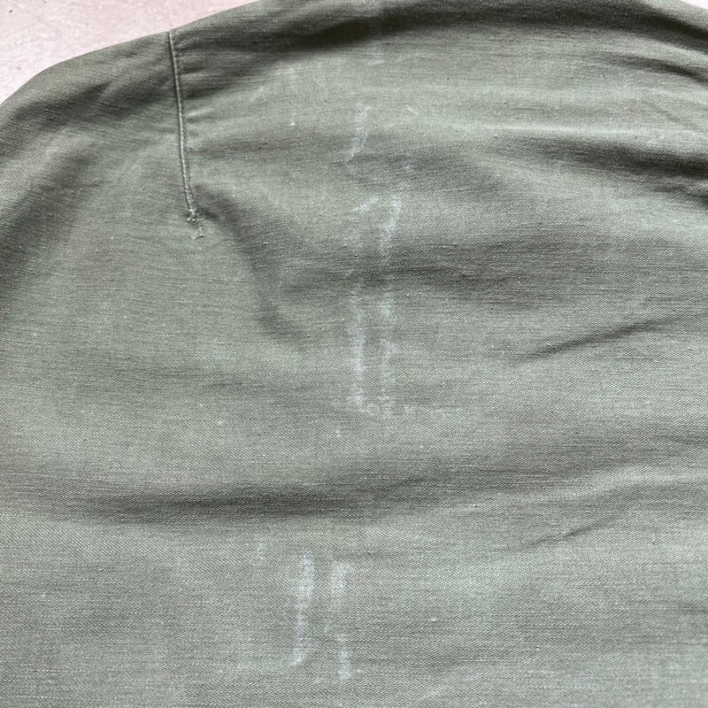 60年代のU.S.ARMY OG107コットンサテンユーティリティーシャツです。ヘリンボーンツイル地からコットンサテンへと変更となり、袖に唯一ストラップが付く2ndと呼ばれるモデルです。1stモデルは第1ボタンと第2ボタンの間隔があくタイプですが、この2ndモデル以降は等間隔にボタンが配置されます。ボタンはオリーブグリーン、首タグはありませんが、前立て裏の下部にミルスペックタグが付きます。先述にありますが、このモデルのみ袖に調整用のストラップが付き、身幅はややシェイプされたシルエットが特徴的です。肩の後ろに入るタックもこの2ndとその後継モデルのみ見られるディティールです。胸元には元々パッチが付いていたようですが、綺麗に取り外されています。ワッペン跡に小さなダメージがございます。背面には白っぽいシミの様な物がありますが色抜けなのかは不明です。その他使用感は多少ございますが、致命的なダメージは無く良好です。OG107のユーティリティーシャツの中では採用期間も短めで、このストラップ付きのモデルは意外と見かける機会は少ないと思います。サイズ表記が欠損していますが、MEDIUM相当です。シンプルですが、1枚あると何かと合わせやすいアイテムですので是非いかがでしょうか
