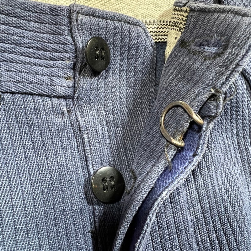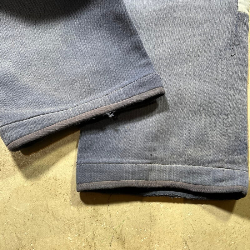 40年代から50年代頃のM.FAUREフレンチピケワークパンツです。一つ前のモールスキンワークジャケットと同ブランドで、フランスのワークウェアブランドだと思われます。こちらはフレンチピケと呼ばれる太い畝のある生地が使用されたパンツですが、腿から膝と、腿裏にパッチワークリペアが施されています。フロントのリペアは、モールスキン地を張り付けた上からコットンツイルの生地も縫い付けられダブルニーのように丈夫に補強されています。大雑把ななリペアですが、色のバランスの良い1本です。裾にも擦れ防止の為パイピング処理が施されています。フロントのフックの受けが欠損しています。擦れや薄汚れ等はございますが、着用に問題は無く良好です。サイズ表記はございませんが、実寸W32インチです。リペアが入ることで唯一無二の存在感で非常にオススメです。ざっくりとしたニットにローファー等を合わせていただいても雰囲気が良いと思います。古いフレンチワーク系がお好きな方は是非この機会にいかがでしょうか。