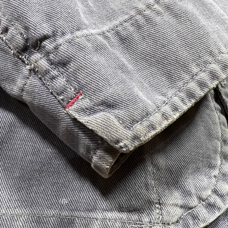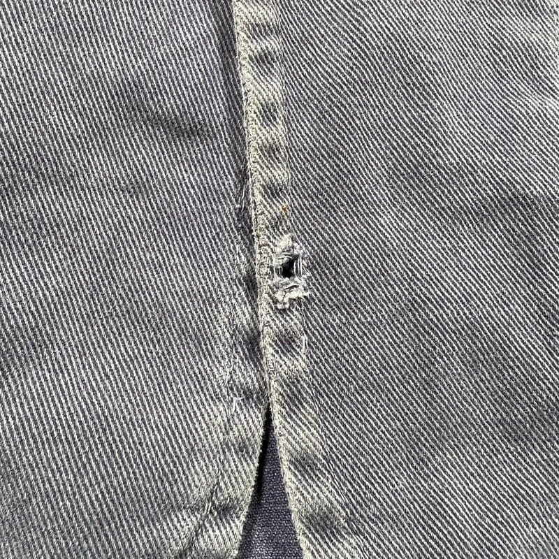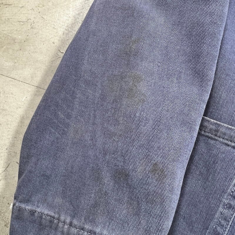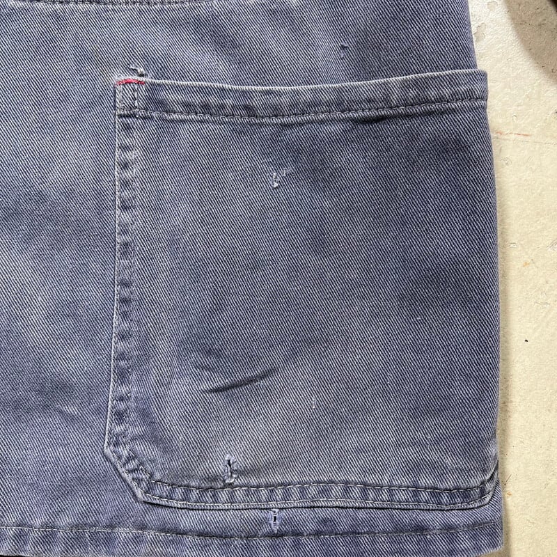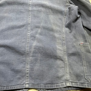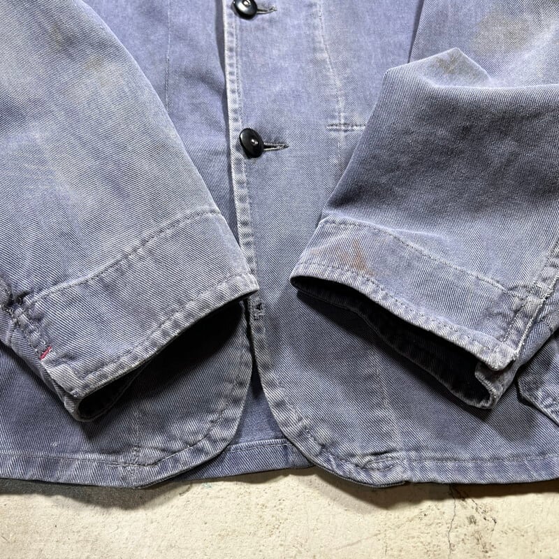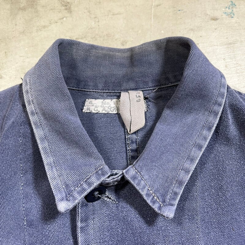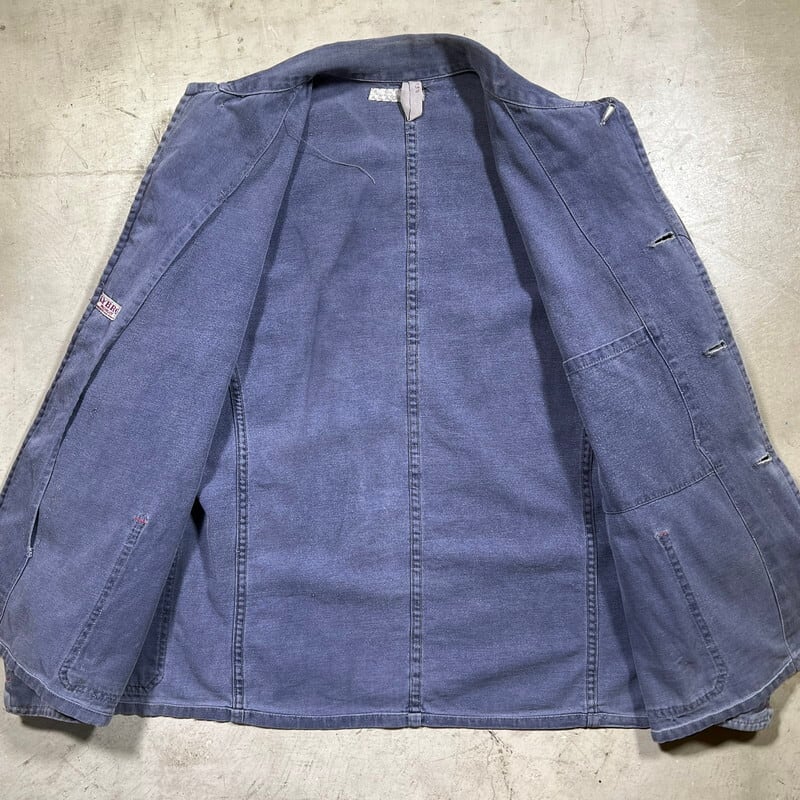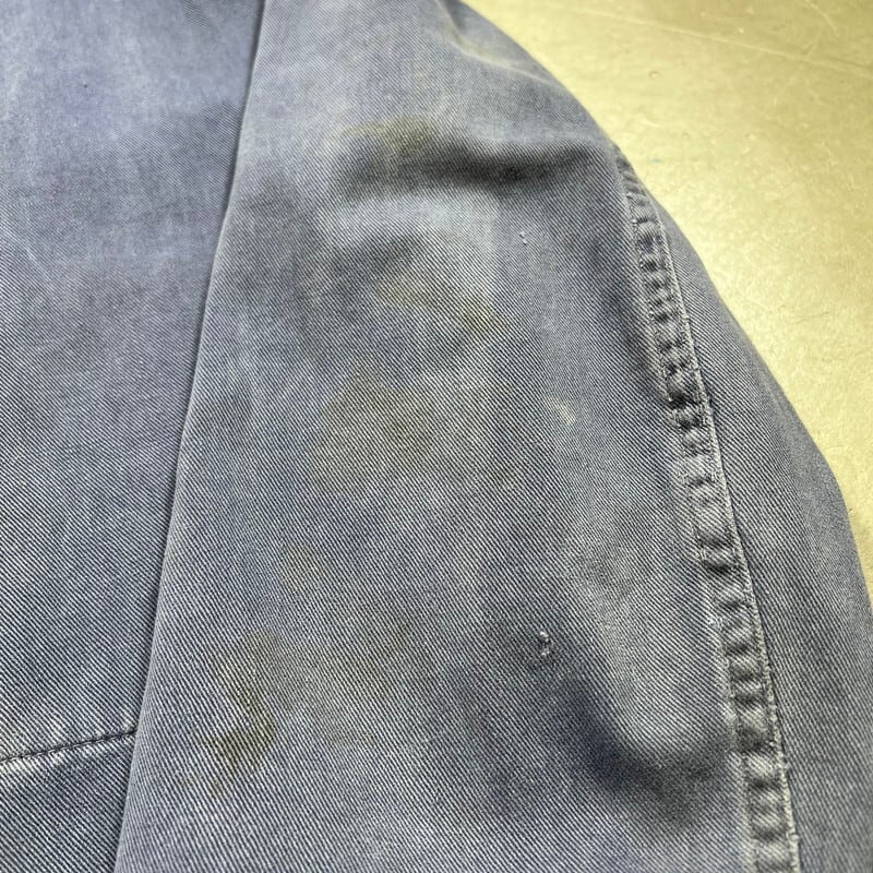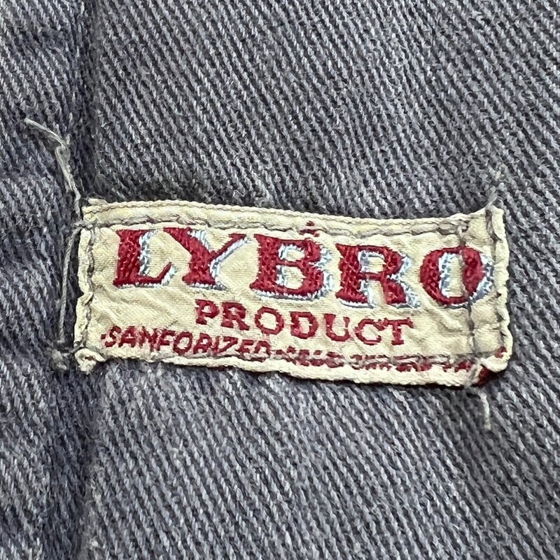 40年代から50年代頃のLYBROブリティッシュワークジャケットです。1927年にイングランドで設立されたワークウェアブランドです。1983年には一度消滅してしまったブランドですが、現在はナイジェルケーボンが権利を取得しLYBROブランドを復刻させています。こちらは当時の貴重なオリジナルで、良い塩梅にフェードしたブルードリルが使用されています。4つのボタンの内トップ以外は全てチェンジボタンです。大戦カバーオールのような2ポケ仕様で、身幅は広く着丈は短めです。シルエットはAラインで綺麗です。袖を中心にシミや擦れ等ございますが、大きなダメージは無く状態は良好です。サイズ表記はありませんがM~L位です。LYBROのオリジナルはなかなか目にする機会も少ないと思いますので、ナイジェルケーボンがお好きな方や古いユーロワーク物がお好きな方は是非この機会にいかがでしょうか。