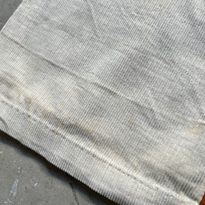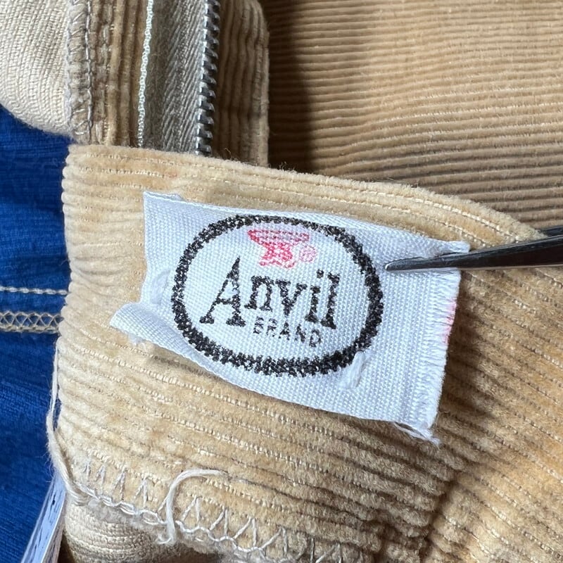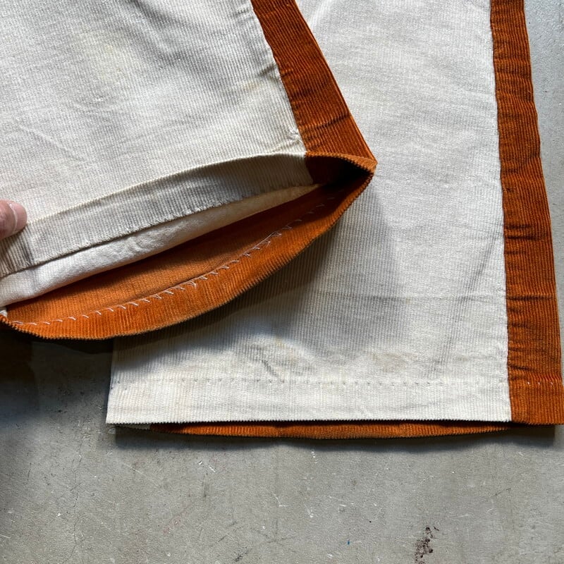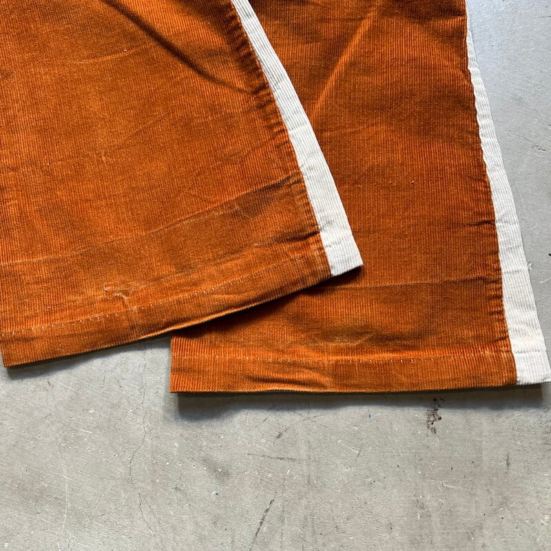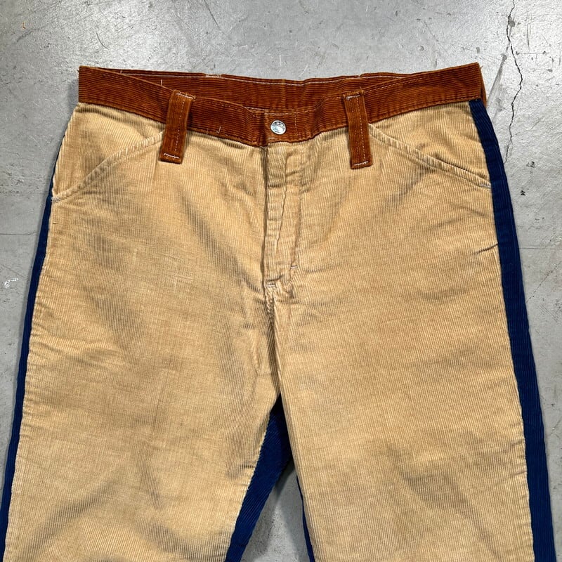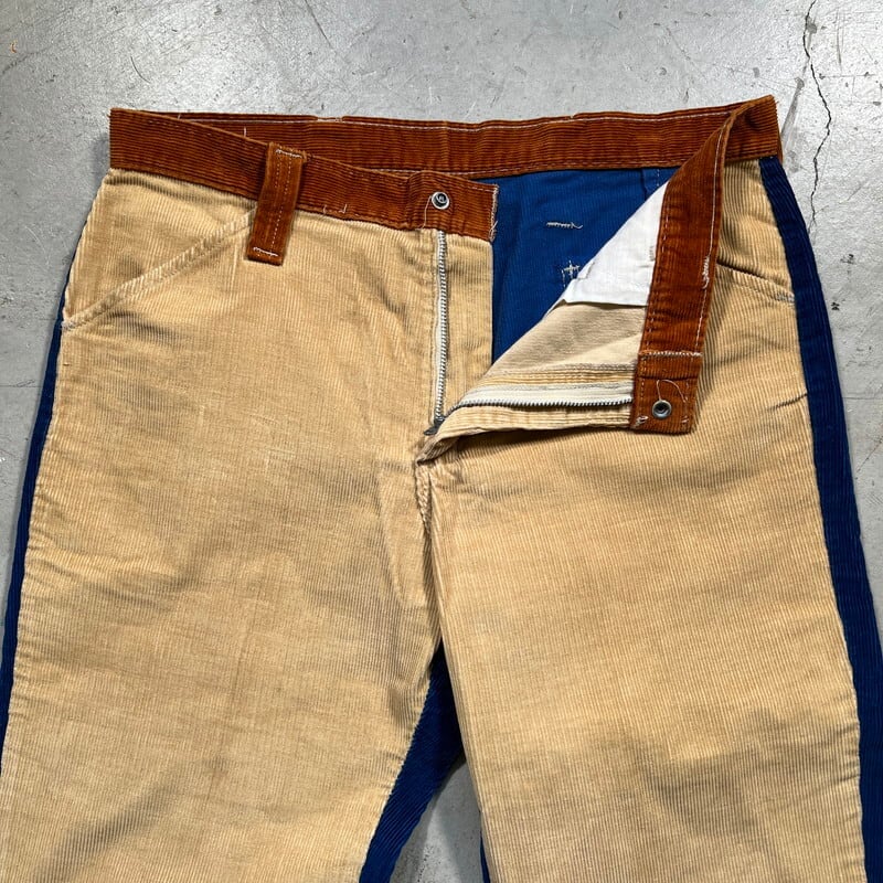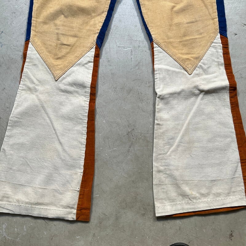 70年代頃のAnvil クレイジーパターンコーデュロイフレアパンツです。1899年に創業した老舗ブランドで、現在ではボディーメーカーとして知られるブランドです。こちらの商品は、ヒッピーカルチャーが投影されたようなフレアシルエットに4色のコーデュロイ地が使用されたクレイジーパターンが目を惹く1本です。Wrangler×peter maxを彷彿とさせるデザインで、フロントとバック、膝下で切り替えられています。小ぶりなバックポケットもポイントです。膝下のクリーム色の生地に薄汚れが見られますが、その他は比較的状態の良い個体です。股上は浅めです。ウエストは実寸W31インチ位で男女共に穿きやすいサイズなのでシェアも出来ると思います。個性的なデザインがお好きな方は是非いかがでしょうか。