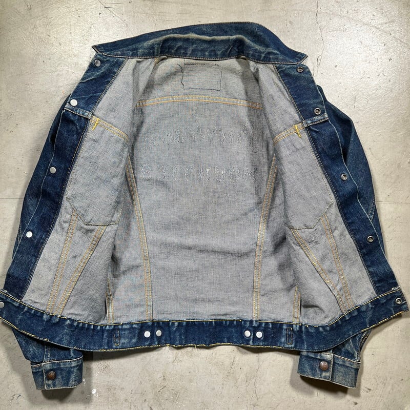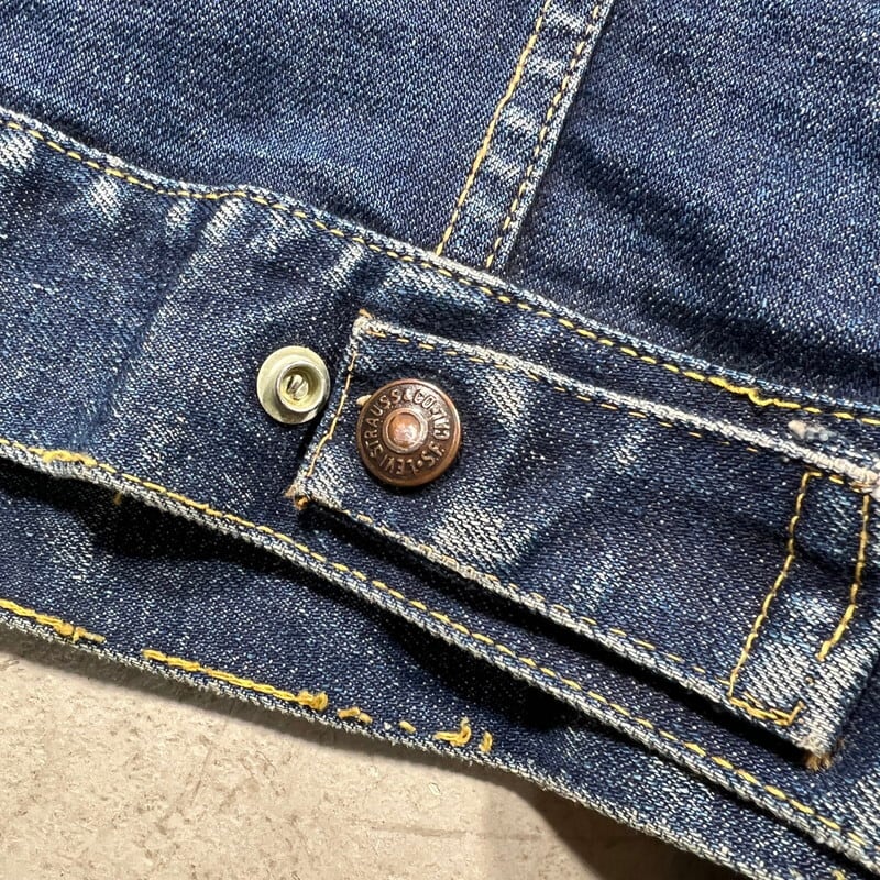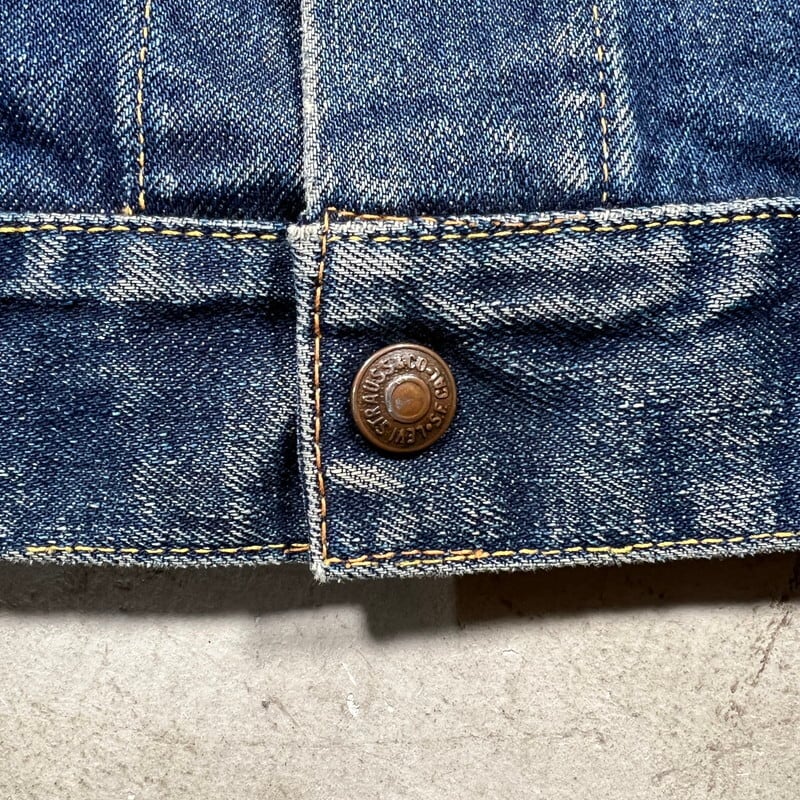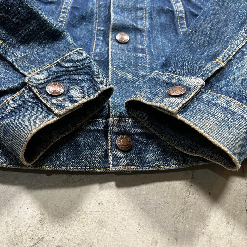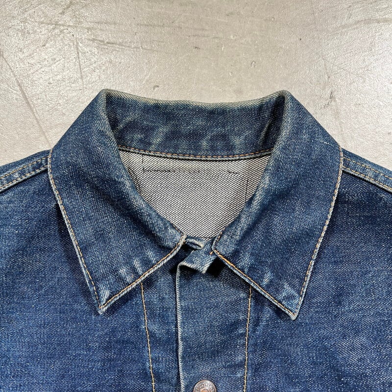 60年代の557XXデニムジャケットです。507の後継モデルとして1962年から販売が開始された通称3rdモデルです。フロントスナップボタン、ボタン裏ドット刻印、フラップ裏同オンスデニム生地、裾、カフスステッチ折り返し有り、赤タブBig E、均等V。パッチ欠損していますが、恐らく557XXのギャラ入りとギャラ無しの過渡期頃のモデルかと思われます。通常のサイズ展開は34からとされていますが、こちらは32以下のサイズのみ採用されたスナップボタンが付く珍しいモデルです。色残りもまだ濃いめで、袖にはうっすらとハチノスが入ります。背面には元々チェーンステッチが施されていたようですが、綺麗に取り除かれています。手先が器用な方はチェーンステッチで復元してみてはいかがでしょうか。一部ステッチ飛び等や小さなハンドリペア等ございますが、状態は良好です。サイズ感でいうとXS相当でしょうか。細身な男性や小柄な女性向けです。色味もまだまだ濃いめなので経年変化も楽しめる1着です。サイズが合う方は是非この機会にいかがでしょうか。なかなか見つからない希少なサイズです。