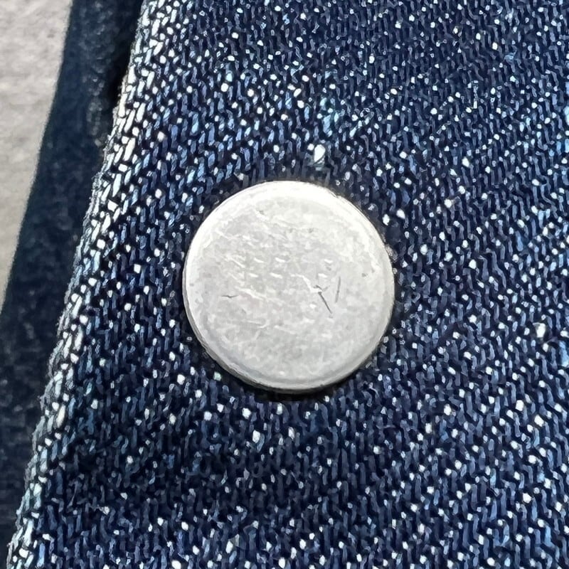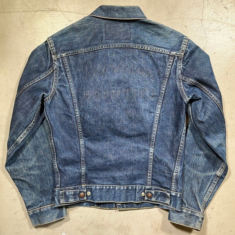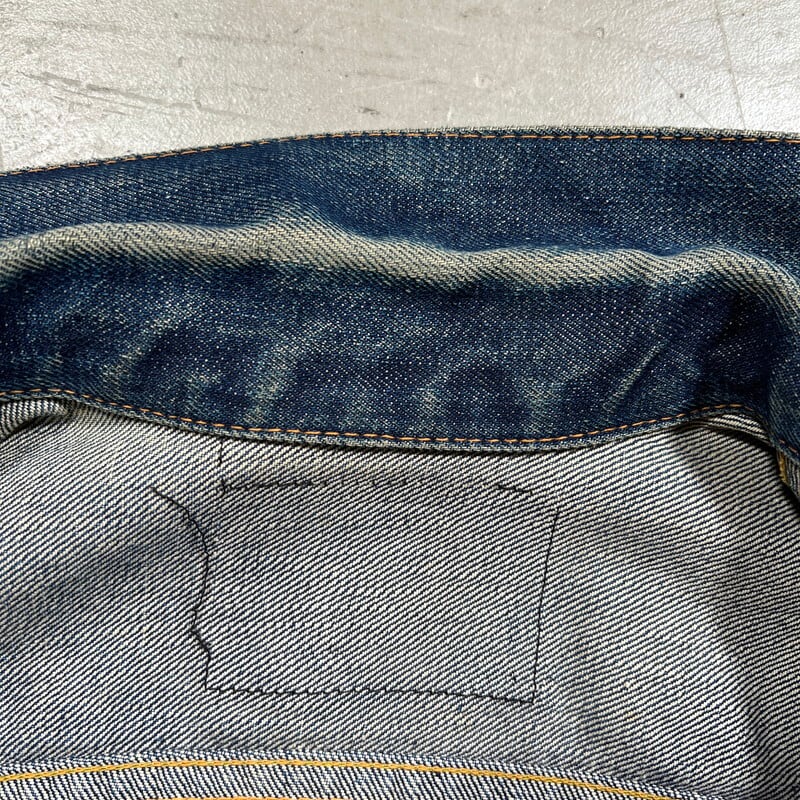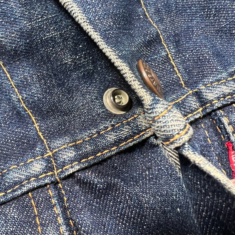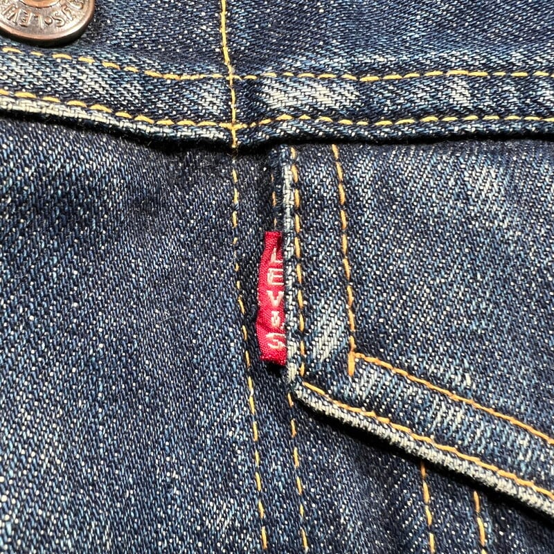 60年代の557XXデニムジャケットです。507の後継モデルとして1962年から販売が開始された通称3rdモデルです。フロントスナップボタン、ボタン裏ドット刻印、フラップ裏同オンスデニム生地、裾、カフスステッチ折り返し有り、赤タブBig E、均等V。パッチ欠損していますが、恐らく557XXのギャラ入りとギャラ無しの過渡期頃のモデルかと思われます。通常のサイズ展開は34からとされていますが、こちらは32以下のサイズのみ採用されたスナップボタンが付く珍しいモデルです。色残りもまだ濃いめで、袖にはうっすらとハチノスが入ります。背面には元々チェーンステッチが施されていたようですが、綺麗に取り除かれています。手先が器用な方はチェーンステッチで復元してみてはいかがでしょうか。一部ステッチ飛び等や小さなハンドリペア等ございますが、状態は良好です。サイズ感でいうとXS相当でしょうか。細身な男性や小柄な女性向けです。色味もまだまだ濃いめなので経年変化も楽しめる1着です。サイズが合う方は是非この機会にいかがでしょうか。なかなか見つからない希少なサイズです。
