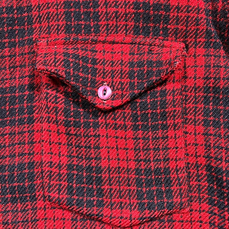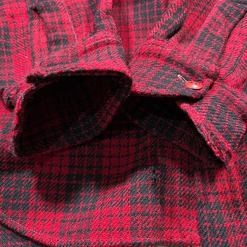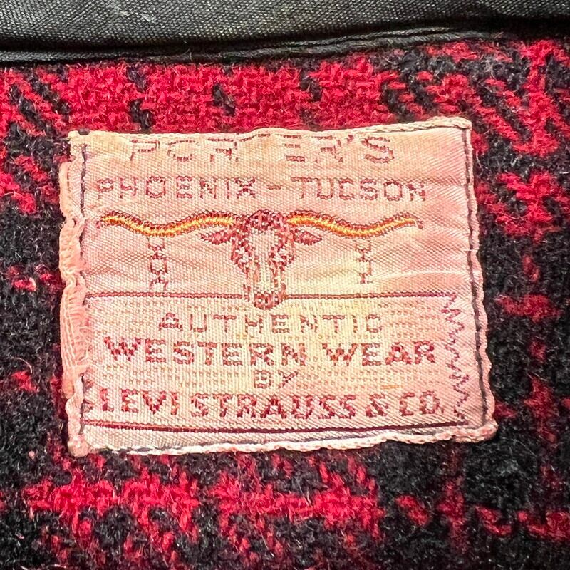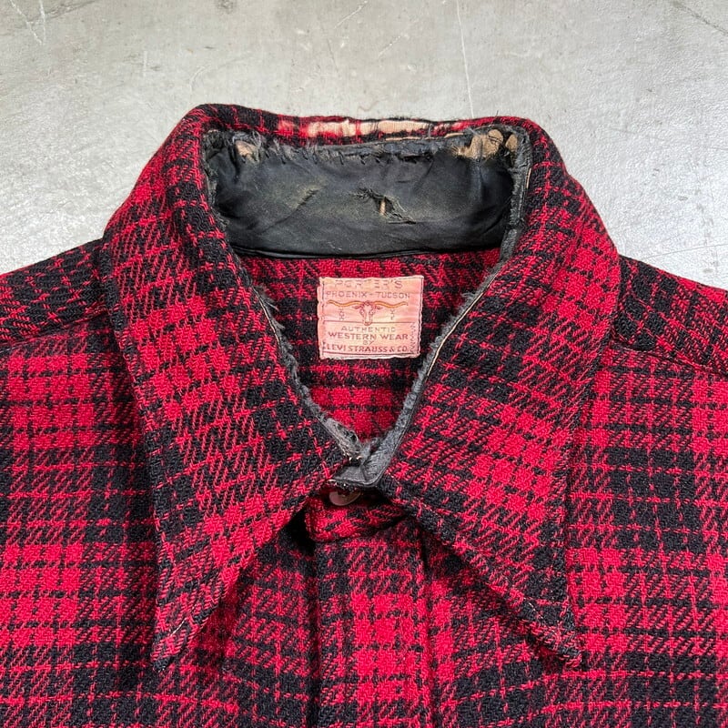 40年代頃のLEVI'Sウールチェックシャツです。こちらは1891年にアリゾナ州フェニックスで創業したN. Porter Saddle and Harness Companyというウェスタンウェア等を販売していた会社がLEVI'Sに別注したアイテムです。赤黒のクラシックなチェック柄で、襟先の長いロングポイント、角ばったフラップポケット、サイドマチ付きと古いディティールです。首元にははリーバイスのロングホーンタグが付きます。首元のサテン地に破れと補修跡が有り、左袖に破れ、左右カフスにもダメージがございます。マチ付近にも破れ等ございます。その他小穴等あります。ボタンがバラバラで、ほとんどが付け替えられています。所々ステッチに縫い直しも見られます。サイズはL~XL程度。身幅広めで着丈は長く無く着やすいサイズ感だと思います。ロングホーンタグが付くアイテム自体希少ですが、別注のWネームが入るタグは珍しいのでは無いでしょうか。状態こそ良くはありませんが、リペアなどを施せばまだまだお使いいただけます。ヴィンテーリーバイスのロングホーンタグがお好きな方は是非この機会にいかがでしょうか。