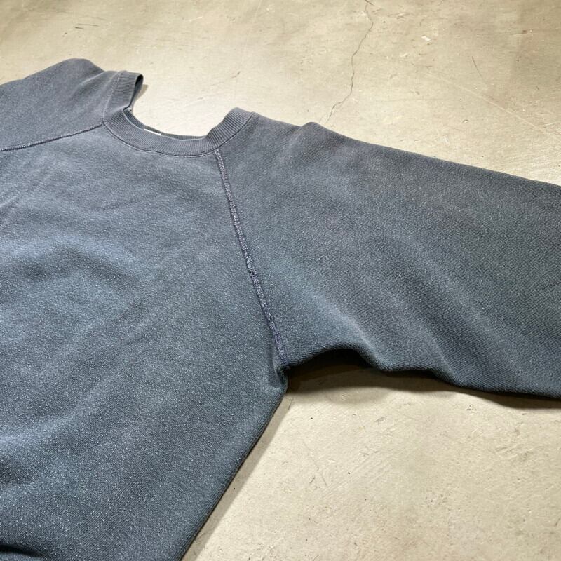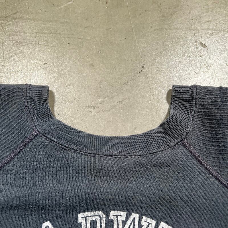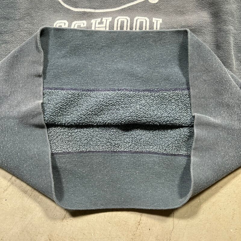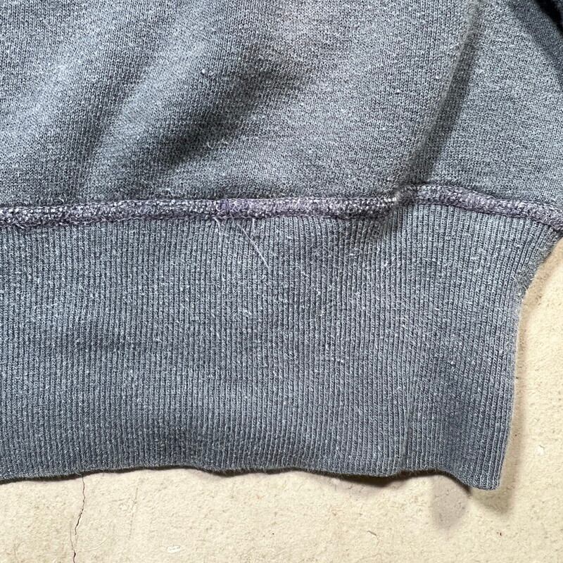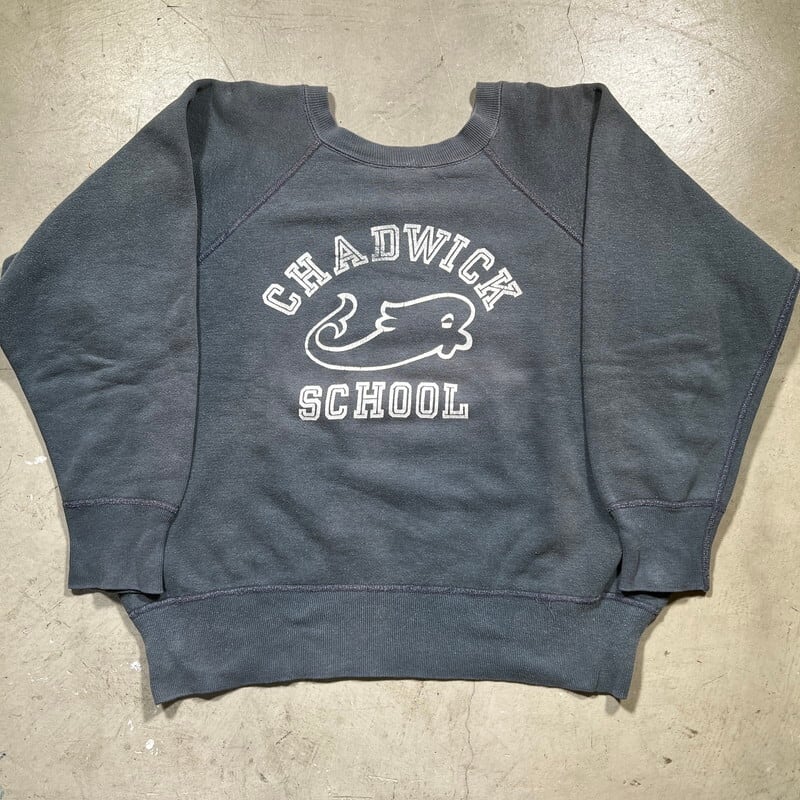 50年代頃のCHAMPIONカレッジスウェットトレーナーです。タグが薄れていますが大文字表記のランタグです。1935年にカリフォルニア州で設立されたCHADWICK SCHOOLのカレッジスウェットで、イルカをモチーフにしたプリントがフロントに入ります。ボディはグレーで、程よくフェードし雰囲気の良い個体です。全体的に毛羽立ちは見られますが、生地はしっかりとしています。擦れ等はございますが、特筆するダメージはございません。サイズ表記はLARGEで、この年代のチャンピオンのスウェットにしては身幅があり比較的大きさのある個体です。着丈は短めですが、スチームで幾分かは伸ばせそうです。古いランタグのスウェットも見つかりづらくなっていますので、お探しだった方は是非この機会にいかがでしょうか。