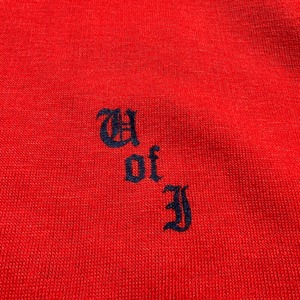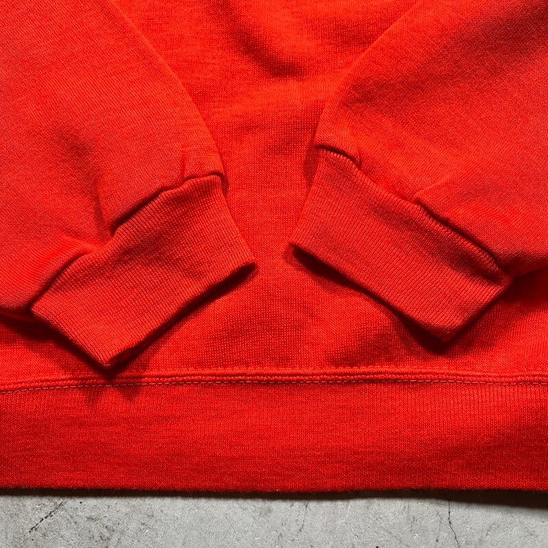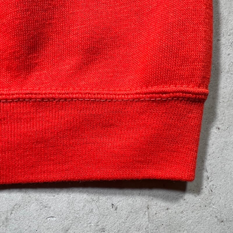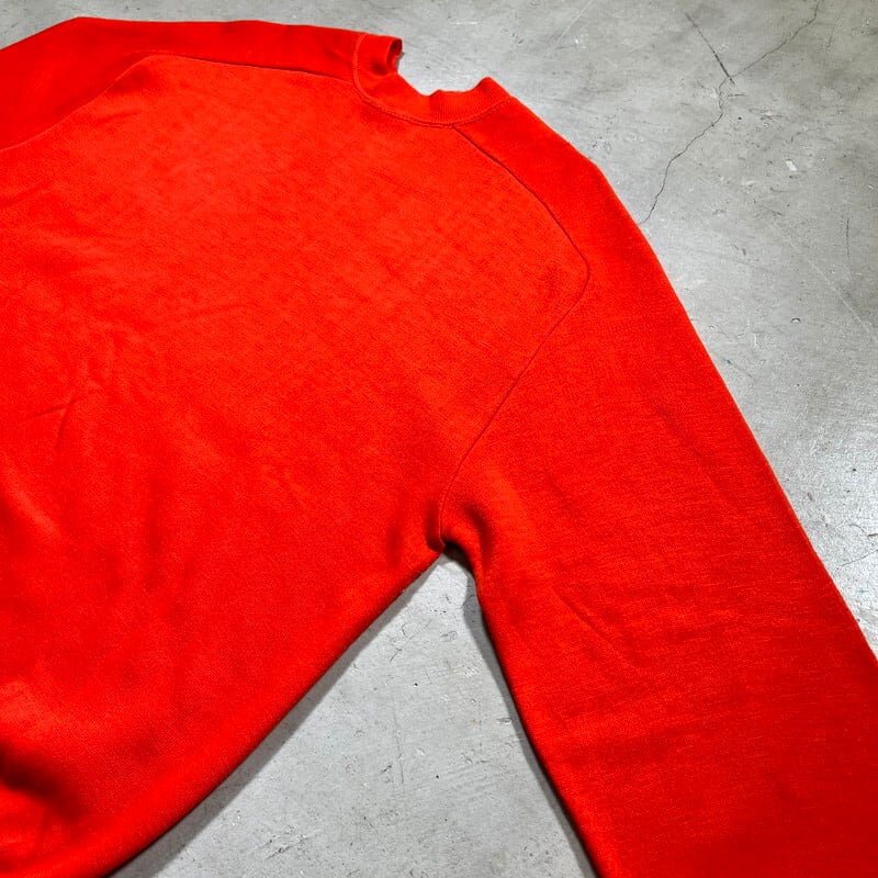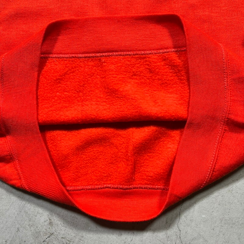 60年代頃のCHAMPIONフリーダムスリーブスリーブスウェットです。プロダクツタグが付くことらはコットンと恐らくアクリルの混紡地が使用されています。この年代と生地感ではかなり珍しいと思われるフリーダムスリーブ仕様です。左胸にはブラックレターフォントで、U of Iと入ります。ボディーカラーのオレンジと、ネイビーのプリントからイリノイ大学のカレッジ物だと思われます。多少の毛羽立ちはあるものの、撚れ等も殆ど無くノンウォッシュもしくは1~2回程度しか水に通っていないのかもしれません。コンディションは非常に良いです。極稀に同タイプのスウェットを見かけますがかなり出現率は低いのかなという印象です。濃いめのオレンジボディもスウェットではなかなか見かけないと思います。LARGEサイズで、着やすいサイズ感です。チャンピオンと言えばリバースウィーブが代名詞になってきていますが、こちらのの様なリバースでは無いスウェットも非常に魅力的です。珍ピオン好きの肩は是非この機会にいかがでしょうか。