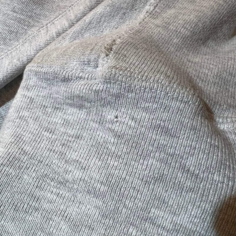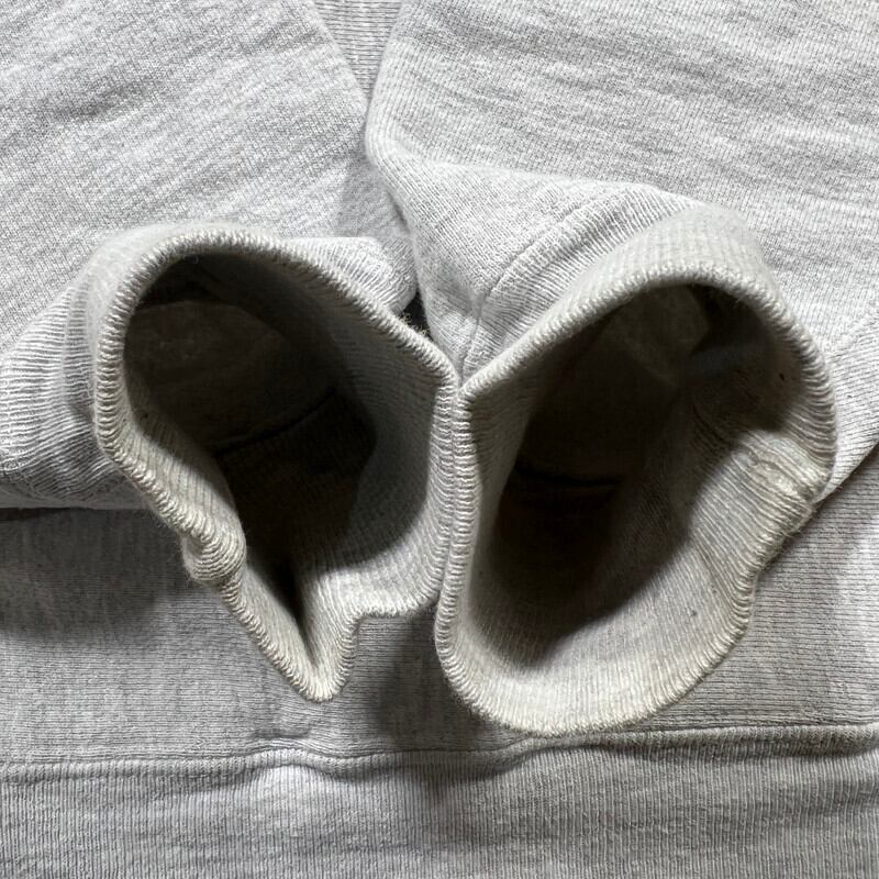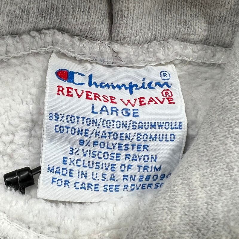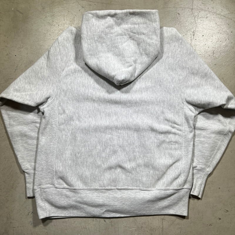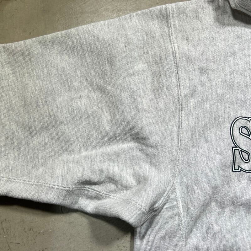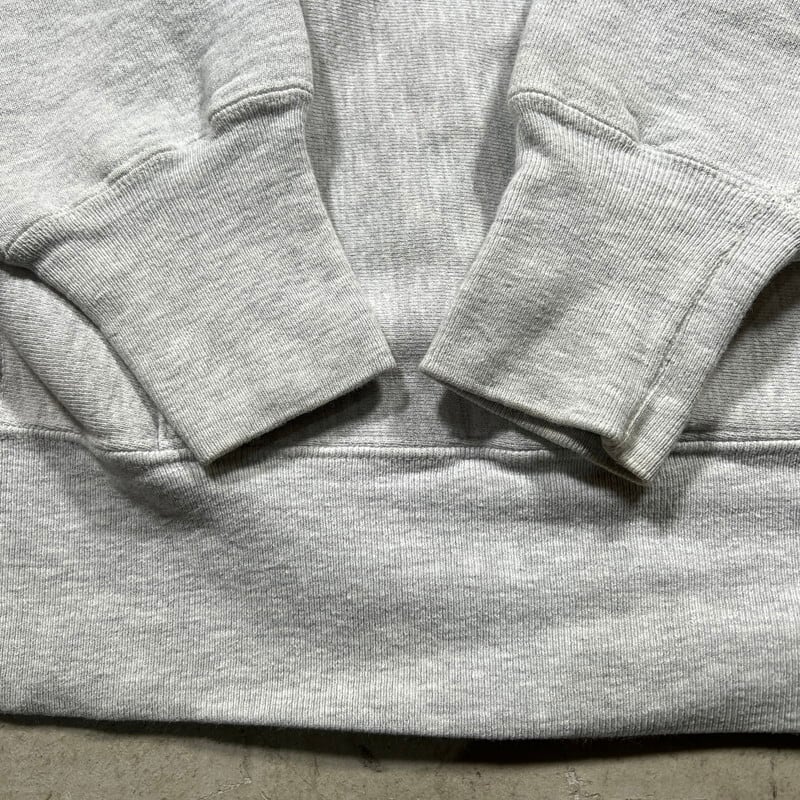 90年代のChampionリバースウィーブスウェットパーカーです。アメリカ、コロラド州の山間にあるスキーリゾートで知られるSNOWMASSのプリントが入る1着です。恐らくカレッジ物では無くスーベニアの類のアイテムだと思われます。グレーボディに、紺、白、緑の3色の縁取りでプリントされたシンプルな1着です。ハトメと袖口にうっすらと変色が見られます。ダメージがありがちなフード付け根の状態は良好です。袖の目玉は欠損しており、ついてあった場所にはボンド跡がございます。裾リブに小穴が1ヵ所見られます。ポケットにも薄いシミ等ございますが、全体的にはかなりコンディションの良い個体です。需要の高いLARGEサイズです。リバースウィーブの高騰が止まらない昨今ですが、状態の良い物はなかなか見つかりにくくなりましたので、お探しだった方は是非この機会にいかがでしょうか。