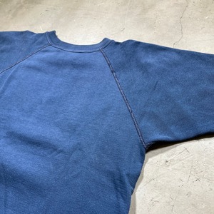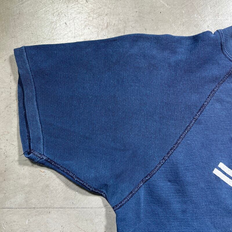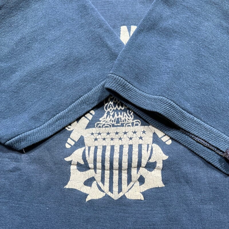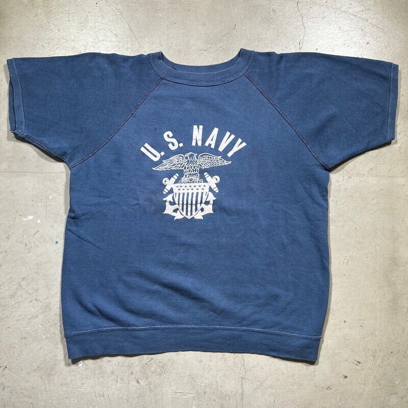 60年代前後頃のU.S.NAVY フロッキープリント半袖ラグランスウェットです。内タグが無いのでボディブランドは不明です。フェードしたネイビーボディにホワイトのプリントが入ります。元々はフロッキープリントだったようですが、経年によりフロッキーの起毛部分はほとんど無くなっております。全体的な色褪せやシミ等がございます。ダメージは特にございません。ミリタリープリント物のスウェットは古着市場で非常に人気も高く、古い年代の物が特に見つかりづらくなっていますので、お好きな方は是非いかがでしょうか。サイズはやや小さめでS~M相当です。季節外な半袖スウェットですが、サーマルシャツとお重ね着で合わせてみてはいかがでしょうか。