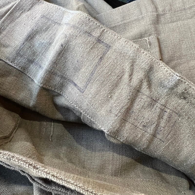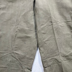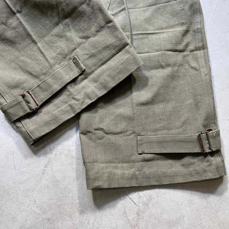 50年代頃のフレンチアーミーM-38モーターサイクルパンツです。厚手でしっかりとしたコットン素材です。M-38モーターサイクルコート(Pコートのようにボタンが配置されているタイプ)と上下で着用するモデルです。フロントはバイク乗車時の防風対策としてエプロン仕様となっております。基本オーバーパンツでゆったりとしているので、ベルトループの無い代わりに縫い付けられているウエストベルトを締め上げて着用します。サイドのポケットは貫通式となっています。多少アタリなど使用感はございますが、特筆するダメージは無くミントコンディションと言える1本です。前掛けを垂らしてのコーディネートも楽しめます。サイズ表記は擦れていますが、、ウエスト実寸W36~37インチ位です。