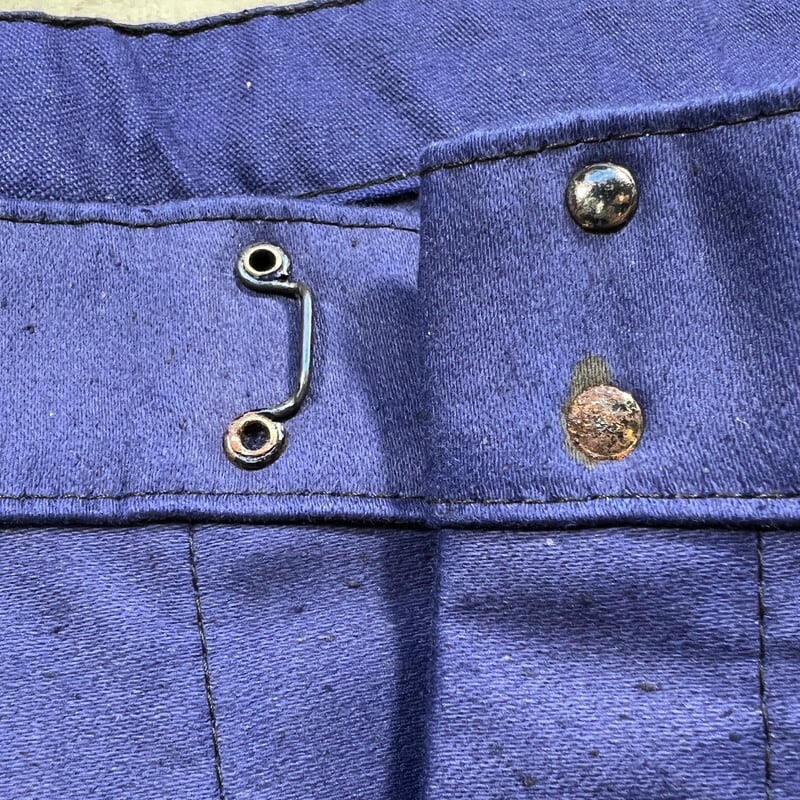 50年代から60年代頃のLE MONT ST MICHELフレンチモールスキンワークパンツです。フランスの老舗ワークウェアブランドとして有名なモンサンミッシェルのアイテムで、フラッシャー付きの貴重なデッドストックです。張りが有り光沢のある生地感です。ボタンホールも留められた形跡も無く綺麗です。フロントのトップの金具に錆が見らえます。長期保管による薄汚れや折りシワや若干のヤケはございますが、さほど気にならないレベルだと思います。サイズ表記は48Mで、ウエスト実寸はW37インチです。未洗いですので、縮みが出る可能性があります。年々モールスキンワークウェアの評価も高くなり、デッドストックも見る機会が少なくなったと思います。フレンチワークの中でも抜群の知名度を誇るモンサンミッシェル社の希少なデッドストックをお探しだった方は是非この機会にいかがでしょうか。