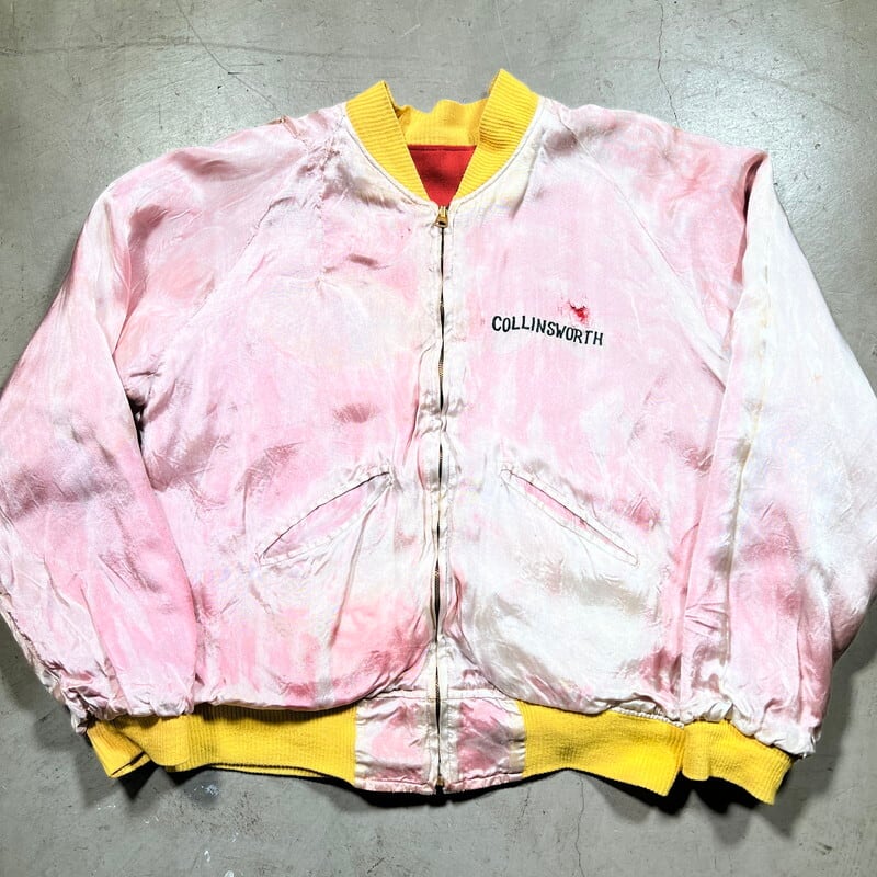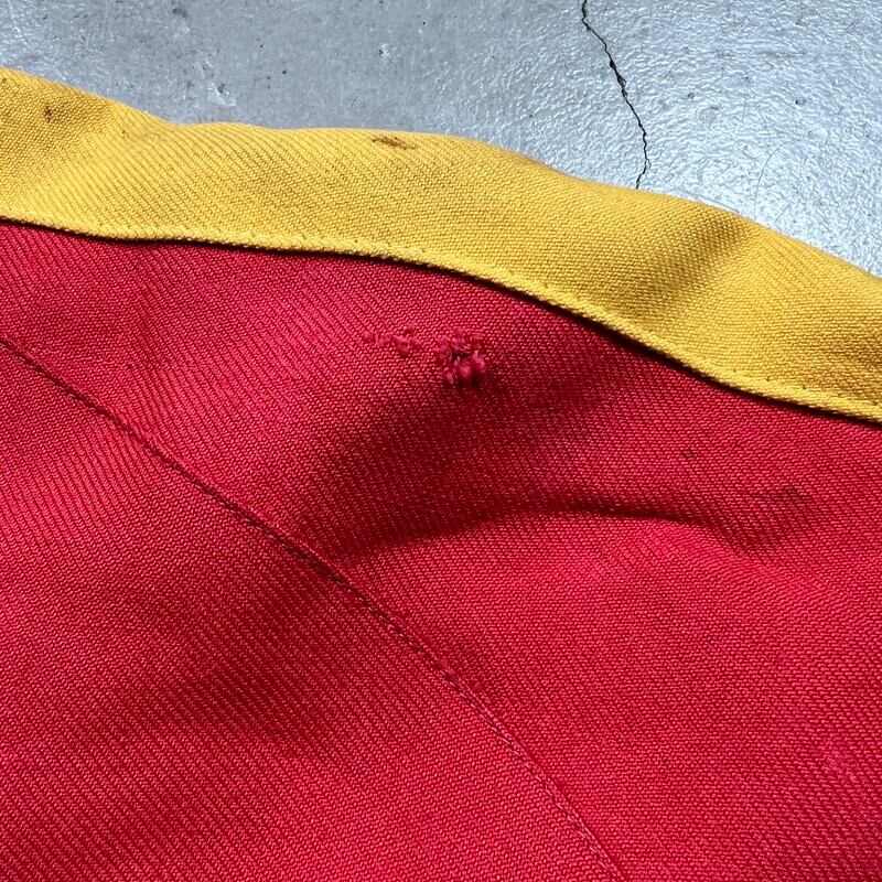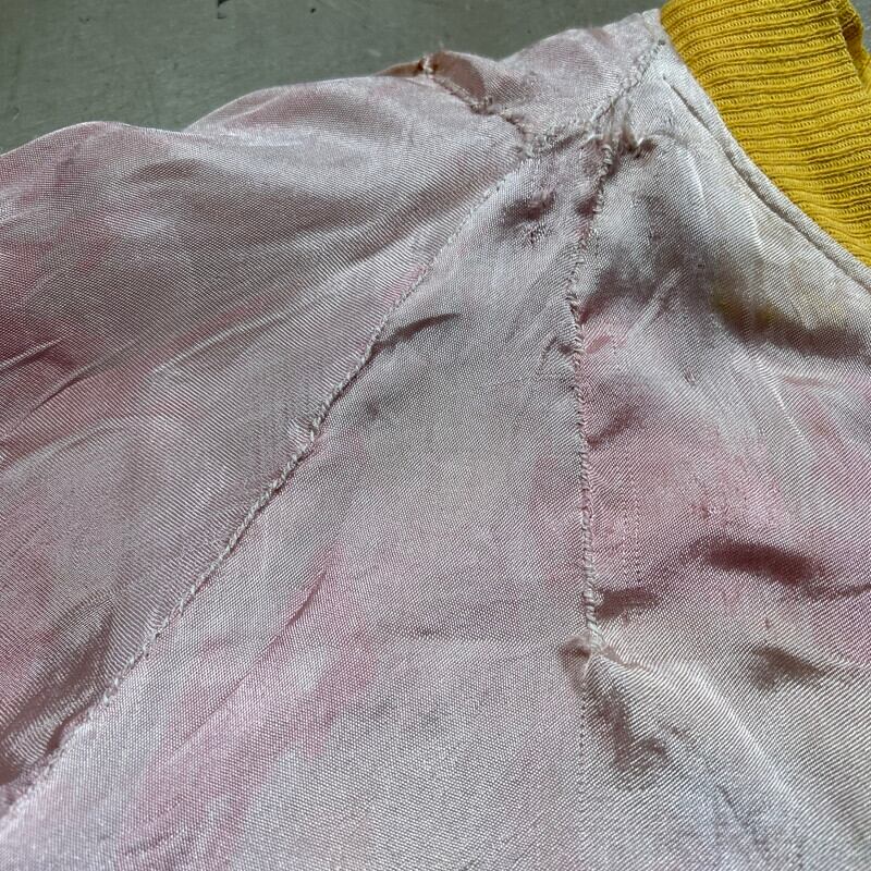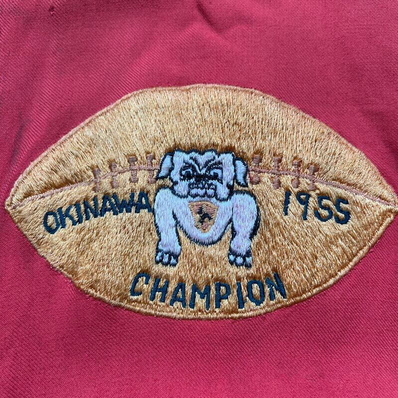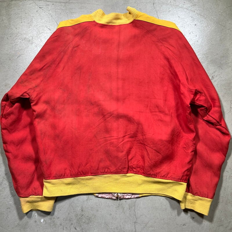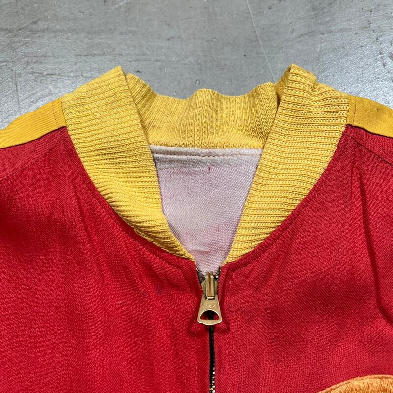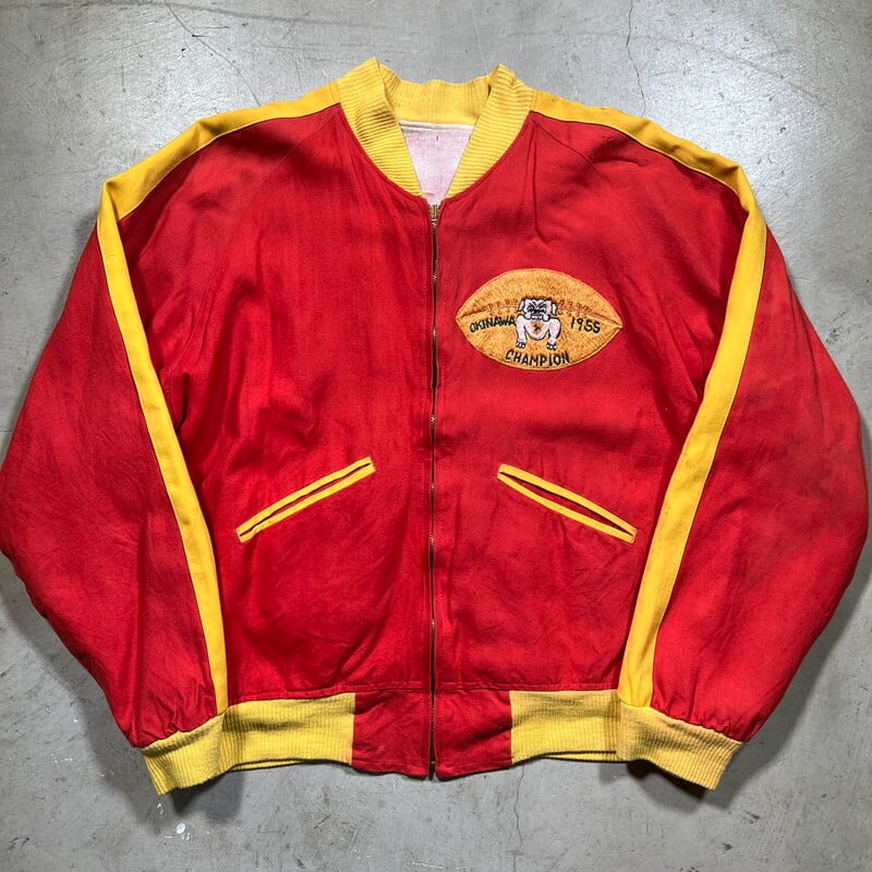 50年代から60年代頃のUnknownリバーシブルスーベニアジャケットです。タグがありませんので詳細は不明ですが、USMC関連のアイテムだと思われます。同年代頃のスカジャンやスーベニアジャケットで見られる回転式のYKKジッパーが使用されています。縫い直し等は見られませんので当時のオリジナルだと思います。表は赤と黄のウールギャバジンが使用され、裏面は白地のサテンとなります。胸元にはフットボールにブルドッグとOKINAWA 1955 CHAMPIONと刺繍が入ります。サテン側の胸元にはネーム刺繍が入ります。全体的に擦れや汚れ、ダメージが見られ、サテン地には色移りやダメージがございます。サテンの方付近に大きな裂けがあった為簡易的ではありますがハンドリペアしていますので、着用に支障は無いと思います。170cm70kgのスタッフで丁度良いサイズ感ですので、M~L相当だと思います。あまり見かけないアイテムですので、お好きな方は是非この機会にいかがでしょうか。