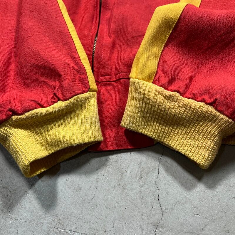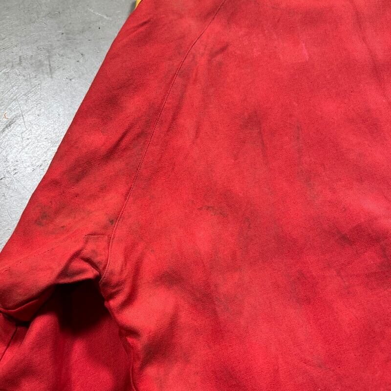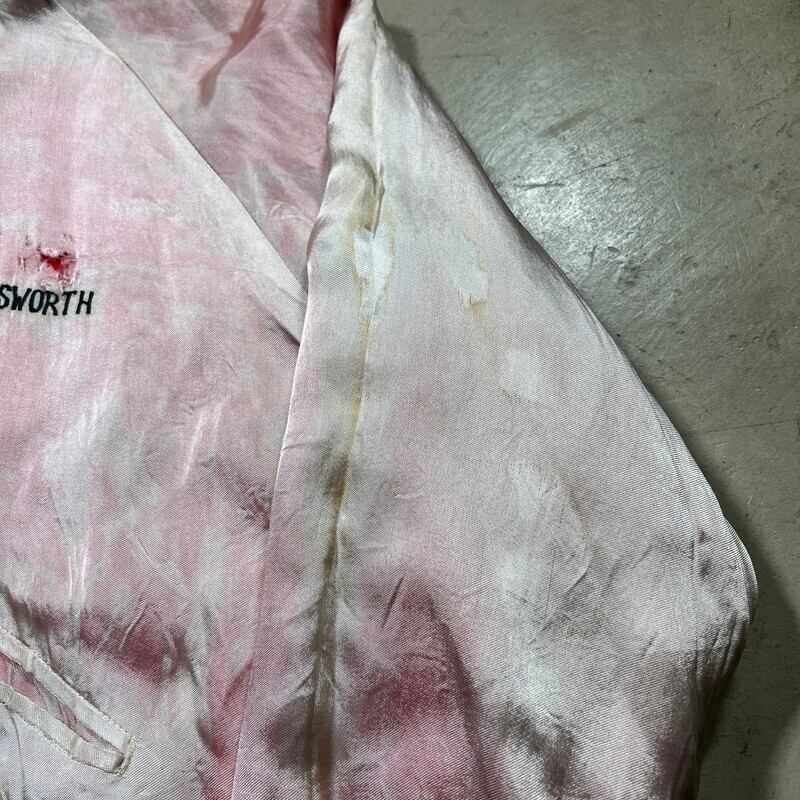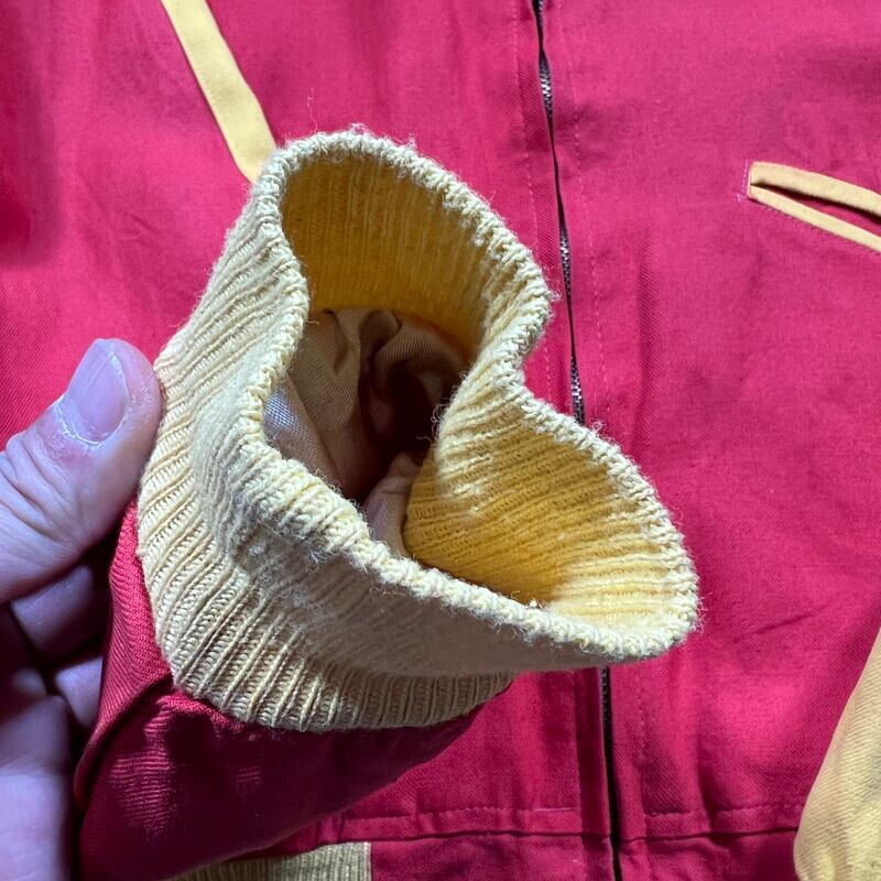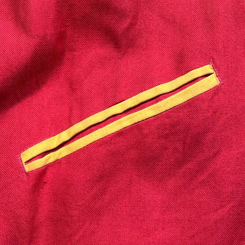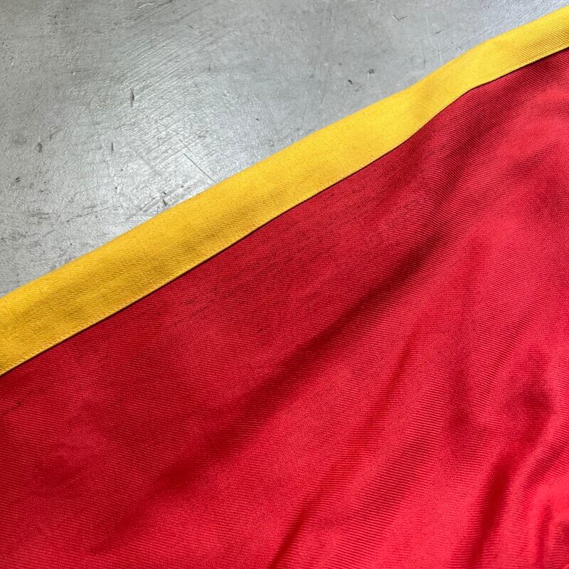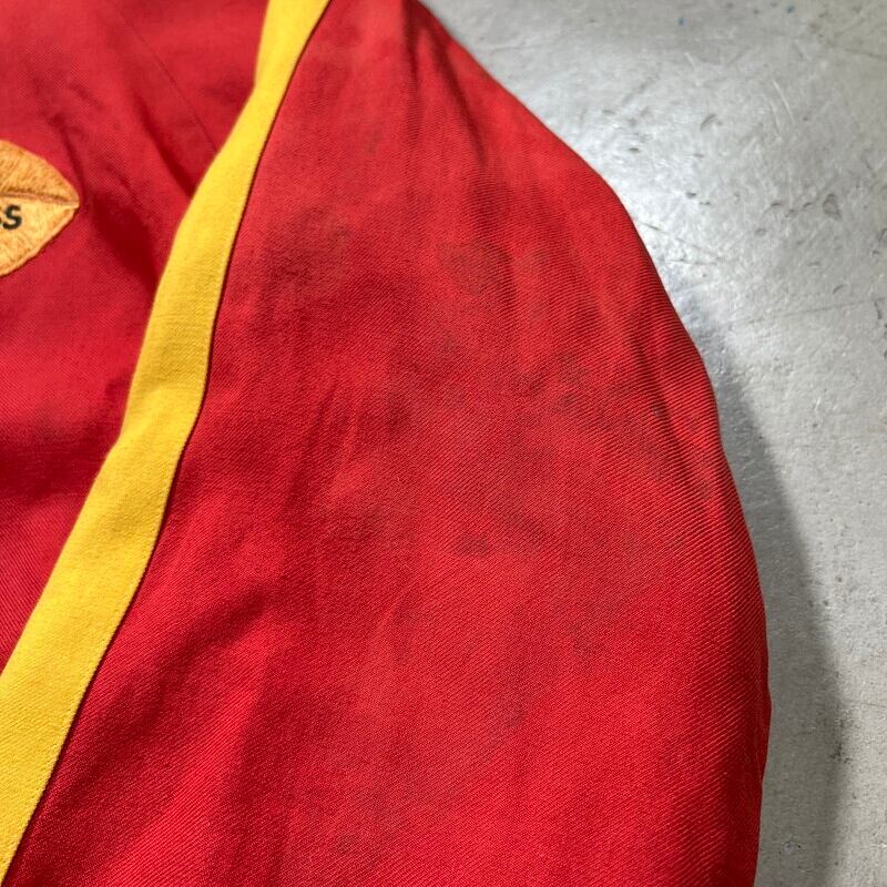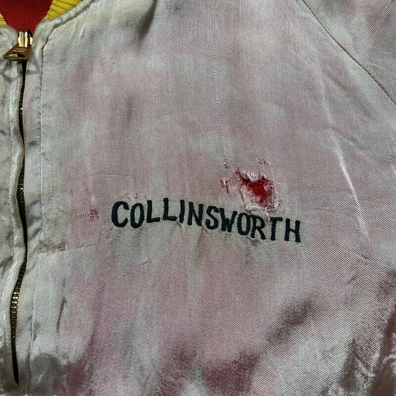 50年代から60年代頃のUnknownリバーシブルスーベニアジャケットです。タグがありませんので詳細は不明ですが、USMC関連のアイテムだと思われます。同年代頃のスカジャンやスーベニアジャケットで見られる回転式のYKKジッパーが使用されています。縫い直し等は見られませんので当時のオリジナルだと思います。表は赤と黄のウールギャバジンが使用され、裏面は白地のサテンとなります。胸元にはフットボールにブルドッグとOKINAWA 1955 CHAMPIONと刺繍が入ります。サテン側の胸元にはネーム刺繍が入ります。全体的に擦れや汚れ、ダメージが見られ、サテン地には色移りやダメージがございます。サテンの方付近に大きな裂けがあった為簡易的ではありますがハンドリペアしていますので、着用に支障は無いと思います。170cm70kgのスタッフで丁度良いサイズ感ですので、M~L相当だと思います。あまり見かけないアイテムですので、お好きな方は是非この機会にいかがでしょうか。