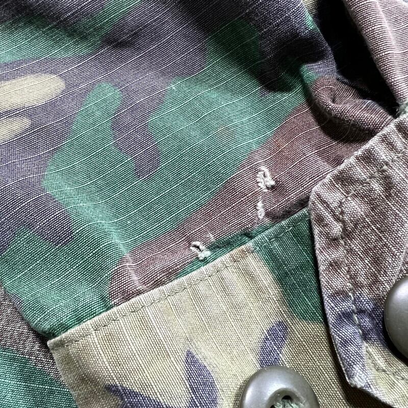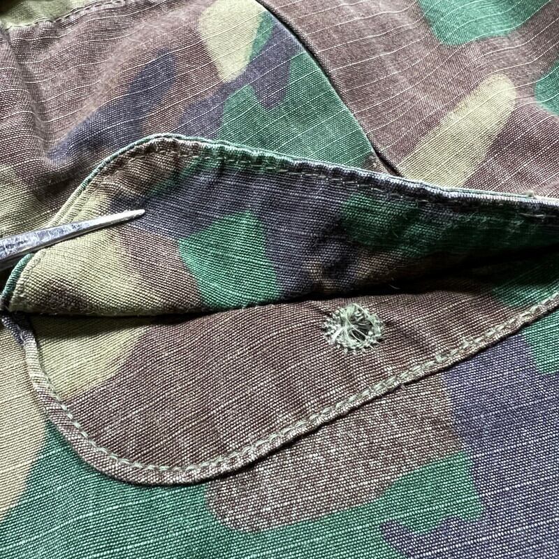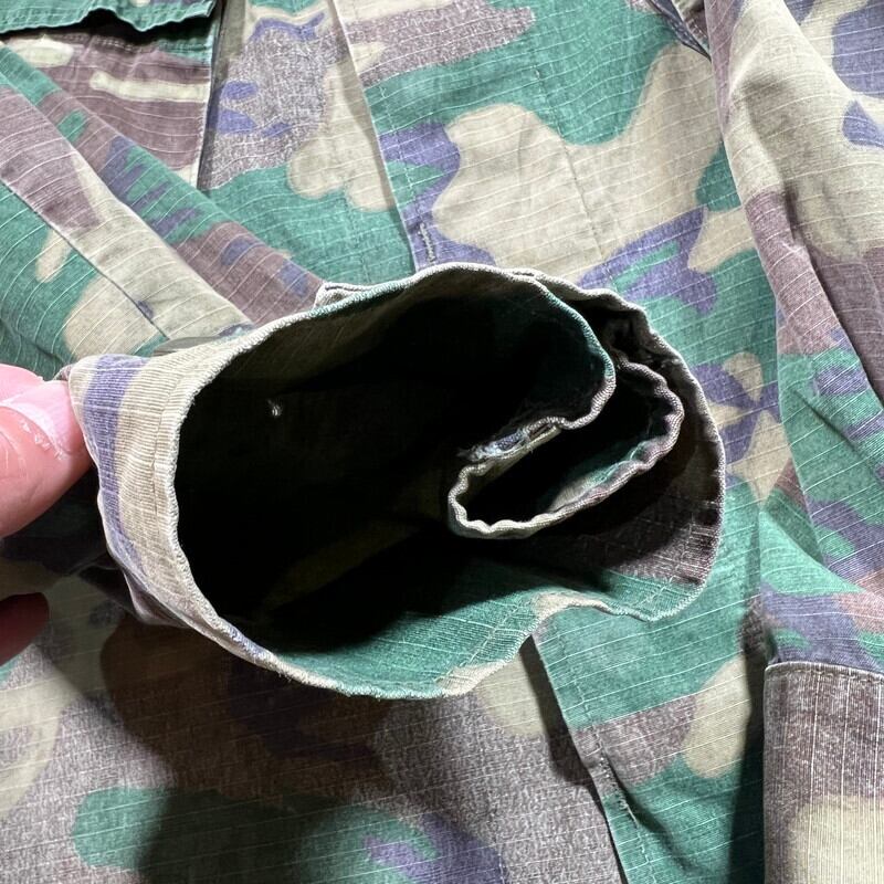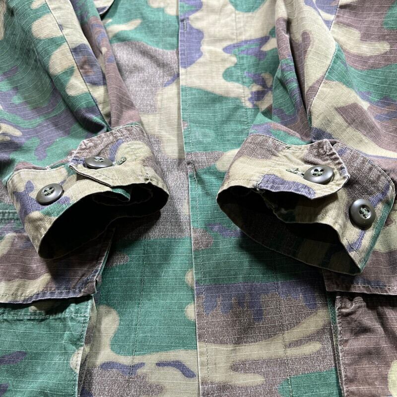 60年代のU.S.ARMYジャングルファティーグジャケットです。コントラクターはRICHARD WYNN ENTERPRISES INC、ミルスペックはDSA100-69-C-2662。NLABS-1ブラウンリーフとはウッドランド迷彩の元となったERDLグリーンリーフの後継パターンです。全体に色褪せがあり、擦れや小穴等がございます。左ハンドポケットにハンドステッチによるリペアがございます。胸ポケット上部のインシグニアは両方とも取り除かれており、USMC[等のスタンプは入っていません。ボタンは全て揃っています。サイズはSMALL-LONGで、着丈がやや長いタイプです。エポーレットが付かない為合わせやすいので、プレーンのジャングルファティーグ同様に人気が高いアイテムです。春先の羽織りに是非いかがでしょうか。