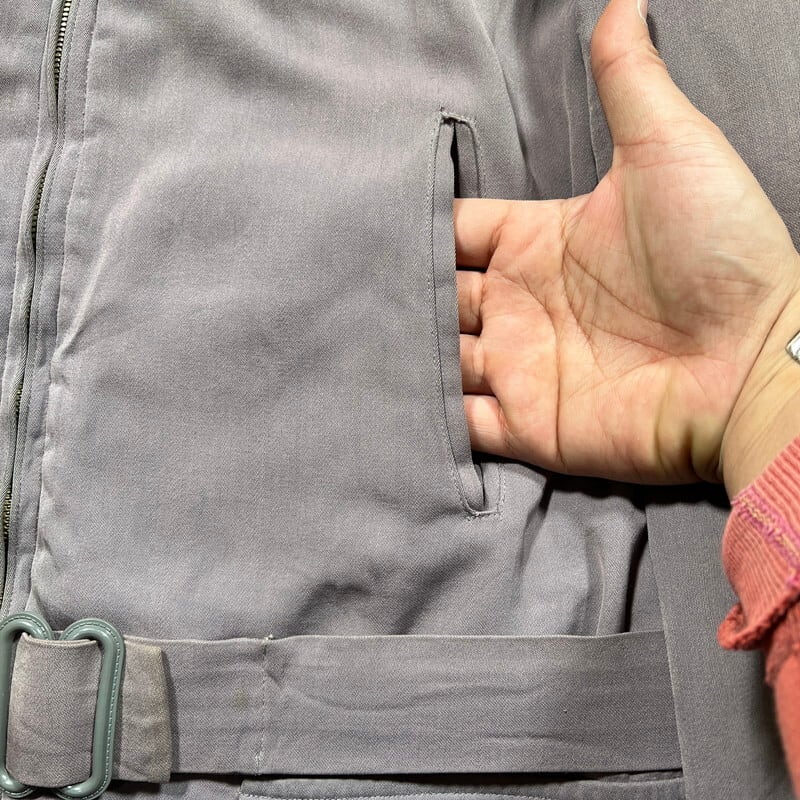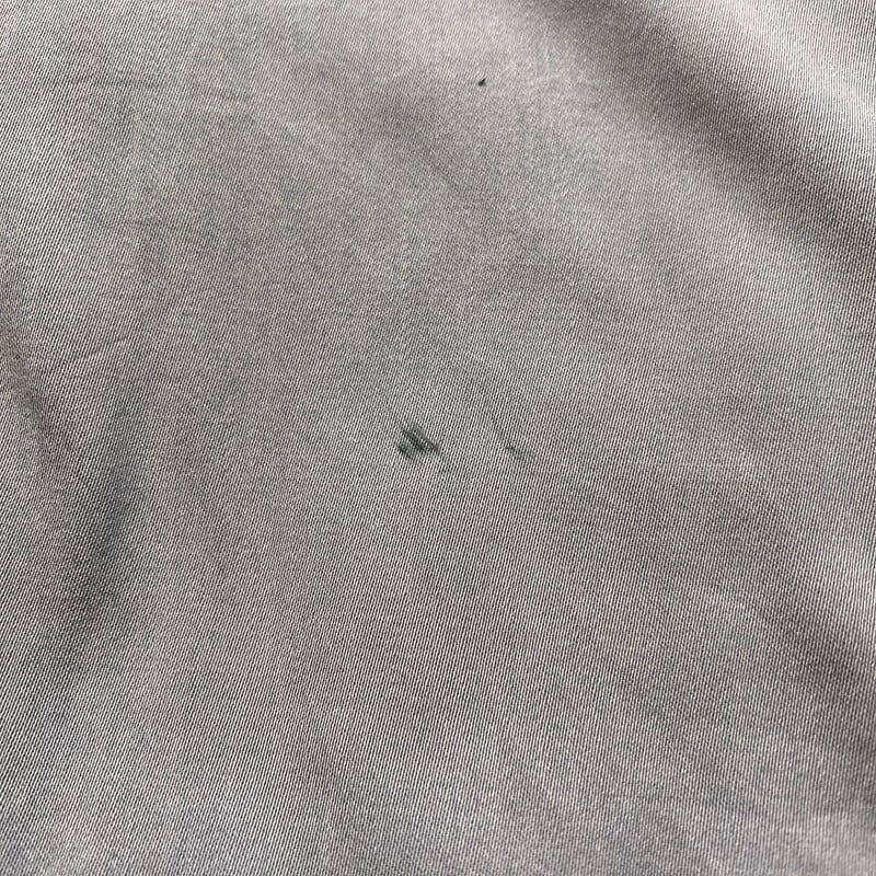 50年代頃のWINDWARDムートンカラーギャバジンジャケットです。WINDWARDとは1872年シカゴで創業したMONTGOMERY WARDが展開していたプライベートブランドで、主にレザー製品やアウターウェア等を製造していたようです。ご紹介するこちらの商品は、ウールのギャバジン織で、リにはリアルムートンがあしらわれています。ライニングは中綿のキルティングです。CROWN社のスプリングピンロックジッパーが使用されています。ウエストのベルトも欠損無く揃っています。淡いラベンダーのようなお色です。この年代のギャバジャン等でも見られる肩パッドが入った仕様です。薄汚れやシミが有り、袖先に小穴がございます。サイズはM~L相当です。野暮ったさは無くすっきりとしたシルエットです。ギャバジャン等がお好きな方は是非この機会にいかがでしょうか。