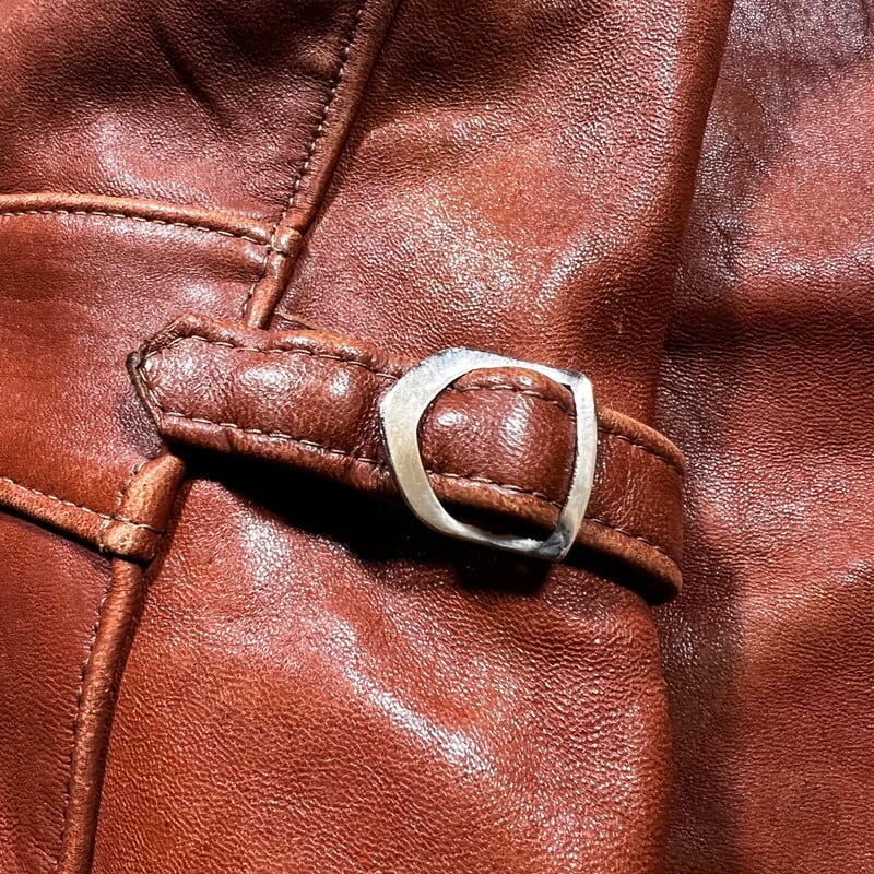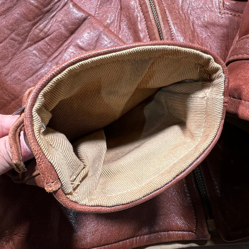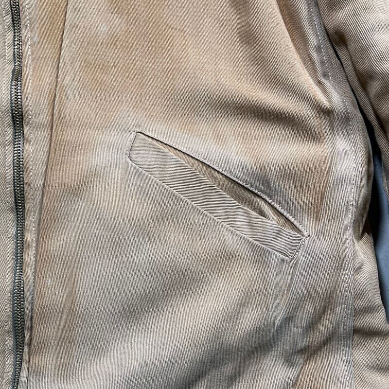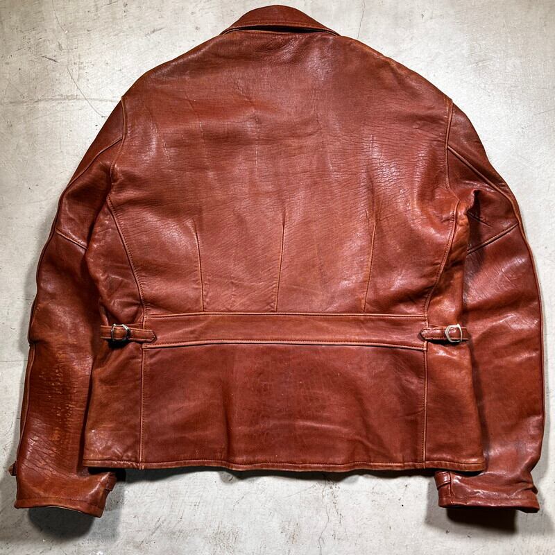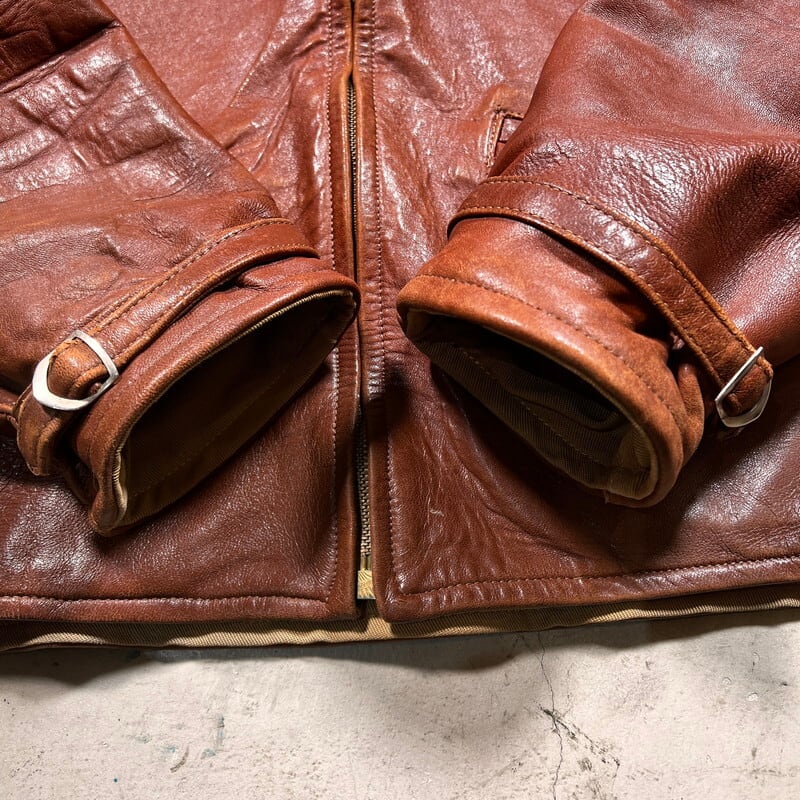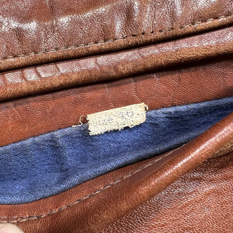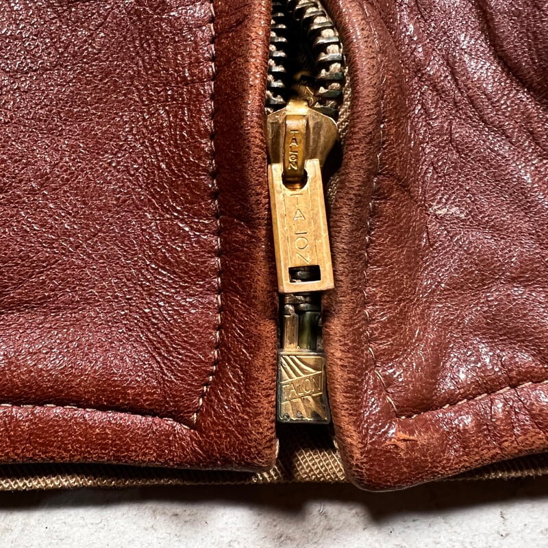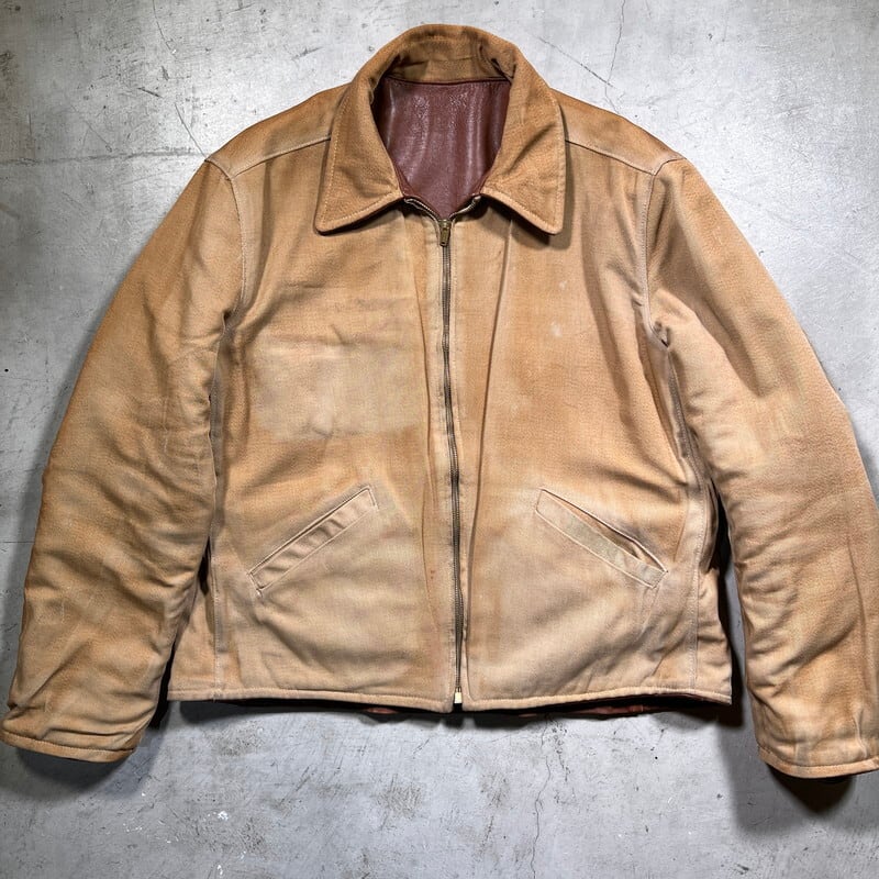 40年代初頭頃のUnknownレザースポーツジャケットです。タグが付いていない為ブランドは不明です。フロントのジッパーエンドはデコTALON、胸元にはボールチェーンのTALONが使用されています。ジッパーボトムにB1の刻印が有り、1931年もしくは1941年にこのジッパーが製造されたようですが、総合的に判断するならば後者の1941年製造だと思います。レザーのスポーツジャケットでは珍しいリバーシブル仕様で、表面は柔らかくしなやかなシープスキン、裏面はコットンのギャバジン織で構成されています。袖とサイドにアジャストベルトが付きます。レザー面に擦れ等は見られますが硬化やダメージは無く良好です。ギャバジン面はシミや汚れが全面にございます。こちらもダメージは特にございません。30年代から40年代頃にリーバイス社が今回ご紹介したアイテムに似たリバーシブルのスポジャケを製造しており、LVCから復刻モデルも販売されています。細かな仕様は違いますが、レザーとギャバジンの組み合わせも酷似しています。もしかすると,,,といった妄想も楽しいかと思います。この年代のアイテムでは希少なサイズ46!レザージャケットはサイズで諦めていた方もいらっしゃると思いますのでお探しだった方は是非この機会にいかがでしょうか。
