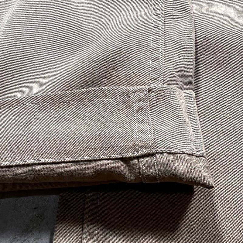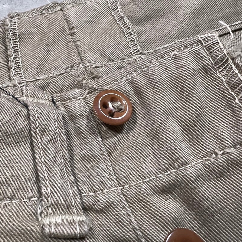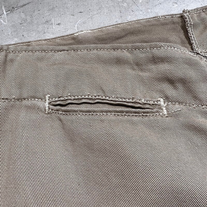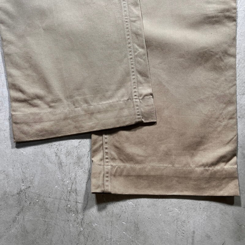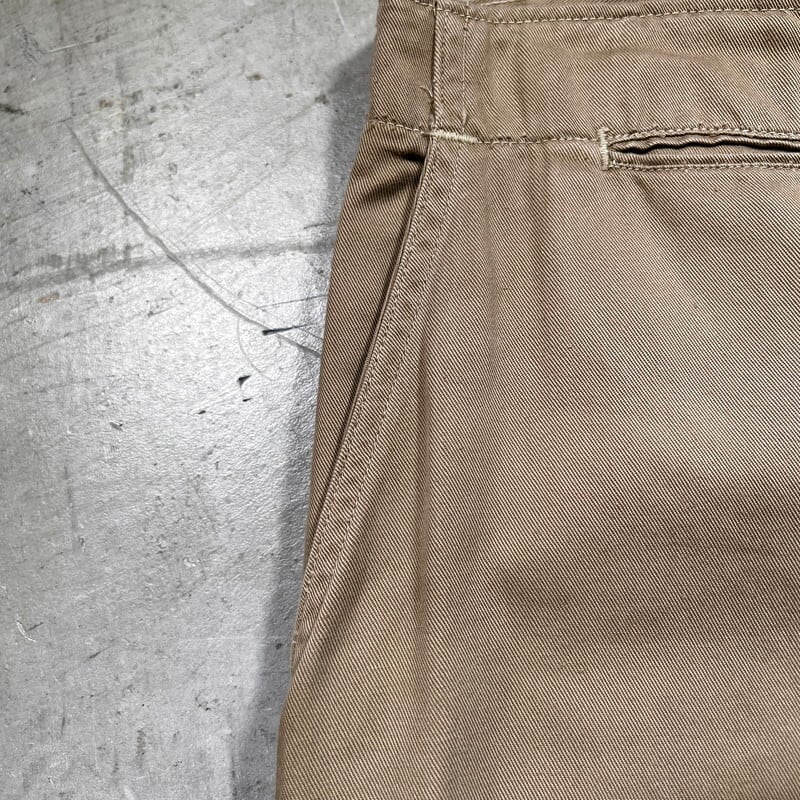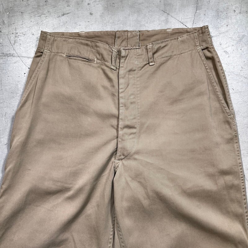 40年代頃のUSMCミリタリーチノトラウザーズです。ミルスペックは欠損しています。バックポケットにフラップが付くタイプで、スレーキはボディと同じ共布が使用されています。コインポケットは両玉縁、アウトシームはこの年代に見られるダブルステッチ。ボタンは全てオリジナルで、全て隠れる比翼仕立てとなっています。多少の使用感はあり、バックのセンターステッチを1インチ程拡張した形跡がございます。その他目立つダメージや汚れはございません。ウエストはW32インチとゴールデンサイズです。ミリタリーチノらしいワイドなシルエットでオススメです。ヴィンテージチノでも枯渇傾向にあるダブルステッチ仕様ですのでお探しだった方は是非この機会をお見逃しなく。