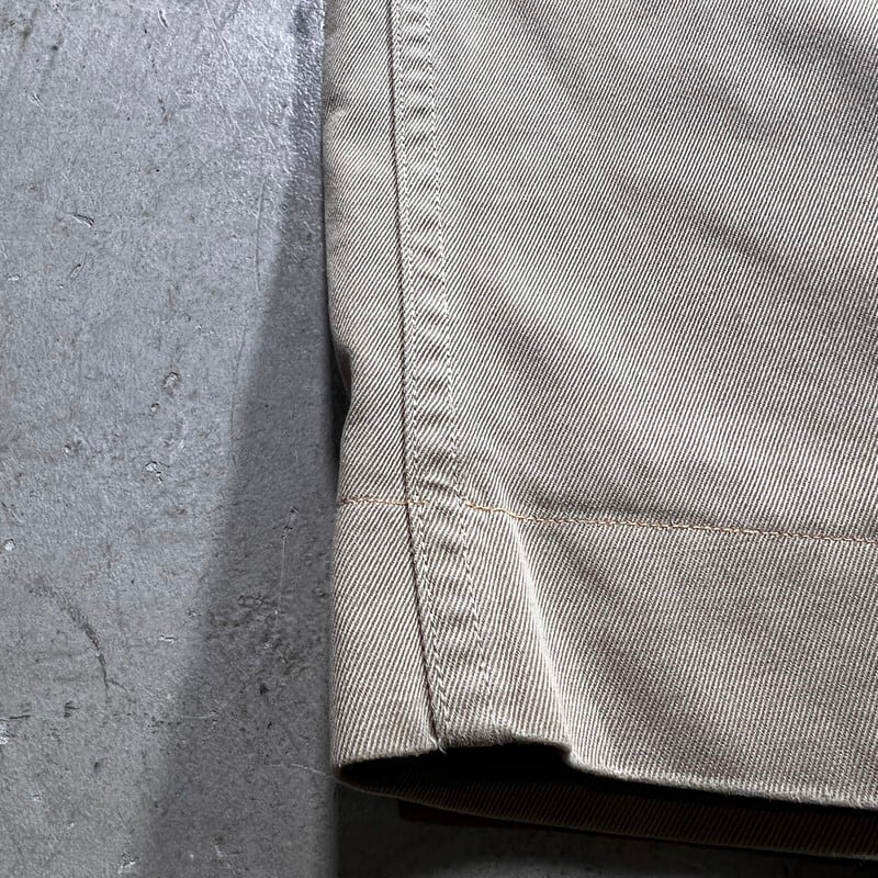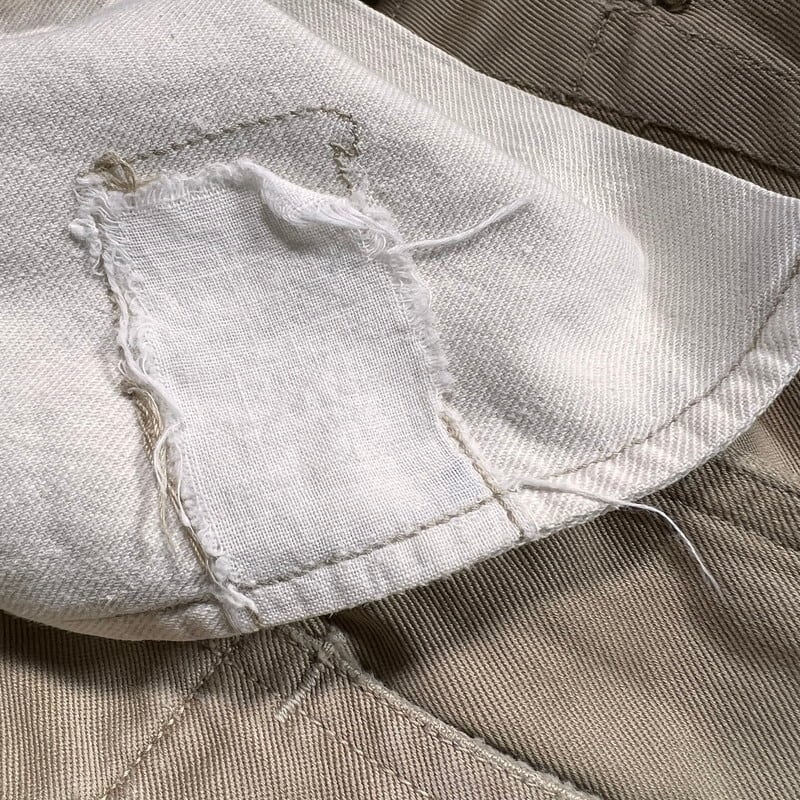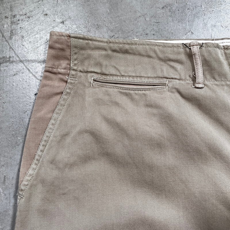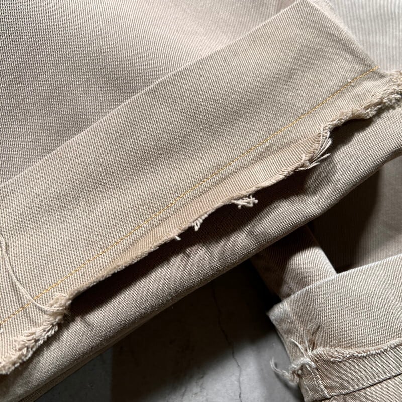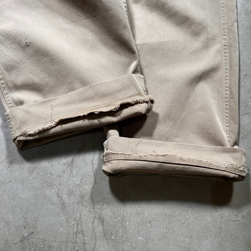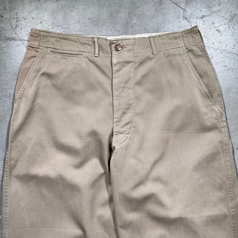 40年代のU.S.ARMY 45KHAKI チノトラウザーズです。M-1941、M1943に続き人気の高いヴィンテージチノとして知られるこちらは、フロント尿素ボタン、両玉縁のコインポケットとバックポケット、斜めのフロントポケット、アウトシームはダブルステッチです。スレーキ裏のミルスペックは擦れており詳細は不明ですが、MIL-T-2064で間違いないかと思われます。45KHAKI 以降の片玉縁では無く両玉縁仕様のポケットですので、45KHKIとしては初期頃のディティールだと思います。ベルトループは細いタイプでオフセット仕様です。右サイドとベルトループの一部に色違いの生地が使われた2トーンというのもポイントが高いのでは無いでしょうか。右脛に小さなダメージが見られますが、着用に支障はございません。レングスは簡易的に裾上げされています。その他多少の使用感や擦れなドはございますが、目立つ汚れも無く良好です。MIL-T-2064シリーズも色々な仕様で存在しますが、中でもダブルステッチタイプを探されている方が多いように感じます。ウエスト表記はW34ですが、実寸はW33位。お探しだった方は是非この機会にいかがでしょうか。