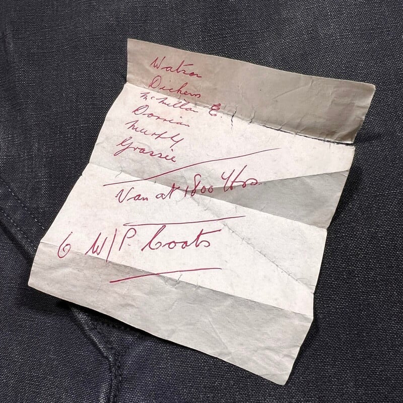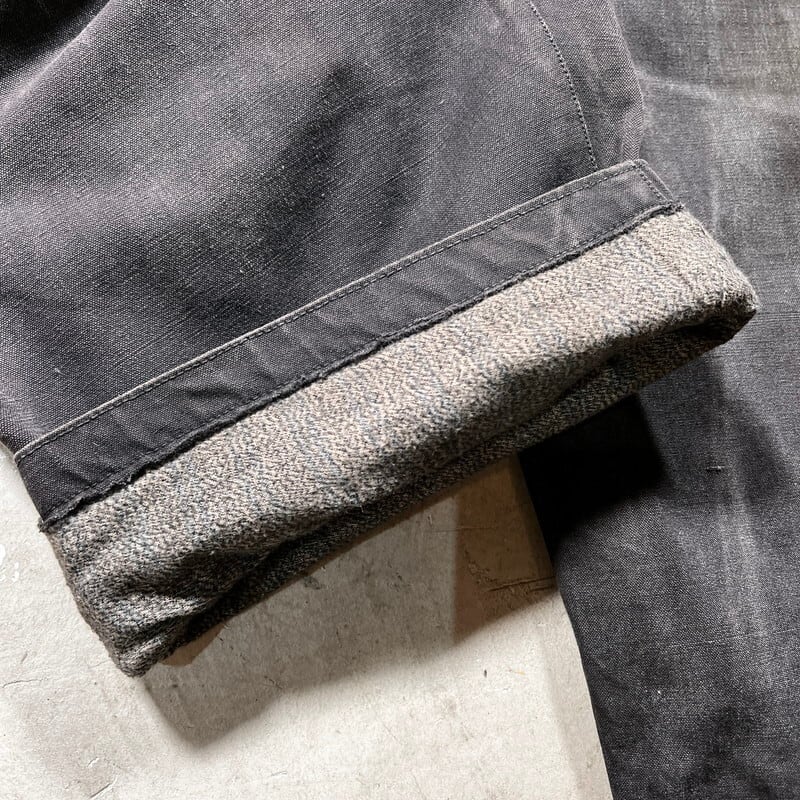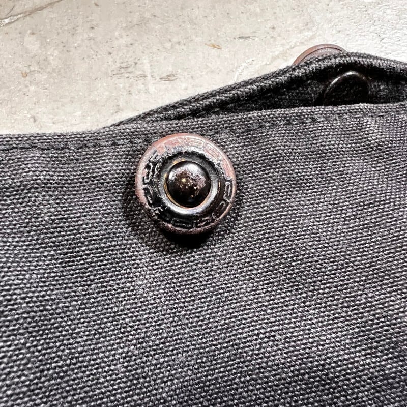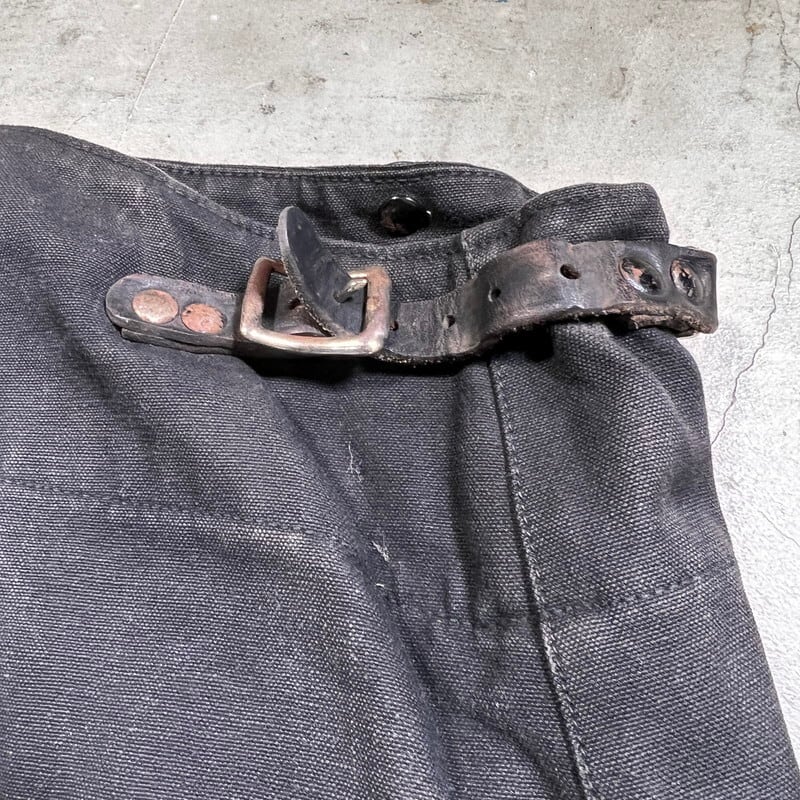 40年代頃のC.H.PETCHファイヤーマンパンツです。C.H.PETCHはカナダのオタワで人や物を雨や日差しから守る粗布製の天蓋等を製造していたメーカーです。少し前に入荷したファイヤーマンパンツと同じ製造メーカーの物が今回なんとセットアップで入荷しました。ご紹介するこちらのパンツは、しっかりとしたキャンバス生地にネルの様なライニングが付く仕様です。ウエストには打ち込みのサスペンダーボタンと、レザーのアジャスター、フックが付きます。ボタンやフックの欠損は無く全てオリジナルで揃っています。使用感や色落ちは見られますが、ライニングも綺麗に残っており、年代や使用用途を考慮するとかなり状態は良いと思われます。ウエストは実寸でW38インチ位ですがサイドのベルトで2インチ程絞る事が可能です。今回もポケット内からメモが出てきましたが、何かの走り書き程度で前回の歴史背景のような物は感じれませんでした。ブラックカラーが程よく褪色し墨黒のような色合いに変化しており、雰囲気の良いお品です。お探しだった方は是非この機会にいかがでしょうか。寒い季節にバイクに乗られる方にもお勧めしたいアイテムです。コートとセットで着るとかなり渋いです。是非!