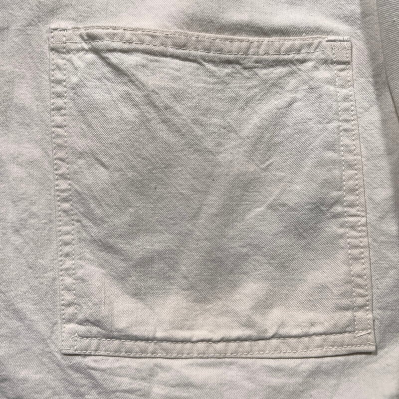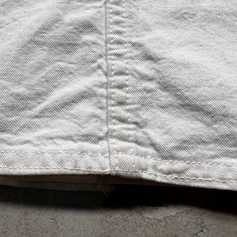 30年代頃のDUBBLEWAREホワイトコットンカバーオールです。1920年代にマサチューセッツ州のボストンで創業したM.HOFFMAN&CO.INC.が展開していたワークウェアブランドです。ご紹介するこちらは、フロント4つボタンに四角形に角ばったポケットが3つ配置された古いディティールが見て取れます。ヴィンテージのアーカイブ本等で見かける事が多い、アップルプリントが施されたカバーオールの無地ヴァージョンで、非常に珍しい個体です。カフスボタンの付き方も特徴的です。胸ポケットにはかなりうっすらとですが、何かの絵が描かれていたような跡があり、メモリアルジャケットの類だったのかもしれません。胸ポケットに細かな擦れがございますが、その他特筆するダメージや汚れの無いミントコンディションです。表記はございませんが32~34位の小さめサイズです。女性や小柄で細身な男性にお勧めです。なかなか見る事がない希少なカバーオールですので、コレクションにいかがでしょうか。