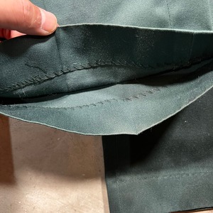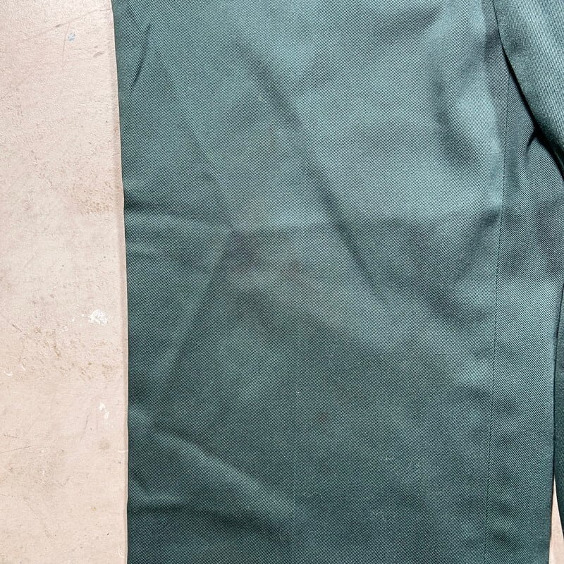 70年代頃のLee CHETOPA TWIIワークパンツです。Lotナンバー110-5330。1952年にアメリカのカンザス州のChetopaで開発されたのがこのチェトパツイルです。ダークグリーンカラーで、ゆったりとしたすとれーとシルエットです。フロントには42TALONが使用されています。ポケットスレーキにユニオンチケットが縫い付けられています。膝付近にうっすらとシミのような物がございますが、暗めな色味の生地なので、さほど目立たないと思います。その他ダメージは特にございません。ウエスト表記はW31インチですが、実寸はW30インチです。程よい太さで革靴はもちろんですが、スニーカーとの相性も良いと思います。サイズが合う方は是非この機会にいかがでしょうか。