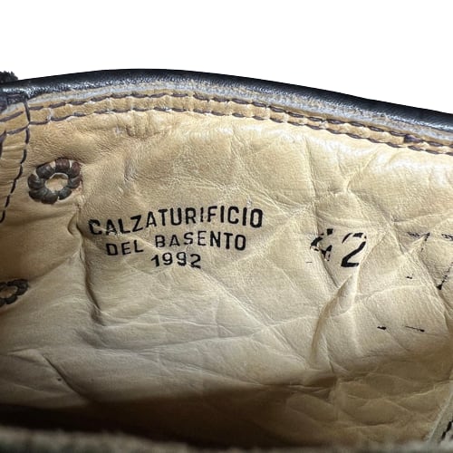 90年代のUnknownマウンテンブーツです。詳細は不明ですが、1992年製のイタリア軍の官給品だと思われます。MERREL社のマウンテンブーツのように非常にシンプルなデザインで、防寒防水に優れたノルウェイジャン製法で作られております。ソールにはvibram社のラギッドソールが採用されております。つま先はスチールトゥ仕様ですので、安全性も高い作りです。多少の使用感はございますが、目立つ大きなダメージは無くコンディションは良好です。本体自体の同じサイズですが、アウトソールの長さは右足の方が若干大きくなっています。足を通した感じはさほど気にならないですが、気になる方はソールの交換もしくは靴のリペア屋さんに削ってもらって調整しても良いかと思います。マウンテンブーツですが、野暮ったさが無いので色々なスタイルで合わせていただけます。個人的にオススメな1足です。