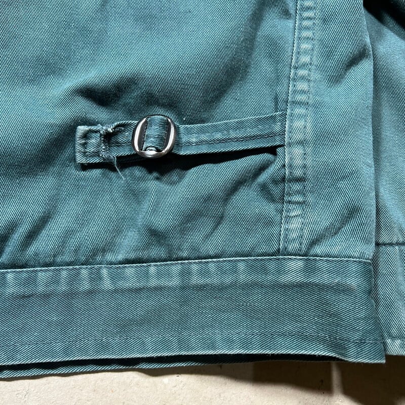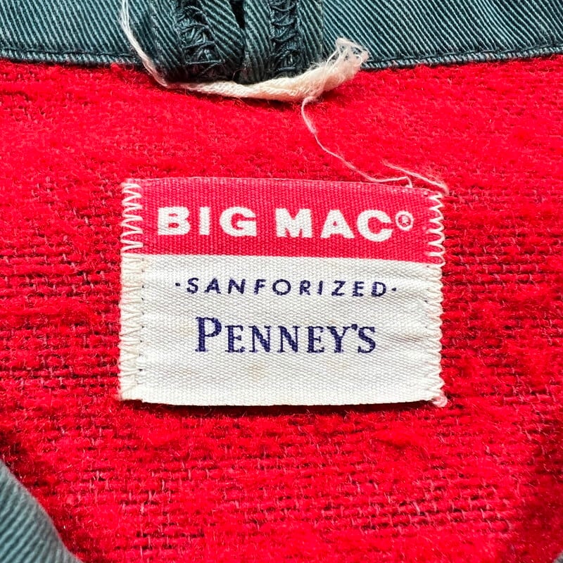60年代頃のBIG MACコットンツイルワークジャケットです。アメリカ3大ストアブランドとして有名なJCPennyのプライベートワークブランドです。ご紹介するこちらのアイテムは、ワークウェアで良く使用されるコットンツイル地にアクリルのボアライナーが付いたモデルです。フロントはアルミのデカTALONジッパーが使われています。使用感があり、全体的に程よくフェードしています。袖先等に細かな擦れ等ございますが、目立つ汚れやダメージはございません。ジッパーの引手が若干歪んでいますが、開閉に支障はございません。袖のボタンが1個づつ欠損しており、左のボタンはつけかえられています。サイズ表記は判読できませんが、恐らく44位だと思います。この手のワークジャケットは比較的小さいサイズを目にすることが多いと思いますので、お探しだった方は是非いかがでしょうか。シンプルなデザインですので合わせやすいアイテムです。赤いボアライナーがアクセントでオススメです。