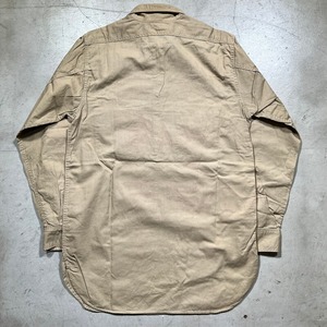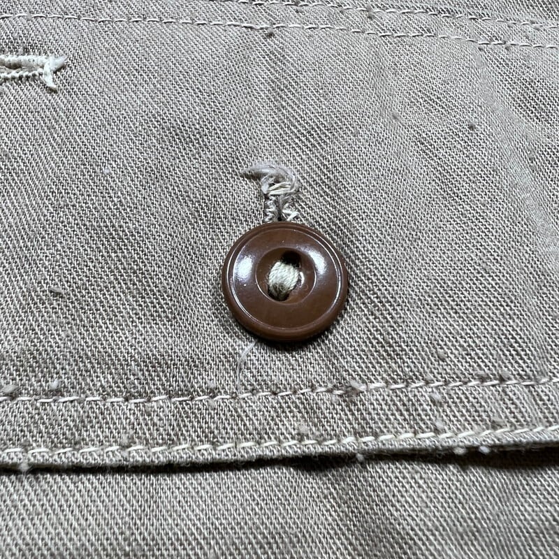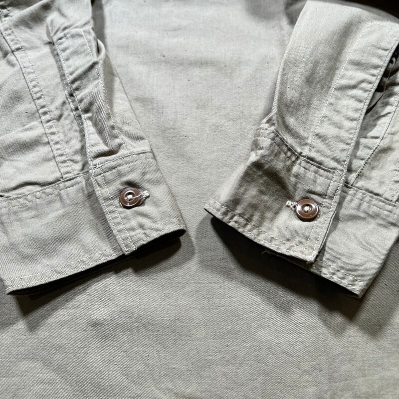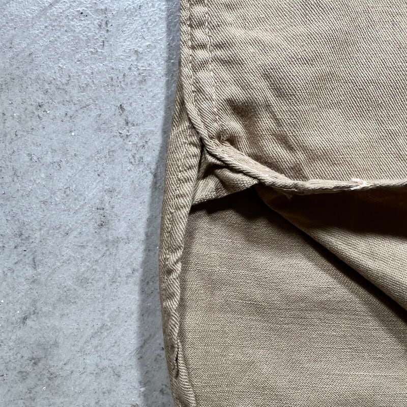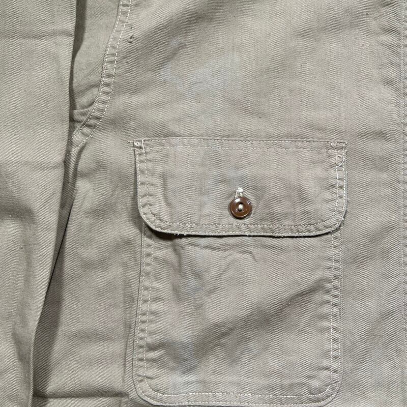 40年代頃の5BROTHERハーフジップワークシャツです。1890年にニューヨークで創業したブランドです。薄手のチノクロスのワークシャツで、ハーフジップのプルオーバータイプです。襟はシングルステッチのロングポイントで、短いチンストラップが付きます。その他の縫製は全てダブルステッチです。サイドにマチが付きます。ジッパーはWALDES社のKOVERZIPが採用され、ジッパーを閉めた際に歯が表から見えなくなる仕様となっております。右胸アタリに若干の変色がありますが、使用感は少なくその他汚れも殆どございません。右のアームホール付け根にピンホールが1カ所ございますが、総合的に見てもミントコンディションと言える個体だと思います。サイズ表記はございませんが、先日オンラインにアップしたBIG YANKのワークシャツに比べると一回り程大きいので38位だと思います。このKOVERZIPが採用されたワークシャツはなかなか見る機会も少ないのではないでしょうか。サイズも状態も良いスペシャルなアイテムですので、お探しだった方は是非春先の1軍に加えてみてはいかがでしょうか。