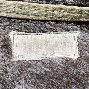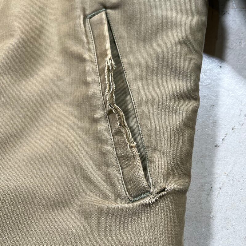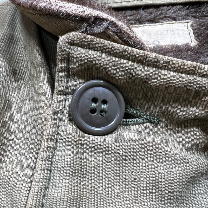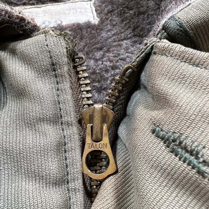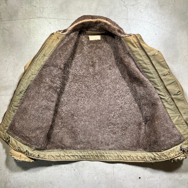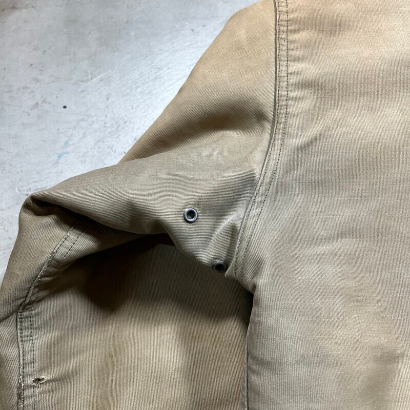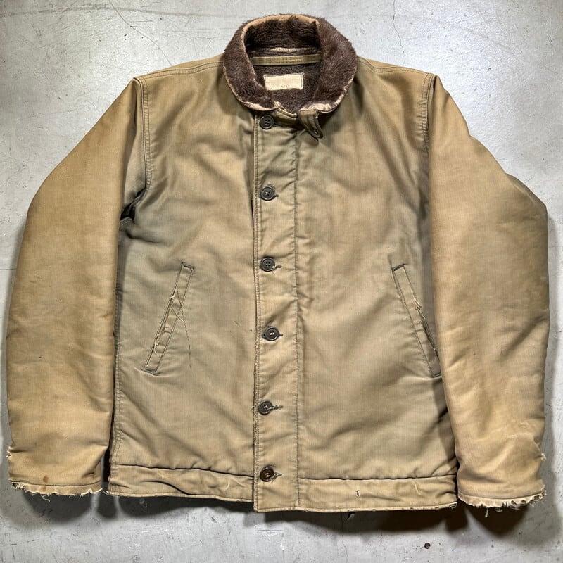 40年代頃のU.S.NAVY N-1デッキジャケットです。米海軍の甲板上での作業用として知られ、USNでは1番の知名度を誇るアイテムです。ネイビーカラーからカーキボディに移行したのが1944年頃で、45年から50年代初頭までのモデルと思われます。胸元のステンシルはほとんど消えています。裏地は100%アルパカライナーで、袖裏にはアルパカは使用されていません。コの字留めのTALONジッパーで、差し込み部にダメージがあり、コツはいりますが一応開閉は可能です。襟元のアルパカに抜け、ポケット縁や袖口、裾裏等にダメージがございます。全体的にヤケや薄汚れ等ございますが、リペア等していただくと長く着用していただけます。N-1デッキジャケットはダメージが酷い物も良く見かけますが、比較的良好な部類だと思います。サイズは38です。雰囲気のあるお品ですので、ダメージやリペアを楽しんでいただける方は是非いかがでしょうか。