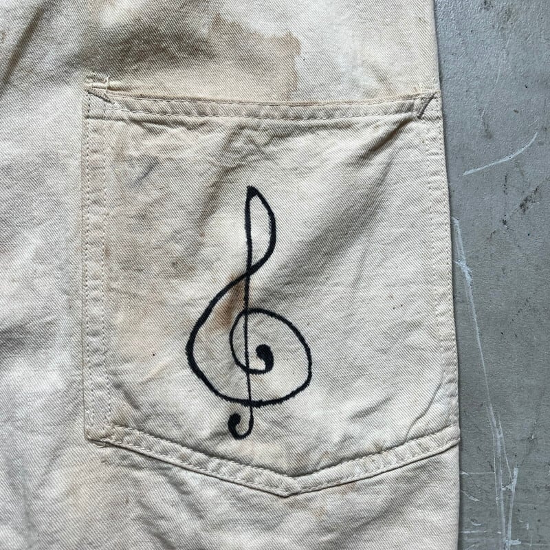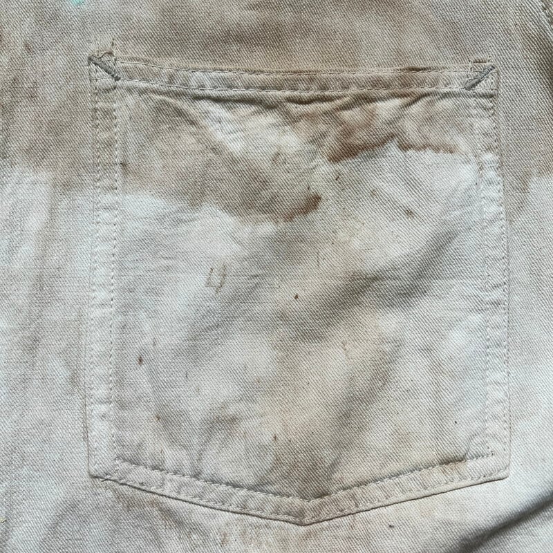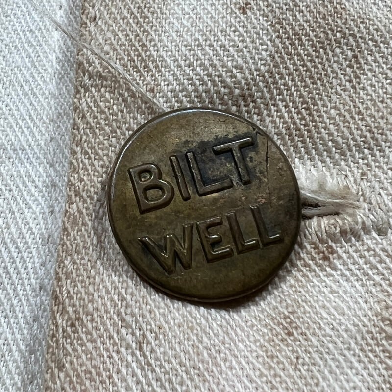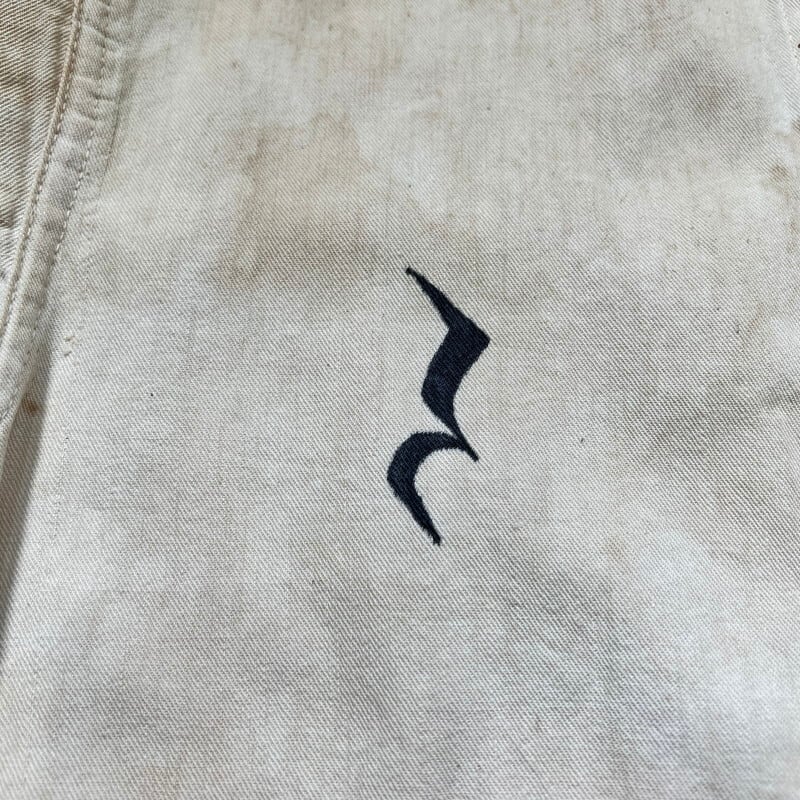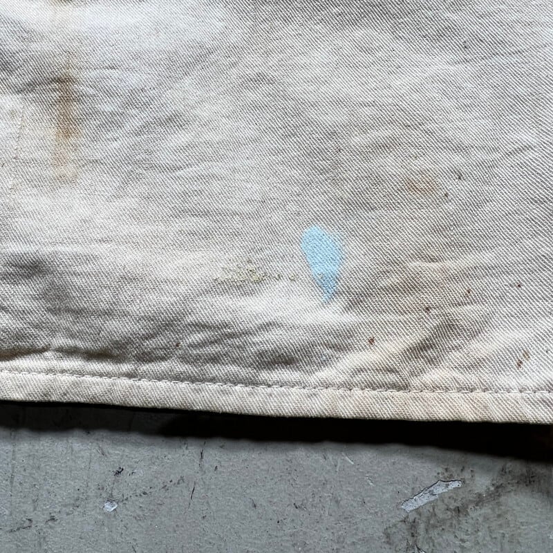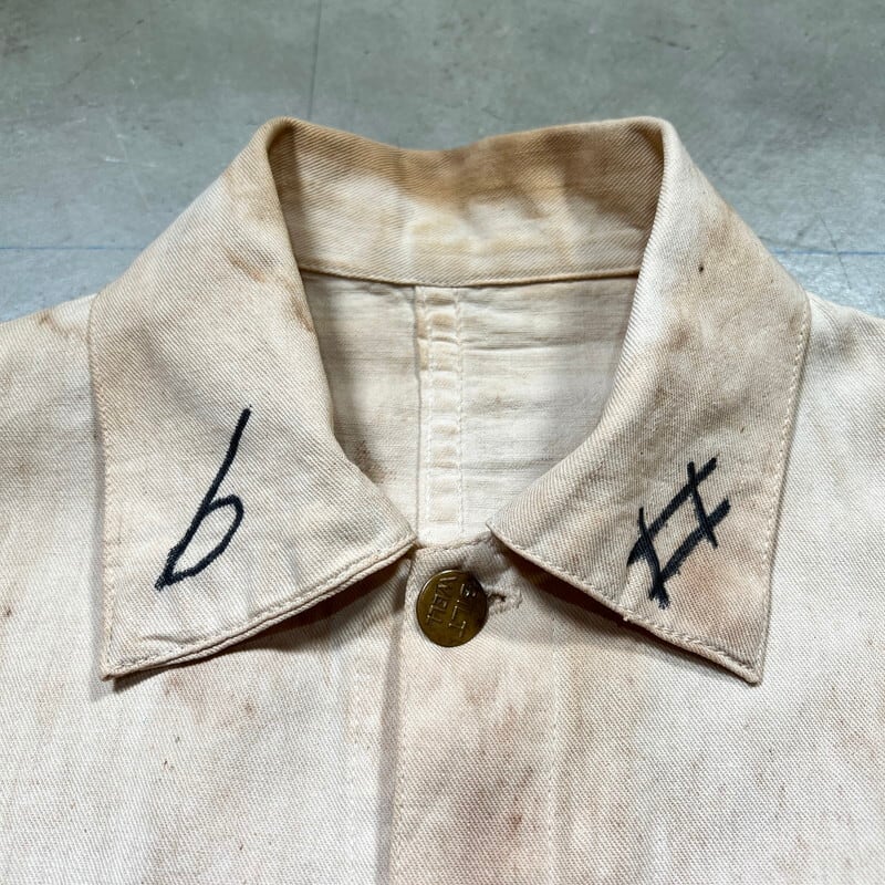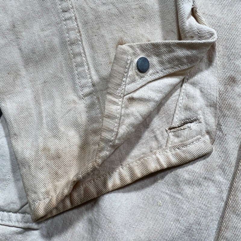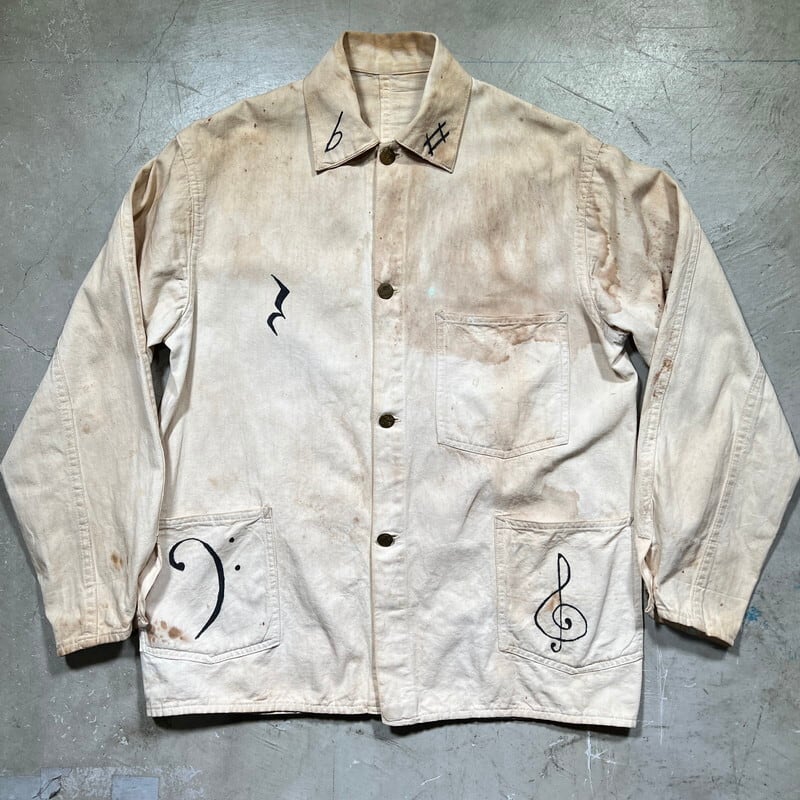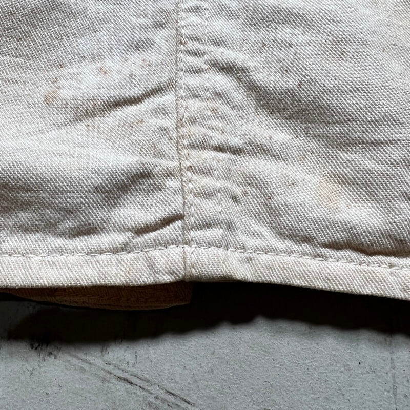 30年代から40年代頃のBILTWELLホワイトコットンカバーオールです。マサチューセッツ州ボストンのNEW ENGLAND OVERALL 社が手掛けていたワークウェアブランドです。ご紹介するこちらのアイテムは、襟や袖、背面にハンドペイントが施された所謂メモリアルジャケットです。背面に描かれた飛行機から推測すると、1933年にミズーリ州カンザスシティで創業したLuscombeAircraft社が、1934~1935年頃に設立したラスコム航空学校の生徒による手書きのメモリアルジャケットと思われます。背面のLUSCOMBE”65”とは、ラスコム50(モデル8)で使用されていたA-50エンジンからA-65エンジンを搭載した後継機であるラスコム8Aを指しているのでは無いでしょうか。ラスコム航空学校の研修生は工場で働いてたとされていますので、新型の8Aの制作に携わっていた生徒たちが卒業の記念に描いたと思われます。左袖には製図や整備等で使用するL字定規やレンチ、ハンマーが描かれています。その他は音符等の音楽記号が描かれています。社名が浮き彫りの打ち込みボタンに、角ばった3つポケットと古さが際立つディティールです。全体にシミ汚れがございますが、生地のコンディションは良好です。背面に小さなピンホールが2カ所ほどございますが、着用に支障はございません。以前オンラインにアップしたDUBBLEWAREのコットンカバーオールに比べると一回りほど大きいので、細身な方ですと男性でも十分に着用できるサイズです。1度軽く洗濯はしていますので、見た目以上に衛生的です。シミが気になる方は染み抜きのプロにお願いしてみてもいいかもしれません。80~90年という長い時間をかけてできた経年変化は、意図的には作り出せない世界に一つのアートピースという認識で向き合った方がロマンがあるのかなと思います。ヴィンテージのメモリアルジャケットは探すとなかなか出会わないコレクターズアイテムですので、サイズが合う方でこの少しシンプルなイラストがお好きな方は是非この機会にいかがでしょうか。