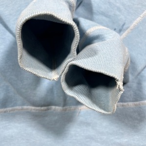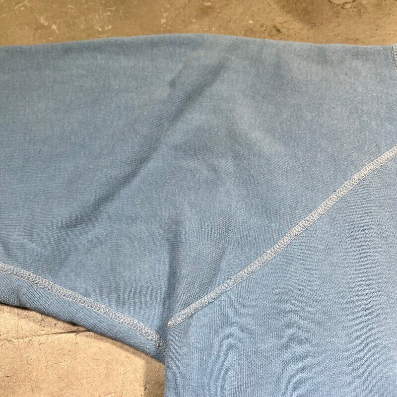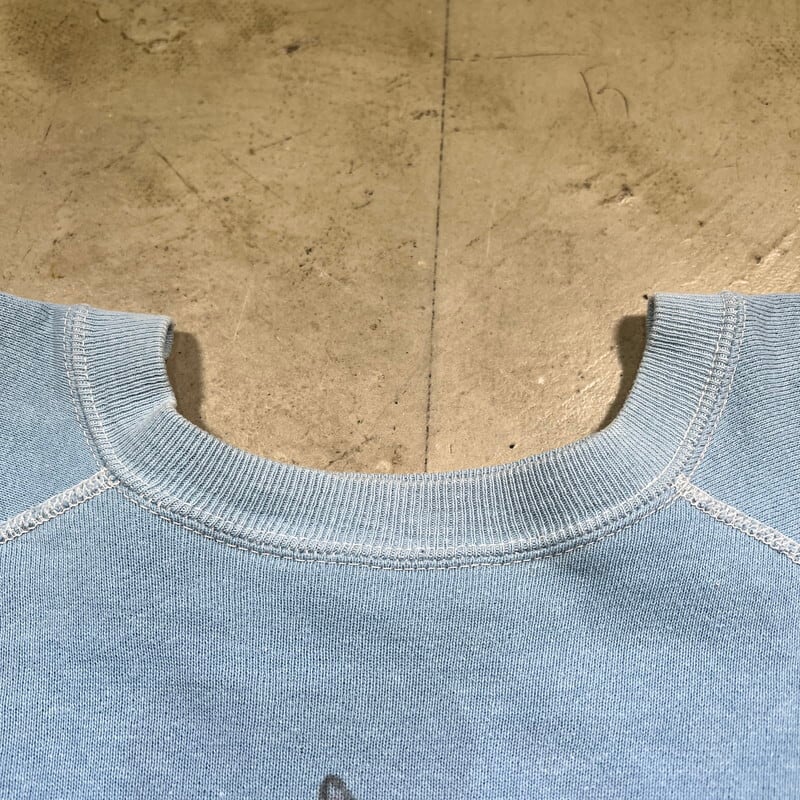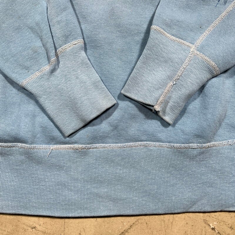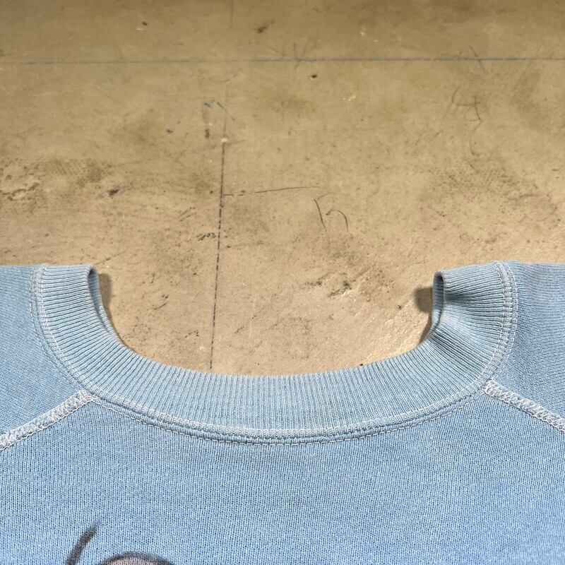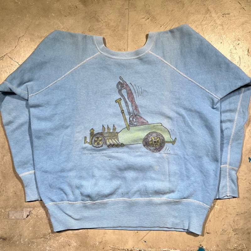 50年代から60年代頃のUnknownラグランスウェットです。タグ欠損の為ブランドは不明です。リブは長めで8cm以上あります。淡いライトブルーボディに、ハンドペイントが施されたスペシャルなアイテムです。フロントには目玉、背面にはモンスターがホットロッドカスタムされたクラシックカーを運転しているデザインが描かれており、なんとも言えない良い味のある画風が魅力的な1着です。薄汚れや擦れ等はございますが、大きなダメージ等無くコンディションは良好です。サイズもこの年代のスウェットでは比較的大き目でL相当です。着丈はスチームアイロンで幾分伸ばせると思います。アメリカのホッドロッドカルチャーがお好きな方は是非いかがでしょうか。同じ物は2つと無いハンドペイント物は大変希少ですので、コレクター必見です。