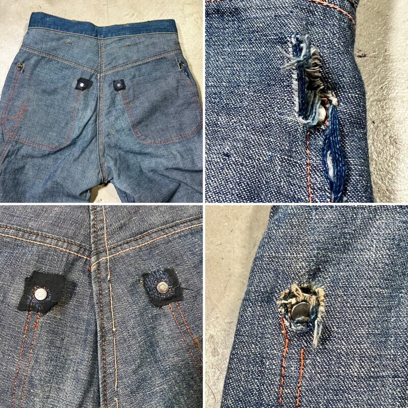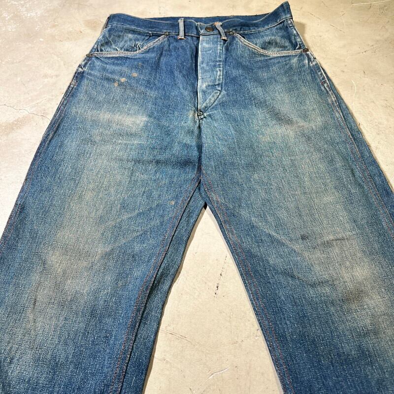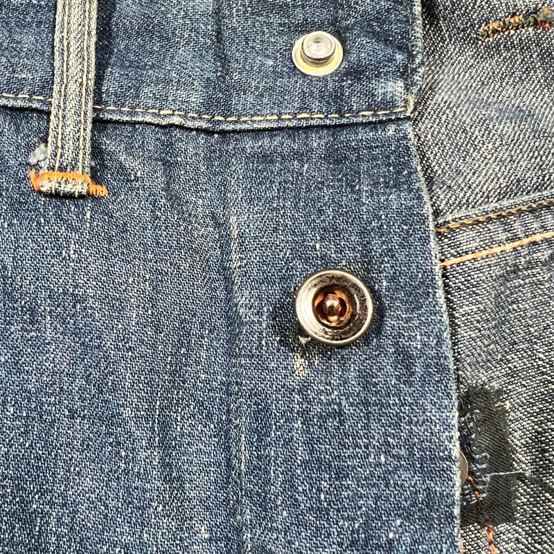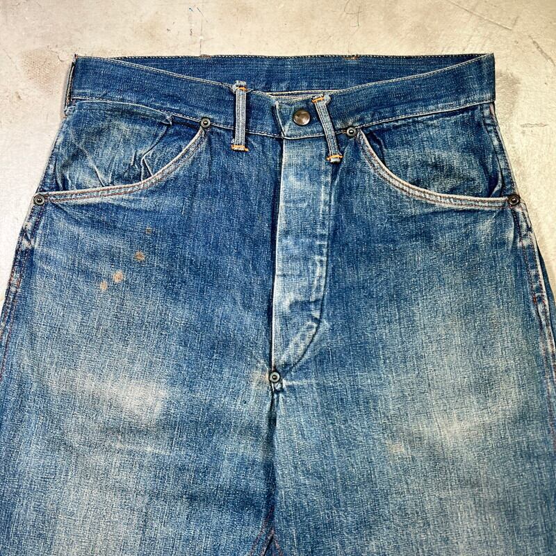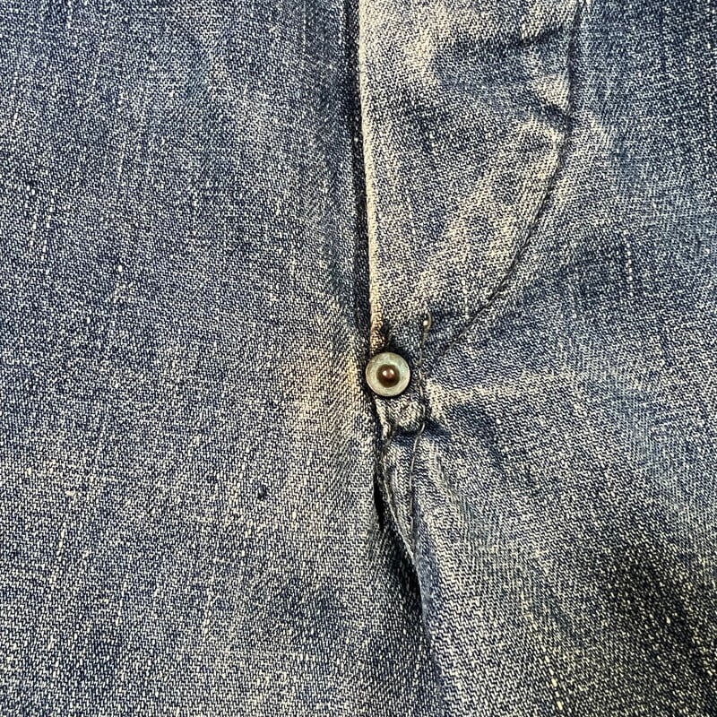40年代頃のUnknwonデニムペインターパンツです。タグは欠損していますので詳細は不明です。トップはストアブランドでも使用されるスナップボタンが使用されています。フライは打ち込みで無刻印のドーナツボタンです。ポケット縁や股にむき出しのUFOリベットが打ち込まれており、サイドはダブルステッチと一目で古い個体だと認識できるディティールです。色残りは4~5割程ですが、メリハリがついたザラっとした色落ちで非常に雰囲気の良いアイテムです。フライボタンの付け根やバックポケットのリベット付近にダメージがあり、一部リペアや簡易的な修繕がございます(バックポケットのリベットは2カ所リペアで交換されています)。裾にも擦れやダメージがございます。生地自体はしっかりとしていますので、リペア屋さんでしっかりとリペアしていただくとより長く着用できます。ウエストは実寸W30インチですので、男女ともに着やすいサイズ感だと思います。フライボタンの裏側には黒ラッカーの塗膜が残っていますので、第二次世界大戦前後の極めて希少な時期のアイテムだと思います。サイズが合う方は是非この機会にいかがでしょうか。