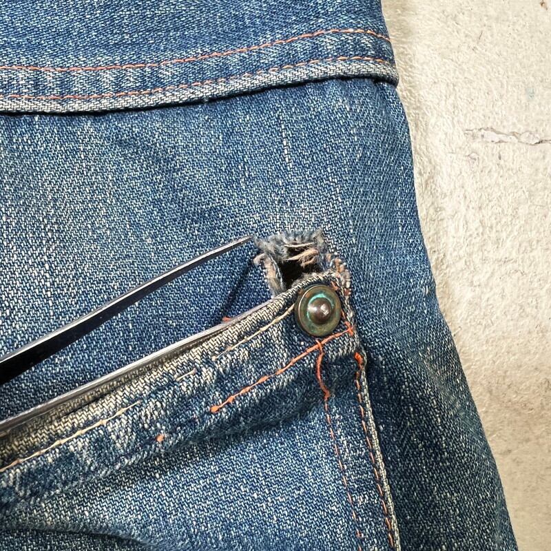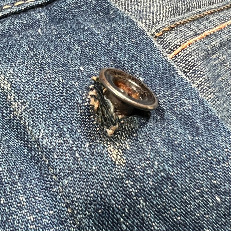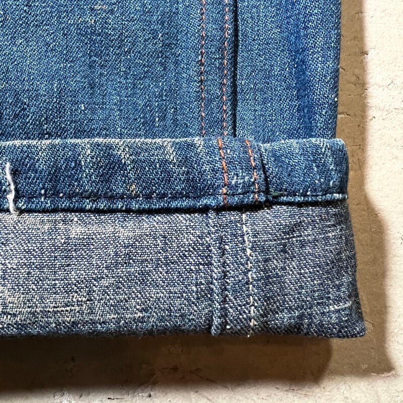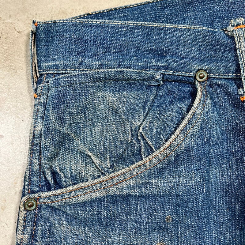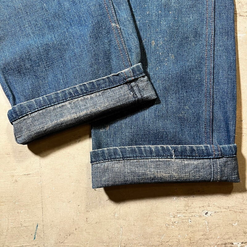 40年代頃のUnknwonデニムペインターパンツです。タグは欠損していますので詳細は不明です。トップはストアブランドでも使用されるスナップボタンが使用されています。フライは打ち込みで無刻印のドーナツボタンです。ポケット縁や股にむき出しのUFOリベットが打ち込まれており、サイドはダブルステッチと一目で古い個体だと認識できるディティールです。色残りは4~5割程ですが、メリハリがついたザラっとした色落ちで非常に雰囲気の良いアイテムです。フライボタンの付け根やバックポケットのリベット付近にダメージがあり、一部リペアや簡易的な修繕がございます(バックポケットのリベットは2カ所リペアで交換されています)。裾にも擦れやダメージがございます。生地自体はしっかりとしていますので、リペア屋さんでしっかりとリペアしていただくとより長く着用できます。ウエストは実寸W30インチですので、男女ともに着やすいサイズ感だと思います。フライボタンの裏側には黒ラッカーの塗膜が残っていますので、第二次世界大戦前後の極めて希少な時期のアイテムだと思います。サイズが合う方は是非この機会にいかがでしょうか。