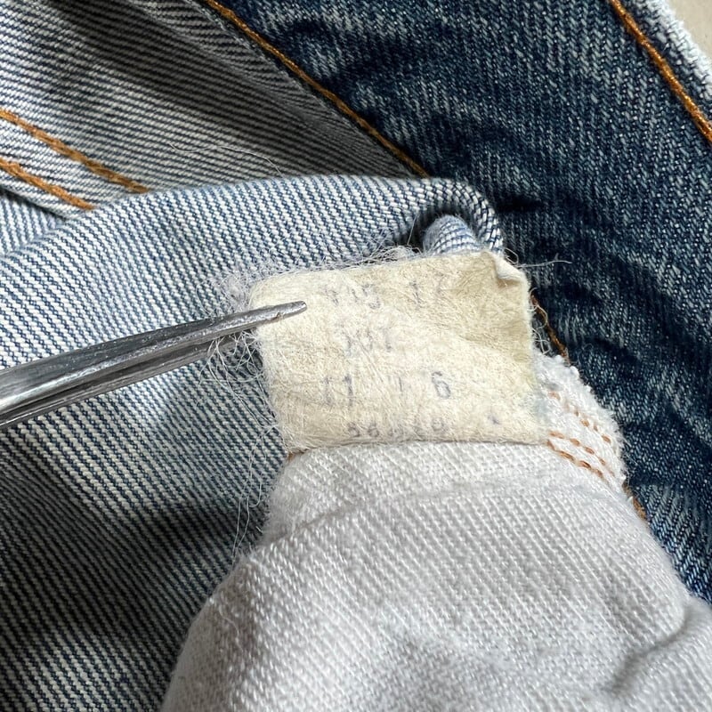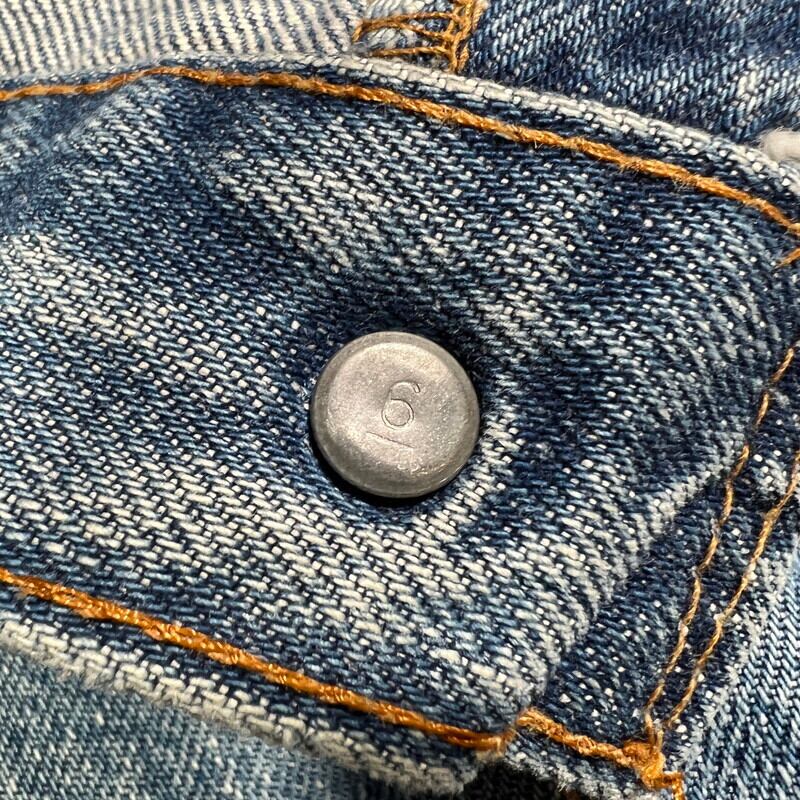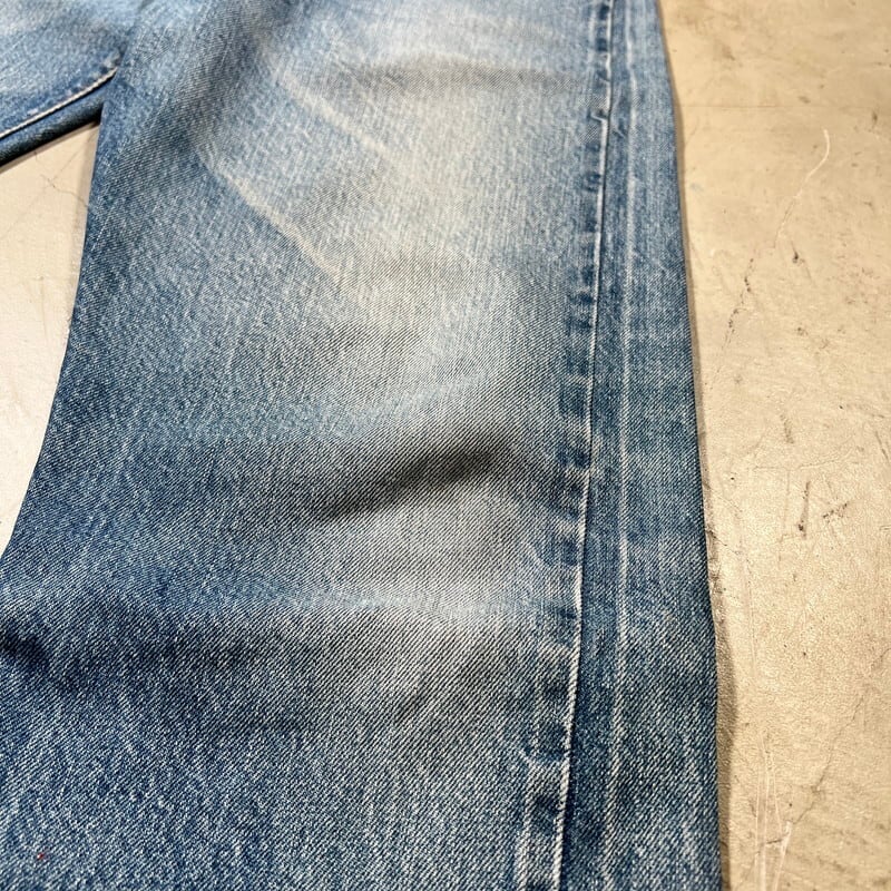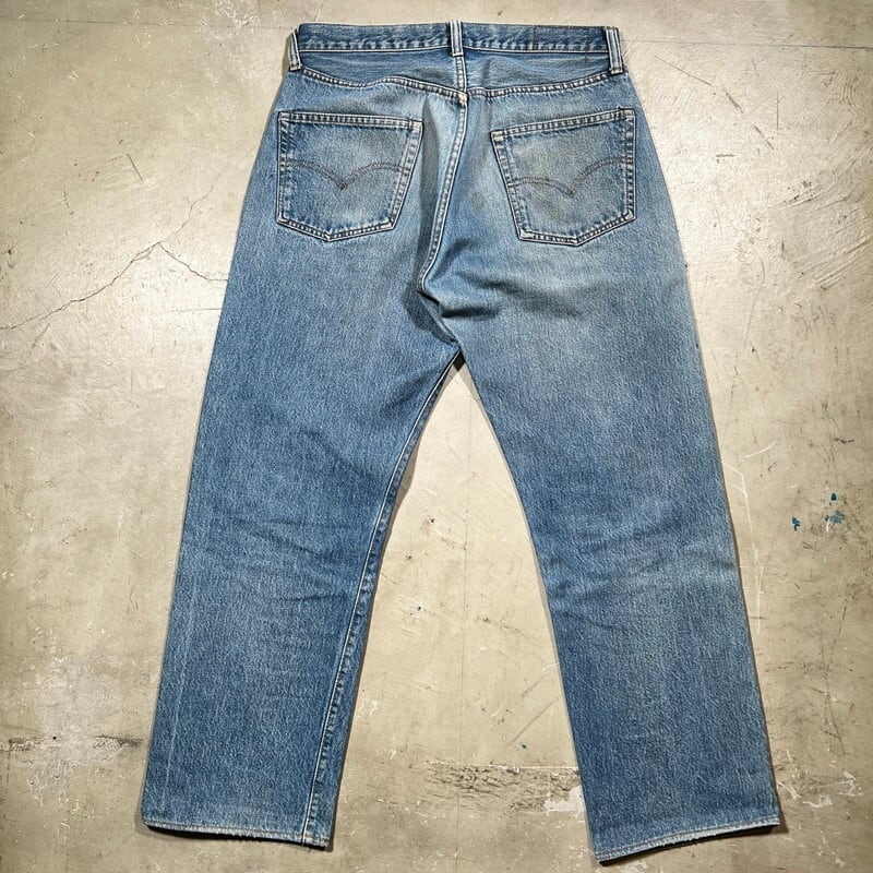 70年代後半のLevi's501 66後期モデルです。トップボタン裏刻印6、ウォッチポケット裏チェーン、セルヴィッジ、アウトシーム裏シングル+チェーン、赤タブ欠損、バックポケット裏チェーン、縮率8%、79年製造。全体に色落ちしておりますが、濃淡がついてヒゲの入り方に雰囲気をかじる1本です。サイドにはセルヴィッジのアタリもしっかりと入ります。レングスシングルで裾上げされています。裾等擦れはございますが、大きなダメージやリペアも無く状態は良好です。表記はW35ですが、かなり縮みが入ったようで実寸はW32~33インチです。これからの季節は無地Tだけで様になります。サイズが合う方は是非いかがでしょうか。色落ちの良い66モデルは今後評価も高くなる一方ですので、お探しだった方は必見です。