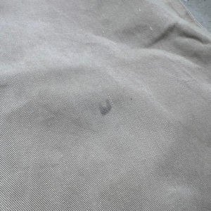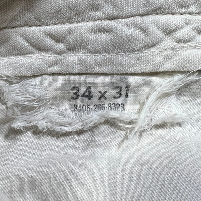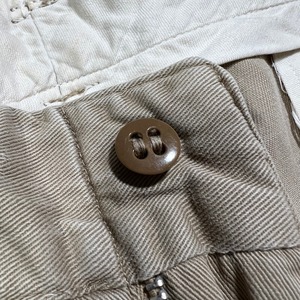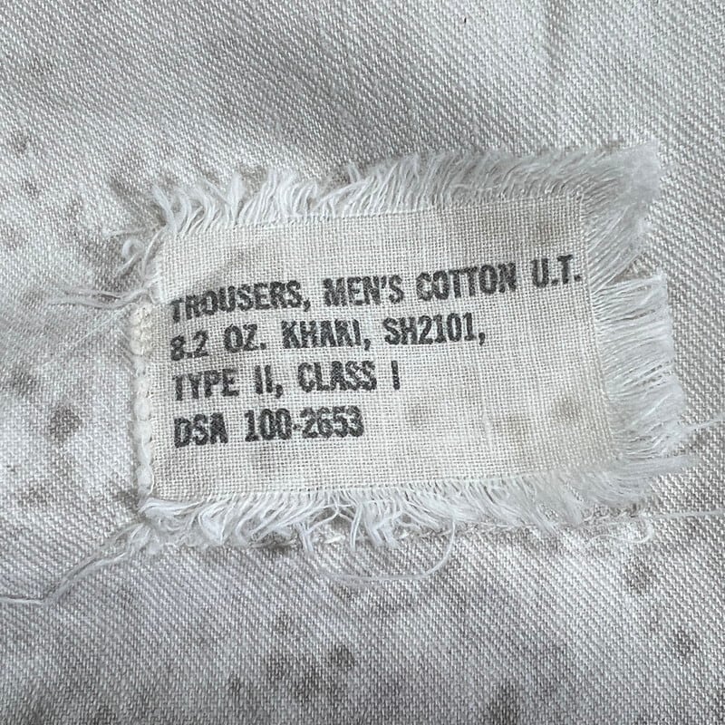 60年代のU.S.MARINE CORPSチノトラウザーズです。ミルスペックはDSA100-2653、コントラクターは不明です。DSAナンバーに年式が入っていませんが、恐らく1966年製造のモデルだと思います。ポケットスレーキ裏のラベルは取れかかっています。尿素ボタンに、フロントはWALDES社のアルミカムロックジッパーが使用されています。サイドのスラッシュポケットはアウトシームに沿って真っすぐの縫製です。バックポケットにフラップが付く仕様です。ミリタリーチノらしくゆったりしたストレートシルエットで、このシルエットがお好きな方も多いのでは無いでしょうか。全体的に使用感があり、薄いシミや擦れなドございます。大きなダメージやリペア等はございませんが恐らく裾直しされています。これからの季節は半袖スウェットとデニムジャケットを合わせたがっつりアメカジスタイルがオススメです。ウエスト表記はW34ですが、実寸はW33インチ位です。需要の高いサイズだと思いますのでお探しだった方は是非この機会にいかがでしょうか。