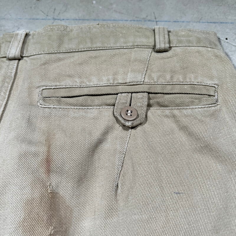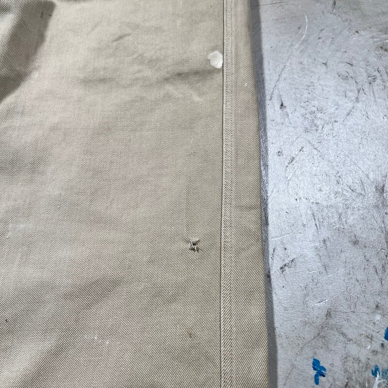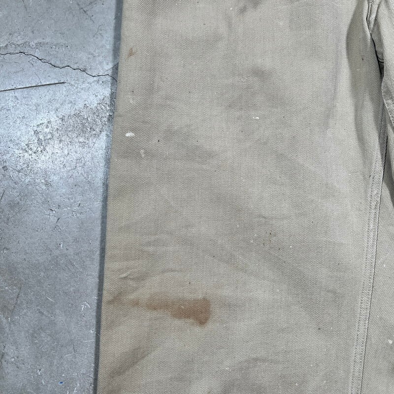 50年代頃のフランス軍M52チノトラウザーズです。バックポケットにフラップが付かずループでボタンを留める前期型です。フロントは2タック仕様です。後期型に比べると生地が少し柔らかい印象です。ベルトループはかなり細いタイプですので、2~2.5cm幅のベルトをご使用ください。全体的にしようかんがあり、薄汚れや擦れ、背面等に小穴がいくつかございます。簡単なリペアで長く着用していただけると思います。フロントトップのボタンが付け直しされています(恐らくウエスト拡張目的だと思われます)。内側にもボタンがありますが、内側のボタンも留めるとW28インチ、内側は外した状態ですとW29インチ相当です。ゆったりとした大き目なサイズは翌見かけますが、このサイズ感はあまり見かけないのでは無いでしょうか。細な男性や女性にお勧めです。バックポケットに付くフラップ付きの後期型に比べると格段に流通量も少なく探されていた方も多いのでは無いでしょうか。この小さめなサイズもなかなか見つからないと思いますので、サイズが合う方は是非この機会にいかがでしょうか。