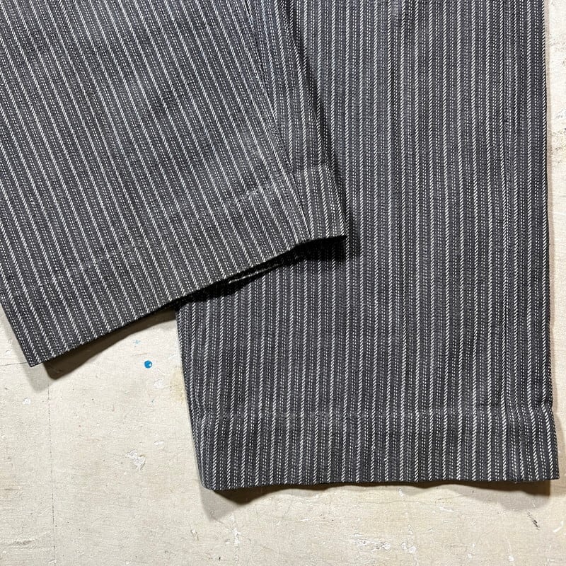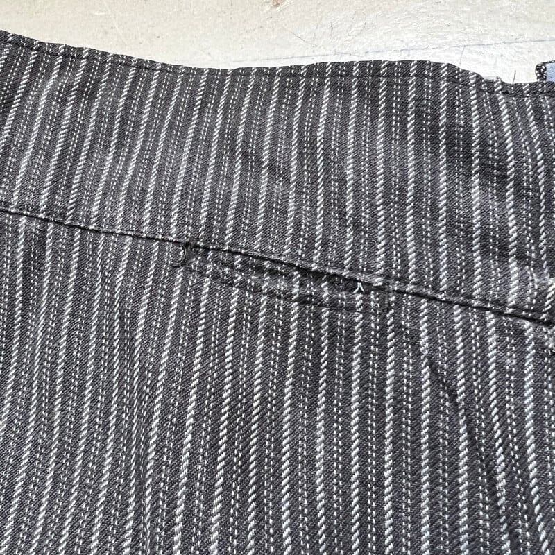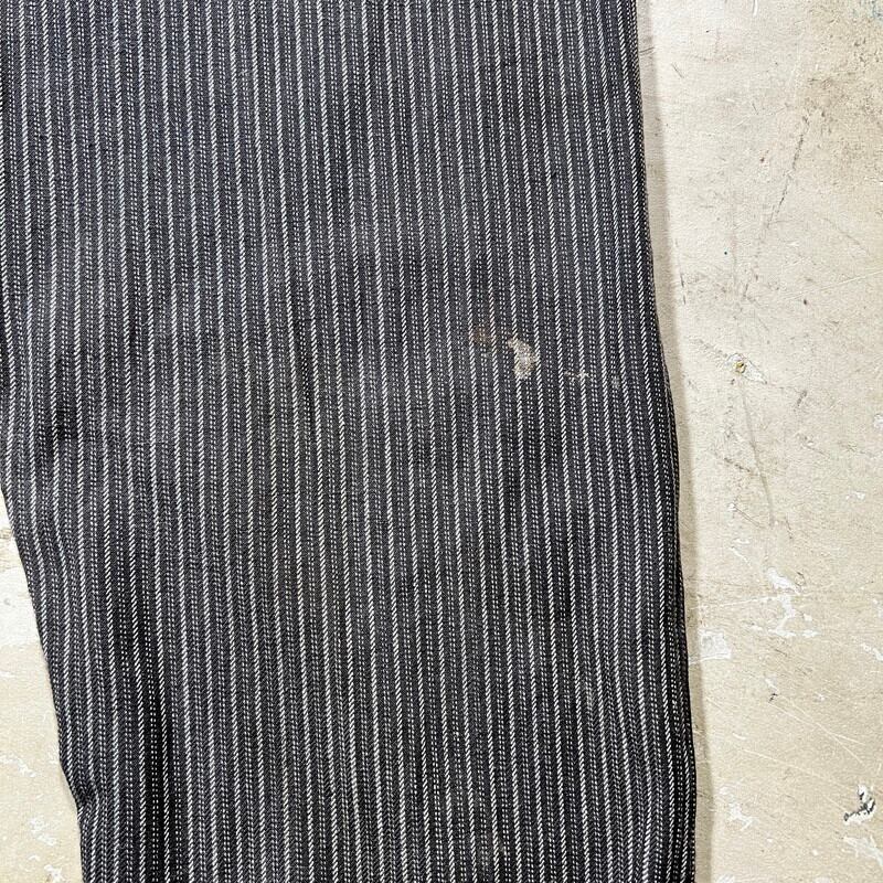 30年代から40年代頃のフレンチワークパンツです。古い年代のワークパンツやファーマーパンツで見られる黒とグレーのマルチストライプ柄です。シンチバックにPARISの刻印が有ります。元々サスペンダーボタンが付いていたかは定かでありませんが、ボタンが縫われていた形跡は見当たりません。後付けでボタンを取り付けてみても良いですし、背面のシンチバックのみで調整してシンプルに着用してもカッコ良いと思います。背面のシンチバック下に小さなダメージが見られます。薄汚れはございますが、その他大きなダメージ等無く状態は良好です。レングスは4cmほど伸ばせると思います。ゆったりとしたストレートで緩くテーパードが入りますので、シルエットが綺麗です。バンドカラーの白シャツを合わせて懐古的ユーロワークスタイルを楽しまれてはいかがでしょうか。ウエストは最大W36インチ程で、シンチバックでW32インチ位まで絞れます。かなり良いサイズ感ですので、お探しだった方はこの機会に是非。