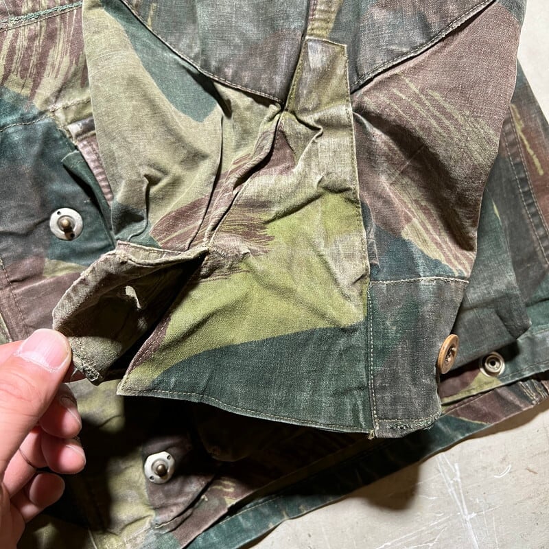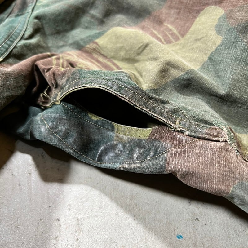 50年代頃のベルギー軍デニソンスモックジャケットです。元はプルオーバーのスモックタイプですが、着用しづらかったのか当時にカスタムが施されたアイテムです。フロントはOPTIジッパーが取り付けられています。各フロントポケットにはボタンが2段で配置されマチの広がりに応じて留め替える事が出来ます。脇下には切り込みがあり、所謂ベンチレーションの役目をしています。ラグビーボール位はありそうな大きなエルボーパッチがございます。股を通して上衣を固定する為のビーバーテールが備わっています。フロントで3段階調節できる仕様です。タグが欠損していますが、内側に掛かれた数字通りのサイズで、L相当だと思います。所々に擦れや小穴リペア跡などございますが、生地はしっかりとしています。ベルギー軍のブラッシュカモのアイテムは非常に人気も高くなりましたが、パンツに比べジャケットは非常に少ないので、お探しだった方は是非いかがでしょうか。このサイズ以外にもいくつか在庫がございますので、気になる方はお気軽にお問い合わせください。
